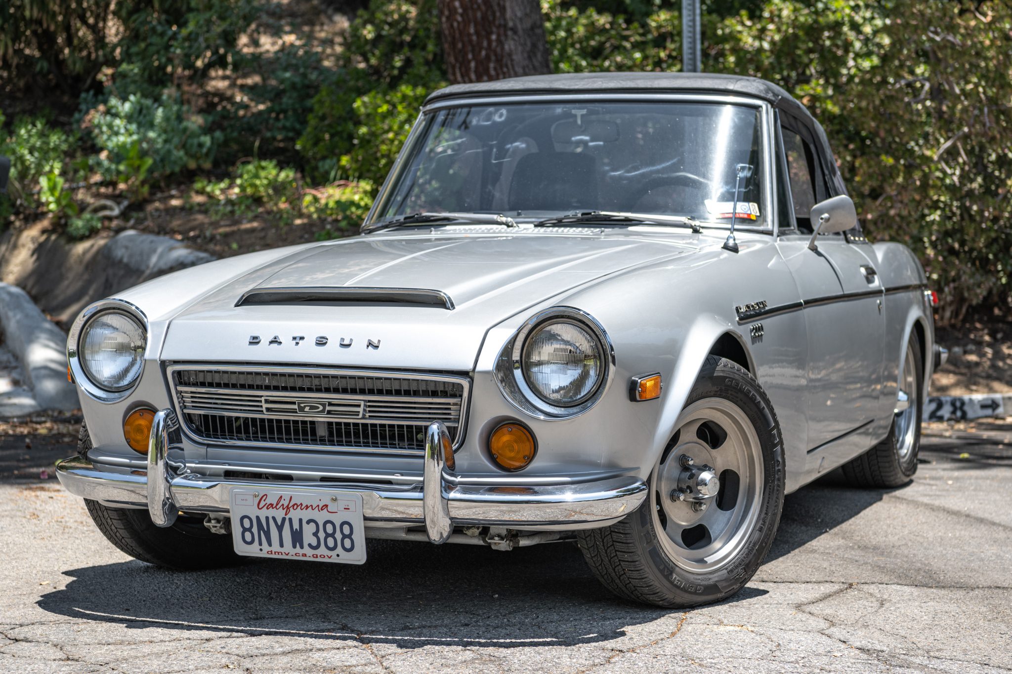Silver 14″ five-slot mag wheels are mounted with 185/60 General Altimax RT43 tires that show 2017 date codes. The car has been fitted with a 7/8″ sway bar and Bilstein front shocks, and additional work during the refresh included replacing the front ball joints, front springs and shock mounts, and bushings. The front disc and rear drum brakes were serviced, an alignment was performed, and the brake fluid was changed. The seller states that the removed wheels and hubcaps will accompany the car.