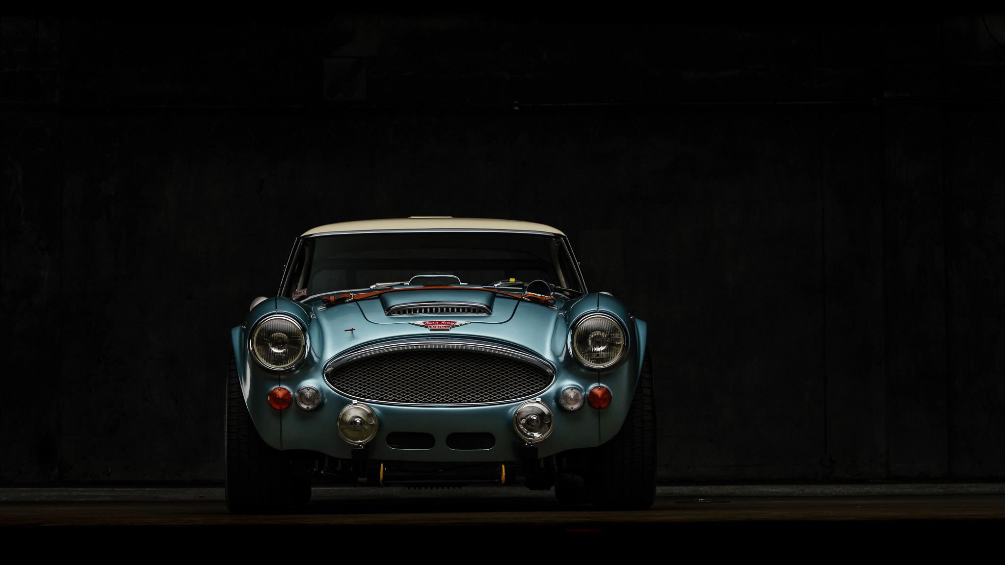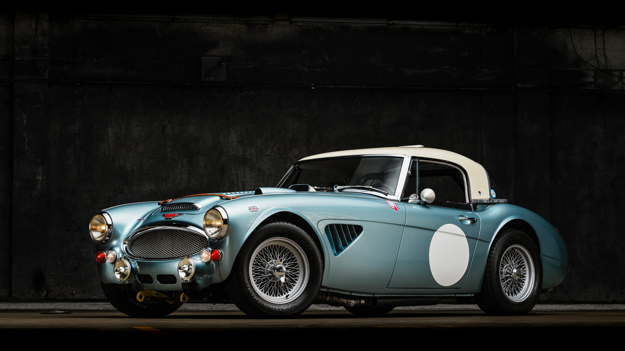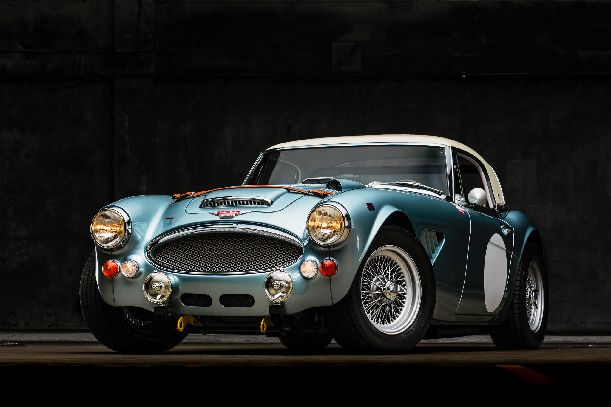 The factory-style hardtop is finished in white and features a rally vent and cloisonné badges. The soft top has been deleted, and additional equipment includes a Works Sebring-style grille configuration and carburetor access panel, a custom quick-fill fuel cap, a remote hood release, 7″ Lucas driving lights, custom tow mounts, a leather hood tie-down, and custom bullet-style mirrors. A chip on the edge of the hardtop is shown up-close in the gallery below.