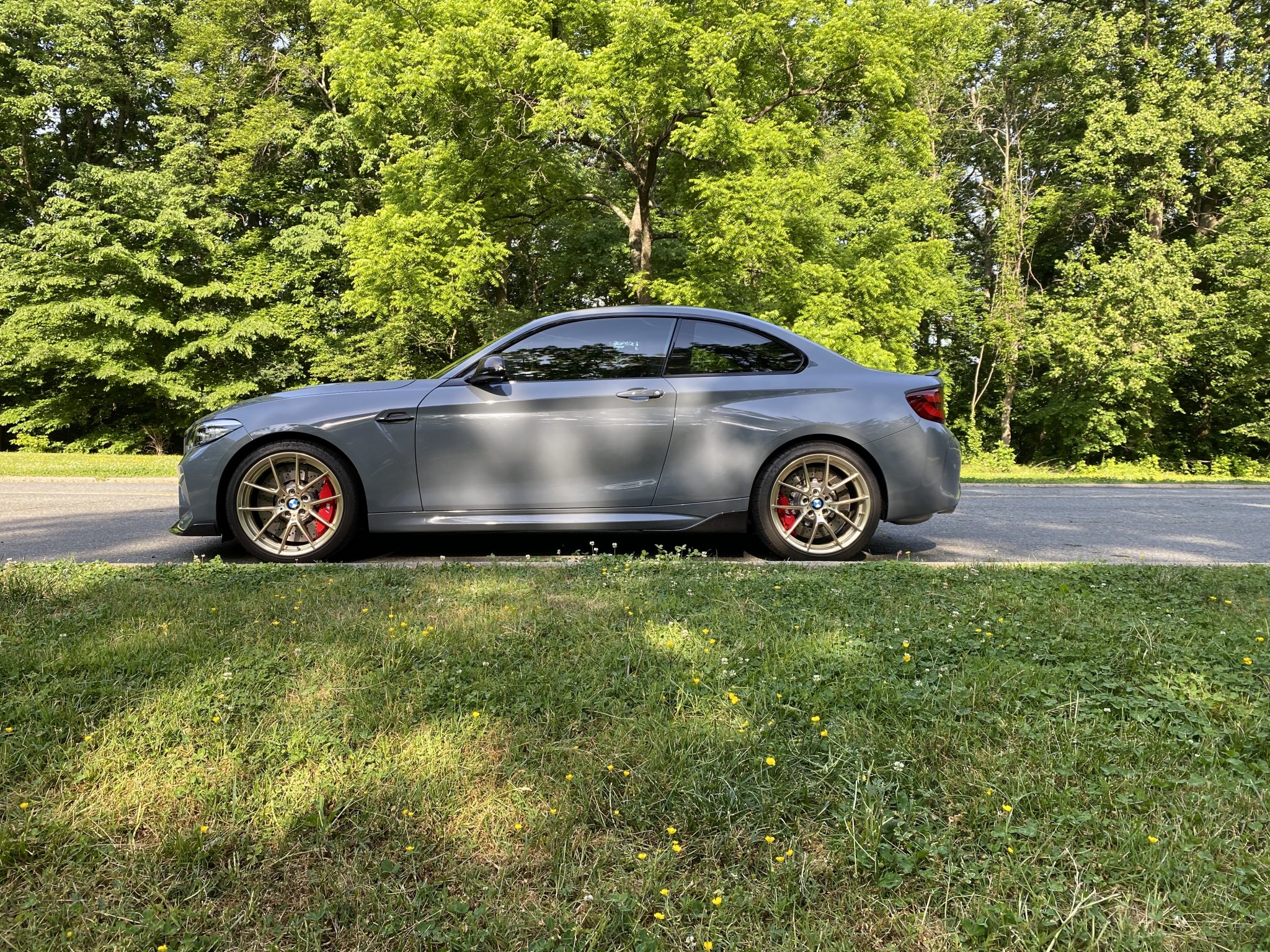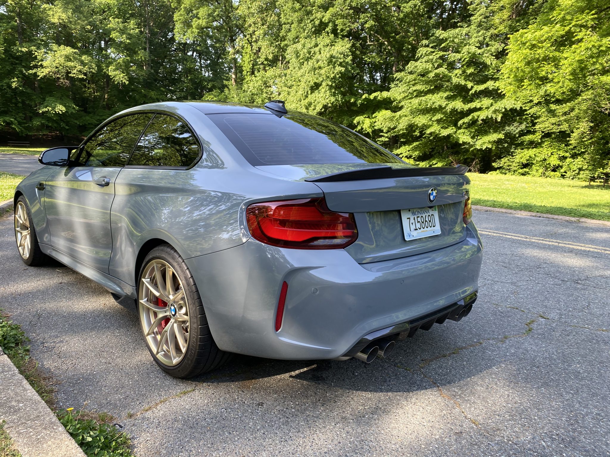 Light Alloy Gold 19″ wheels are wrapped in 245/35 and 265/35 Michelin Pilot Super Sport tires that show date codes from 2020. The car is equipped with an Adaptive M Suspension and red-painted M-branded brake calipers fitted over drilled rotors at each corner.