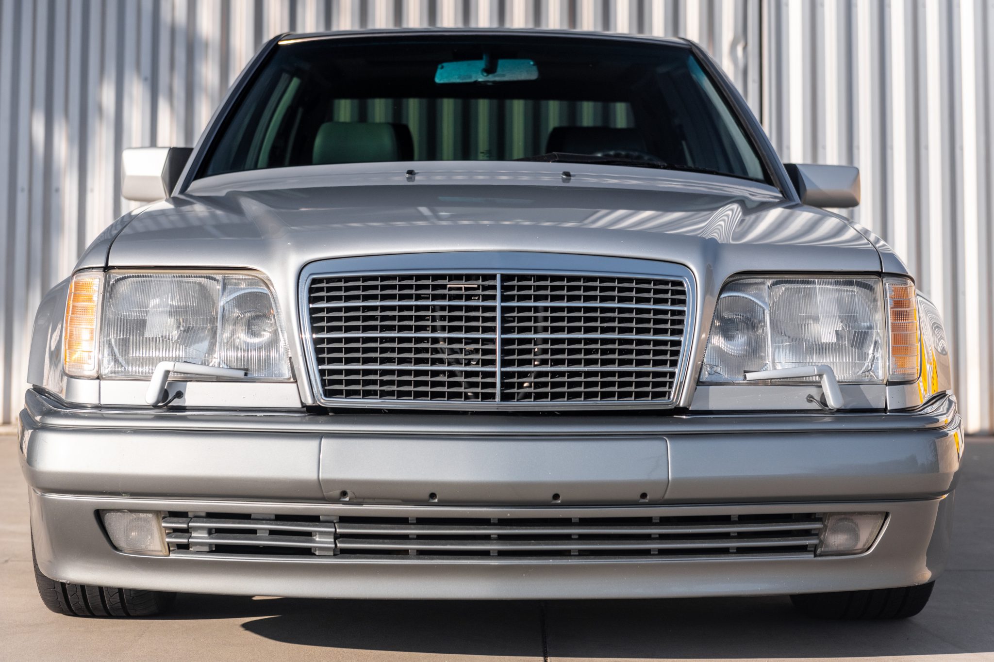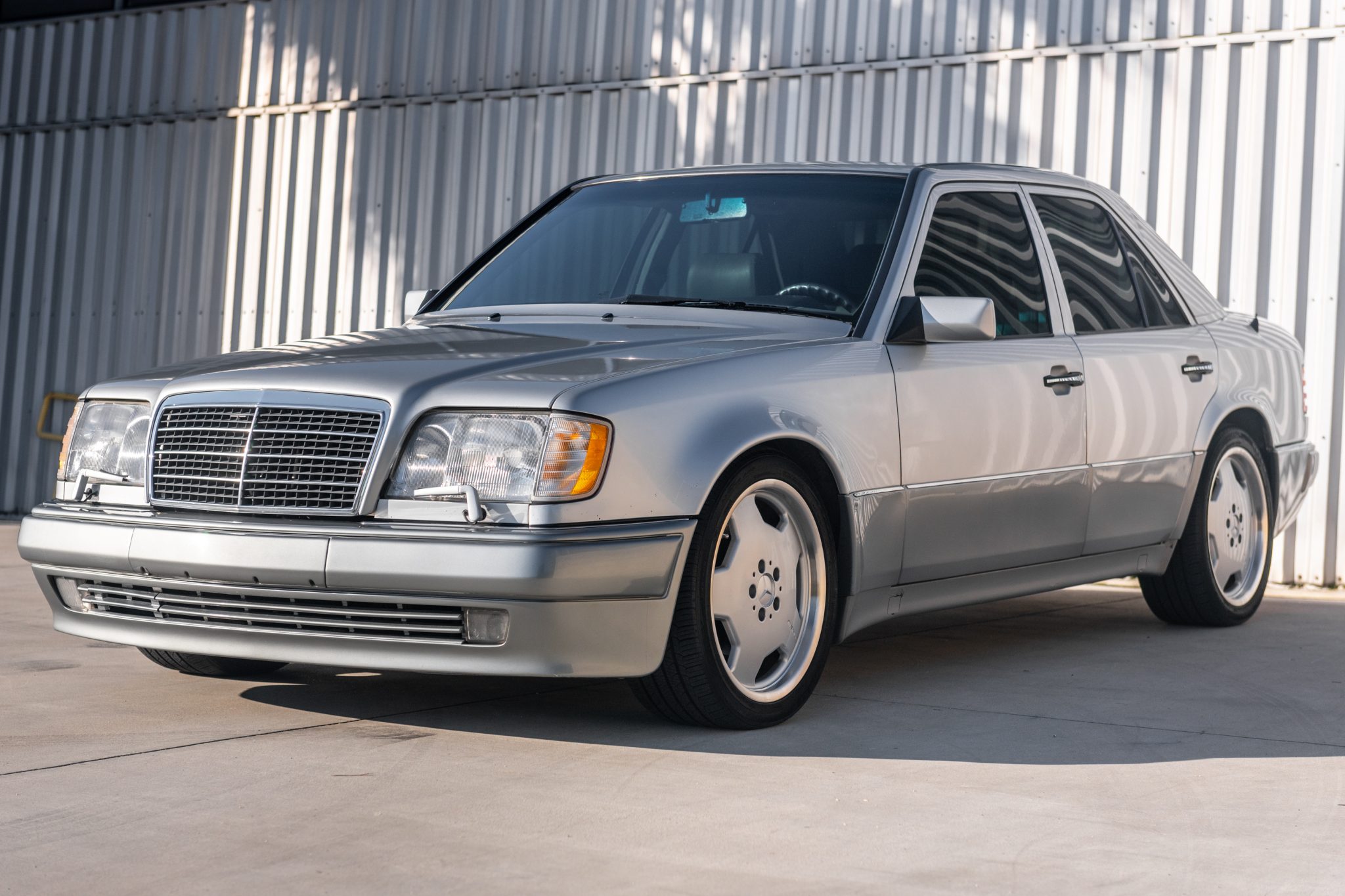 AMG Monoblock 18″ wheels are wrapped in Nexen tires measuring 245/40 all around. Distinguishing features of the 500E compared with other W124 models included a wider track width, flared fender arches, larger four-wheel disc brakes, and a revised front air dam.