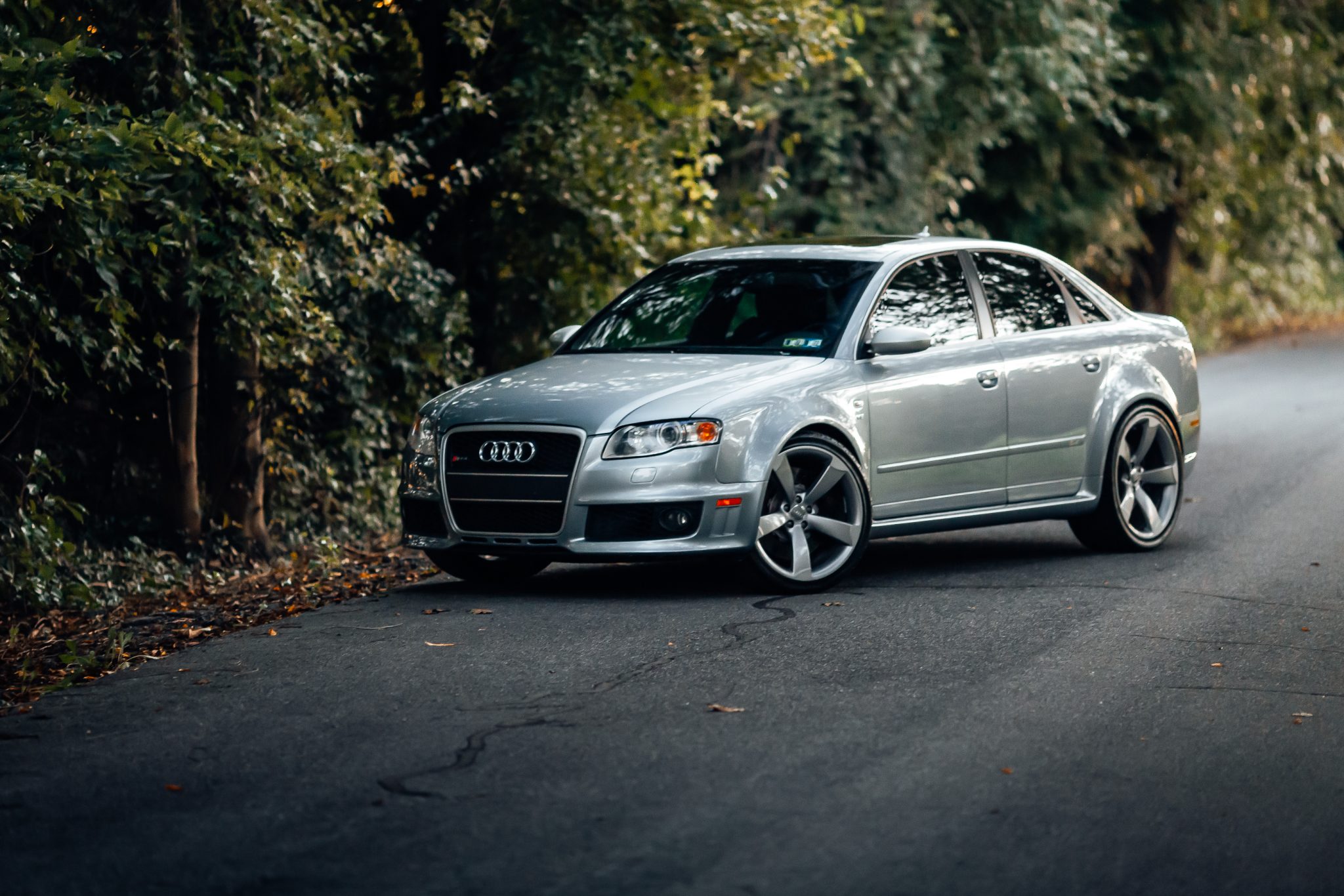 20″ five-spoke wheels sourced from an S6 have been added and are wrapped in Hankook Ventus S1 evo2 tires. Previously fitted KW coilovers were removed by the selling dealer and replaced with Audi Dynamic Ride Control shocks sourced from Audi. A KW sway bar is installed, and braking is handled by RS-branded front calipers and cross-drilled rotors at all four corners.