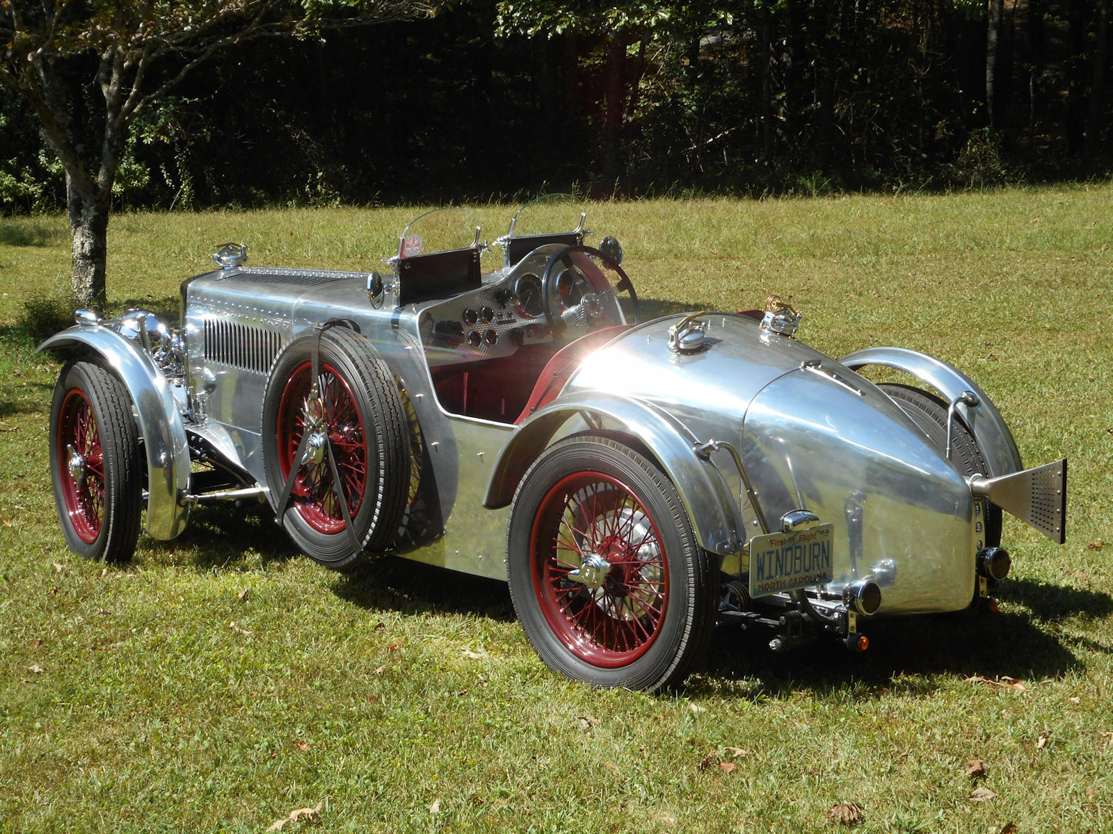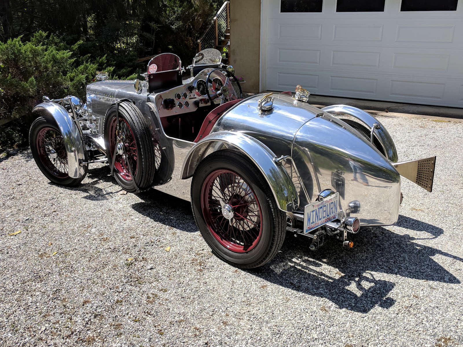 Maroon-painted 19″ wire wheels feature winged knock-offs and wear Ensign tires showing 2017 date codes. A matching spare is strapped to the left side of the body with a custom leather harness. The axles have been overhauled, and replacement friction shocks are fitted front and rear. Braking is from four-wheel Alfin drums.