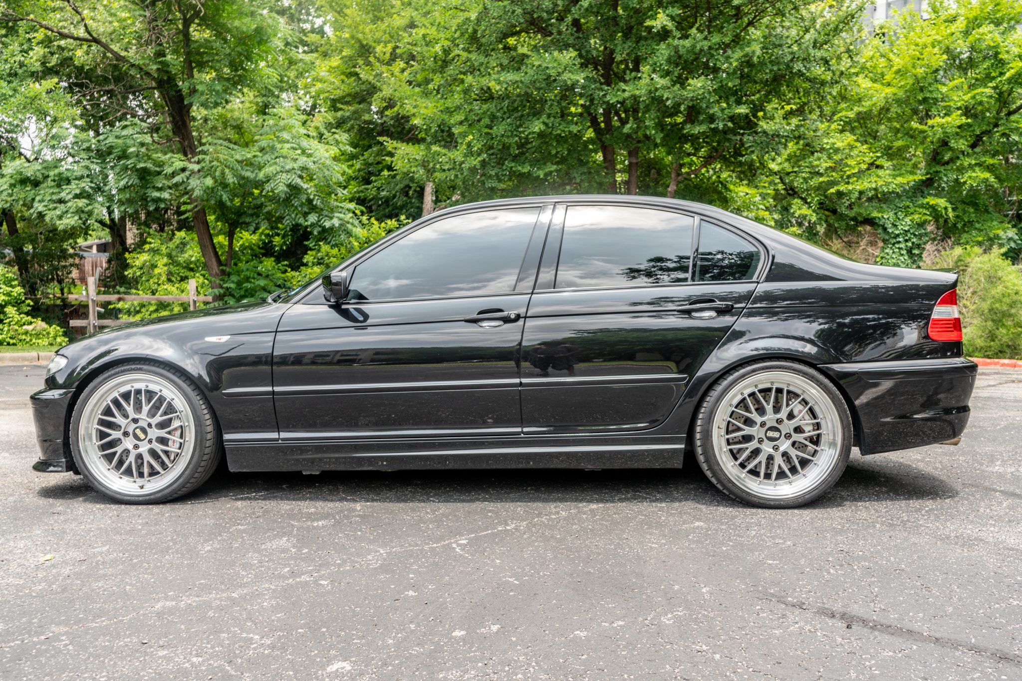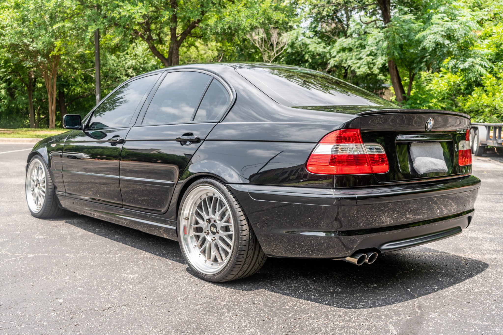 Silver-finished 19” BBS LM wheels with polished lips wear Hankook Ventus V12 Evo2 tires measuring 235/35 up front and 265/30 out back. ZHP package equipment included M Sport suspension and a revised steering rack when compared with the standard E46 sedan. A Brembo big brake kit was installed under prior ownership, and the seller states that he has replaced the front brake pads.