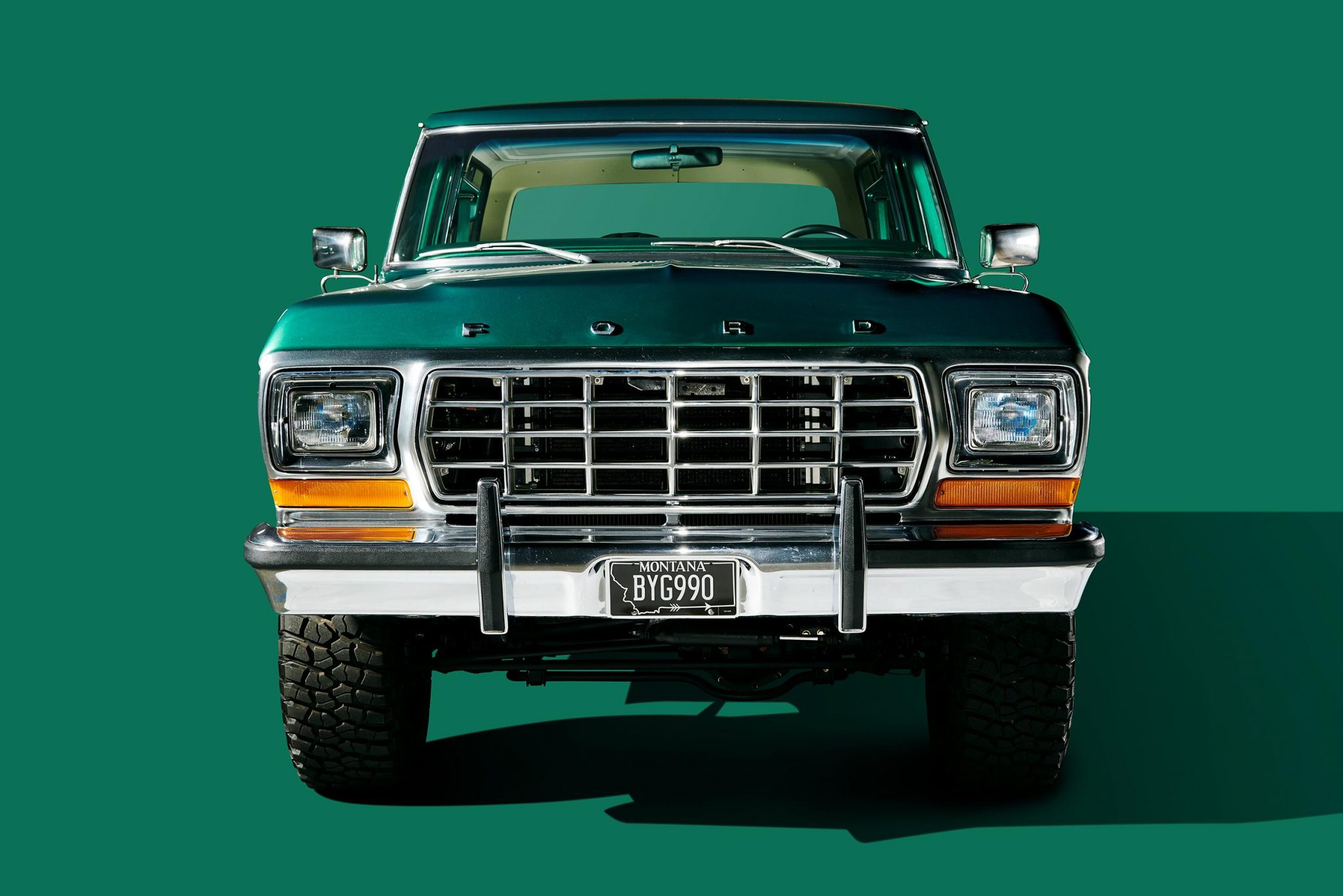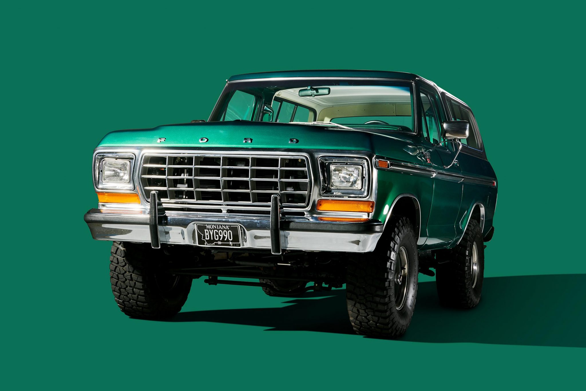 Gray-painted 15″ wheels are mounted with 33×12.5″ BFGoodrich Mud-Terrain T/A tires. A matching spare wheel is mounted on a swing-away carrier out back. The frame was disassembled and powder-coated during the refurbishment, and Fox shocks were installed. Braking is handled by Wilwood discs at all four corners.