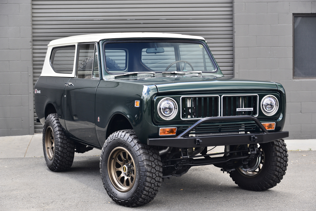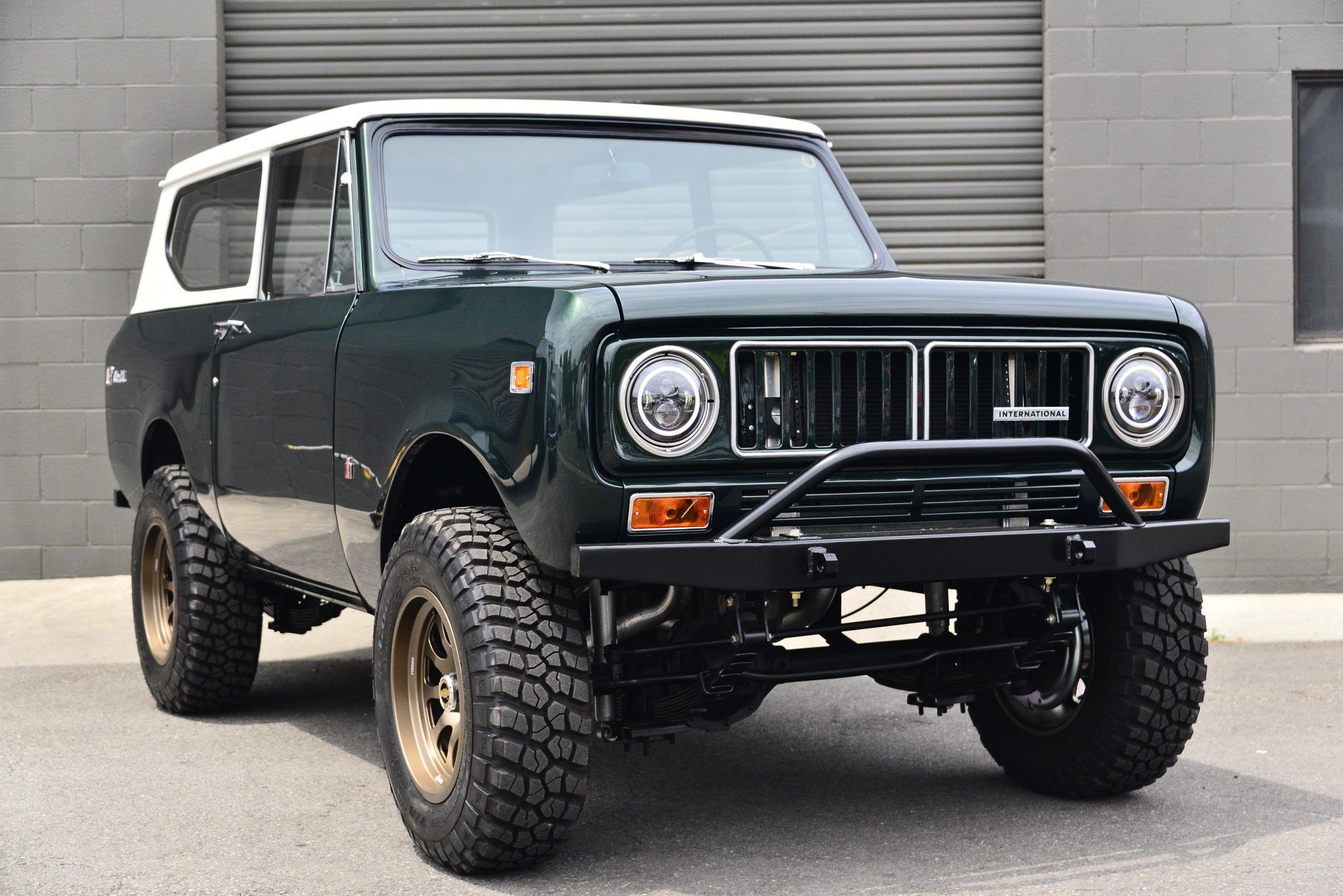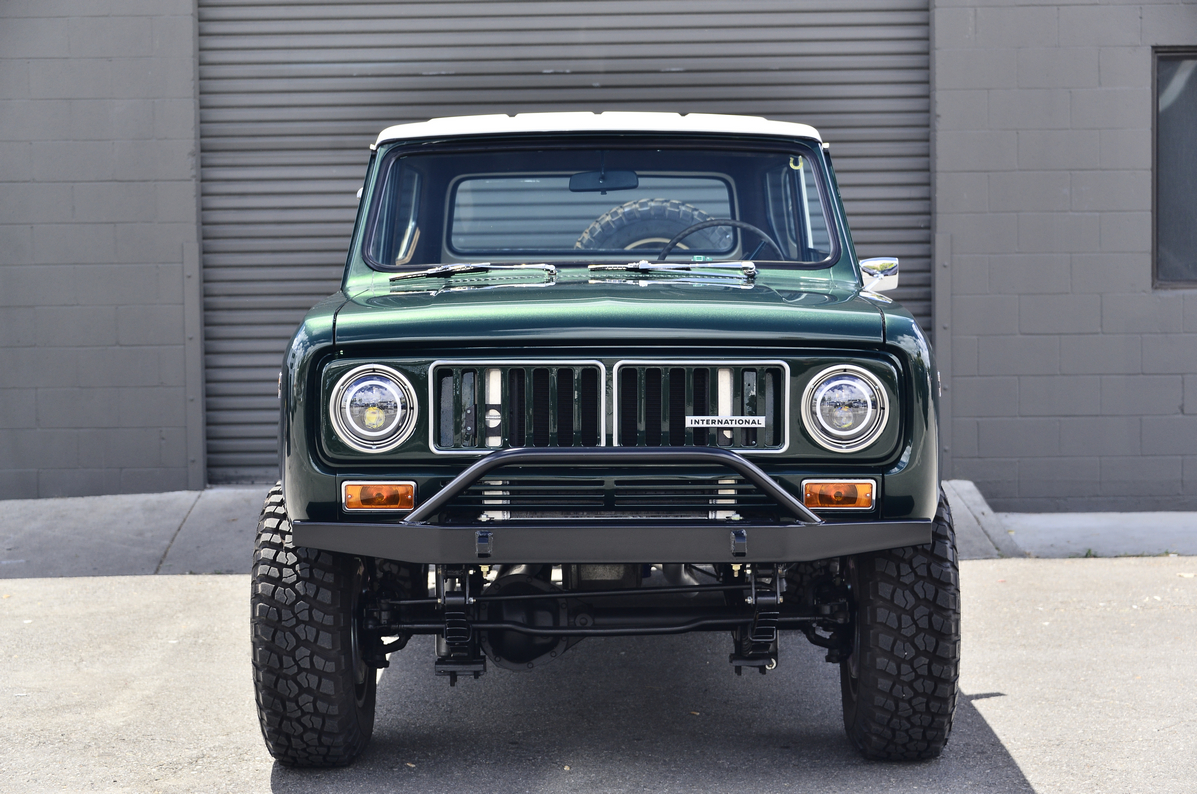Forged 17×8.5” Titan 7 T-AK1 wheels are finished in Techna Bronze and wrapped in 255/75 BFGoodrich Mud Terrain T/A KM2 tires, as is the matching spare. Manually locking Warn hubs have been fitted up front. Front disc and rear drum brake features hydroboost power assistance that utilizes hydraulic pressure from the aftermarket power steering system. The truck has been lifted 2” using Rough Country leaf springs and Belltech shock absorbers.