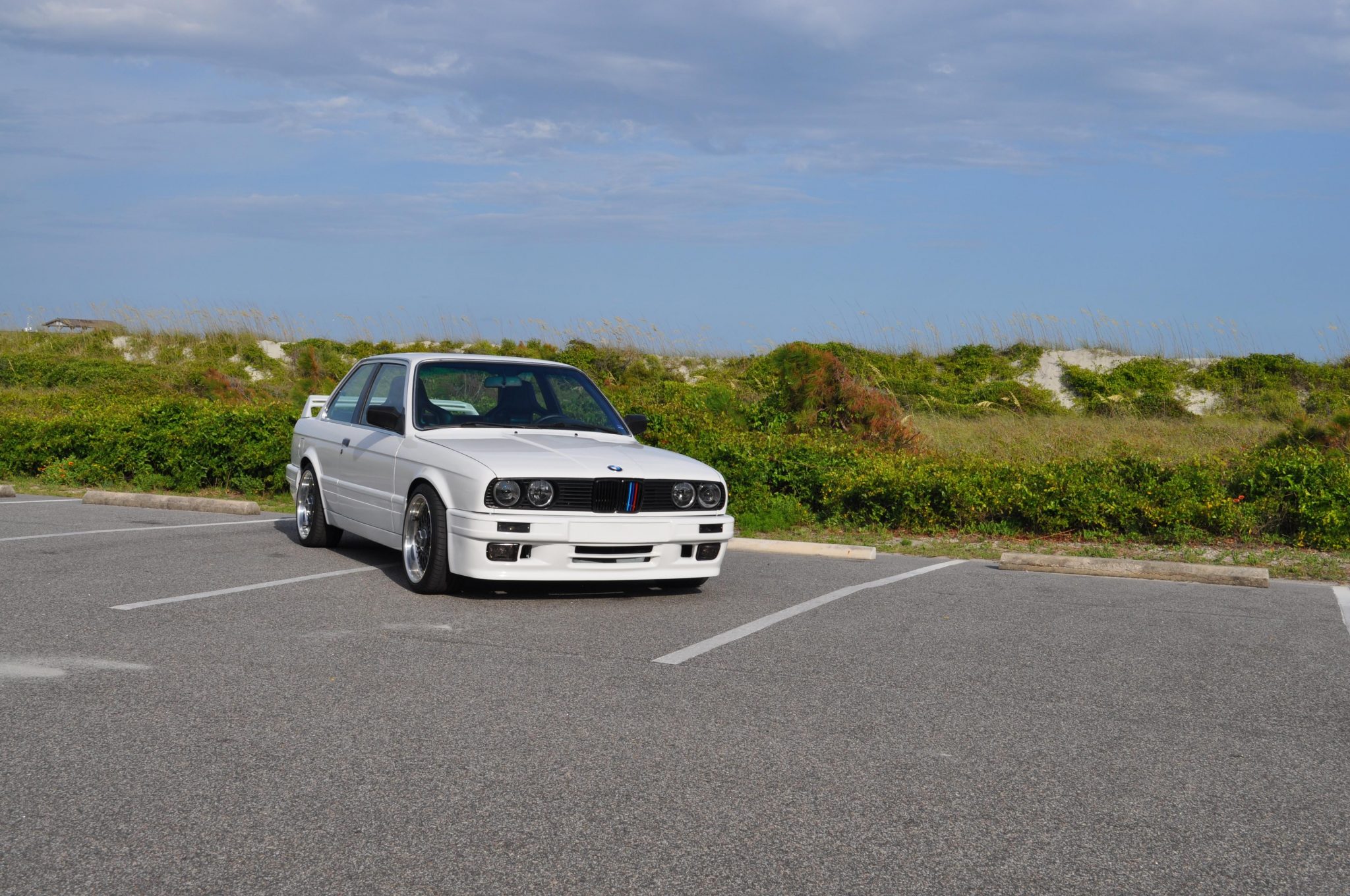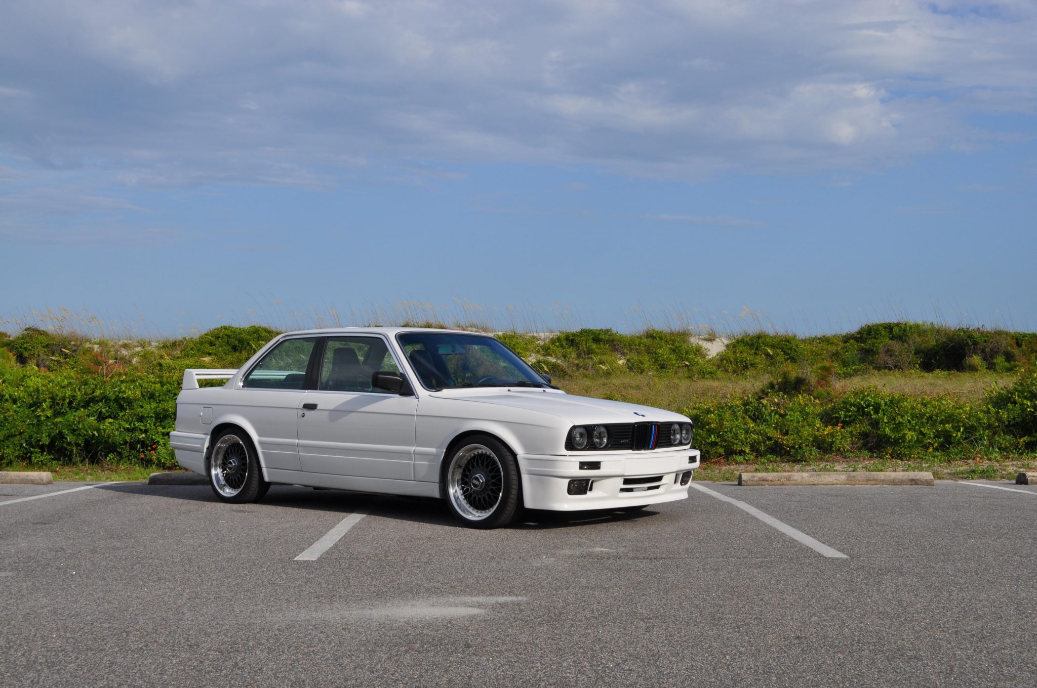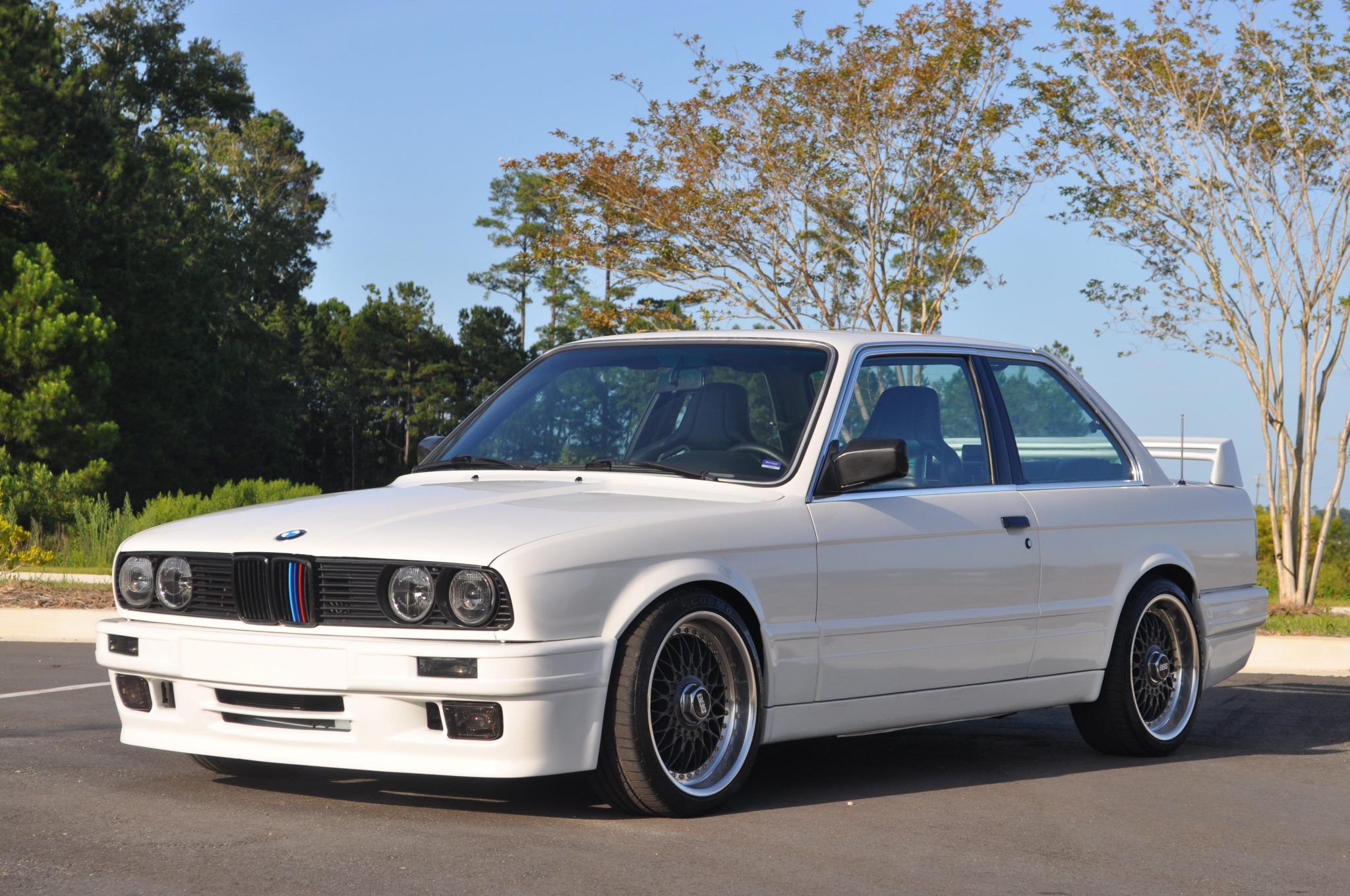 Black-finished 17” BBS basketweave wheels are wrapped in Cosmo MuchoMacho tires. The car is reportedly fitted with five-lug hubs and brakes sourced from an E46 330 as well as an aftermarket front anti-sway bar, H&R springs, Bilstein shocks, and replacement inner and outer tie rods and control arm bushings.