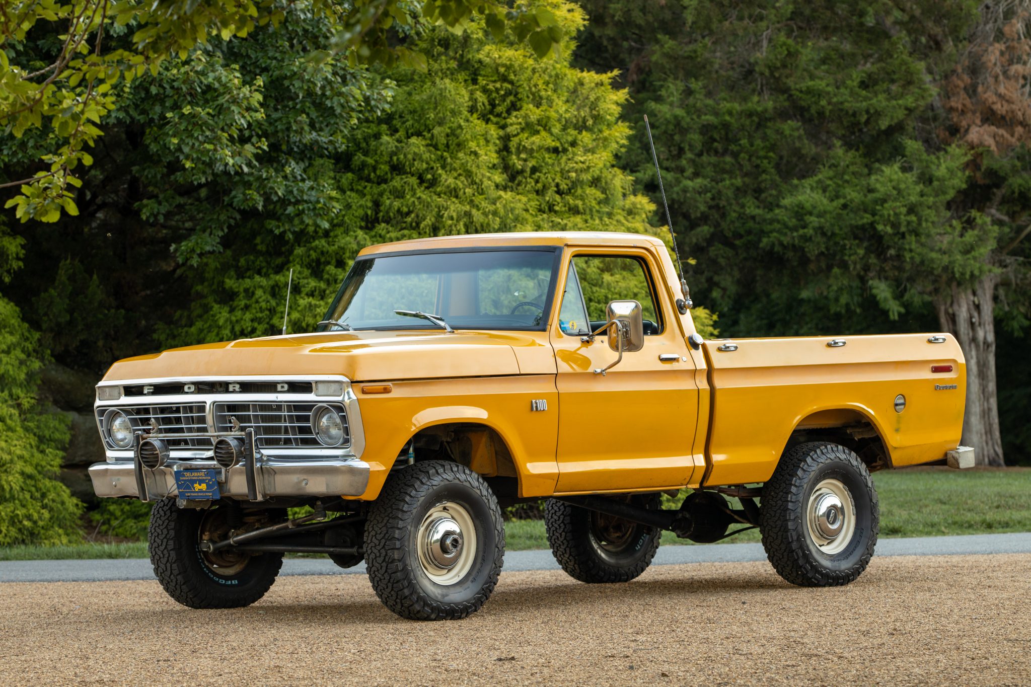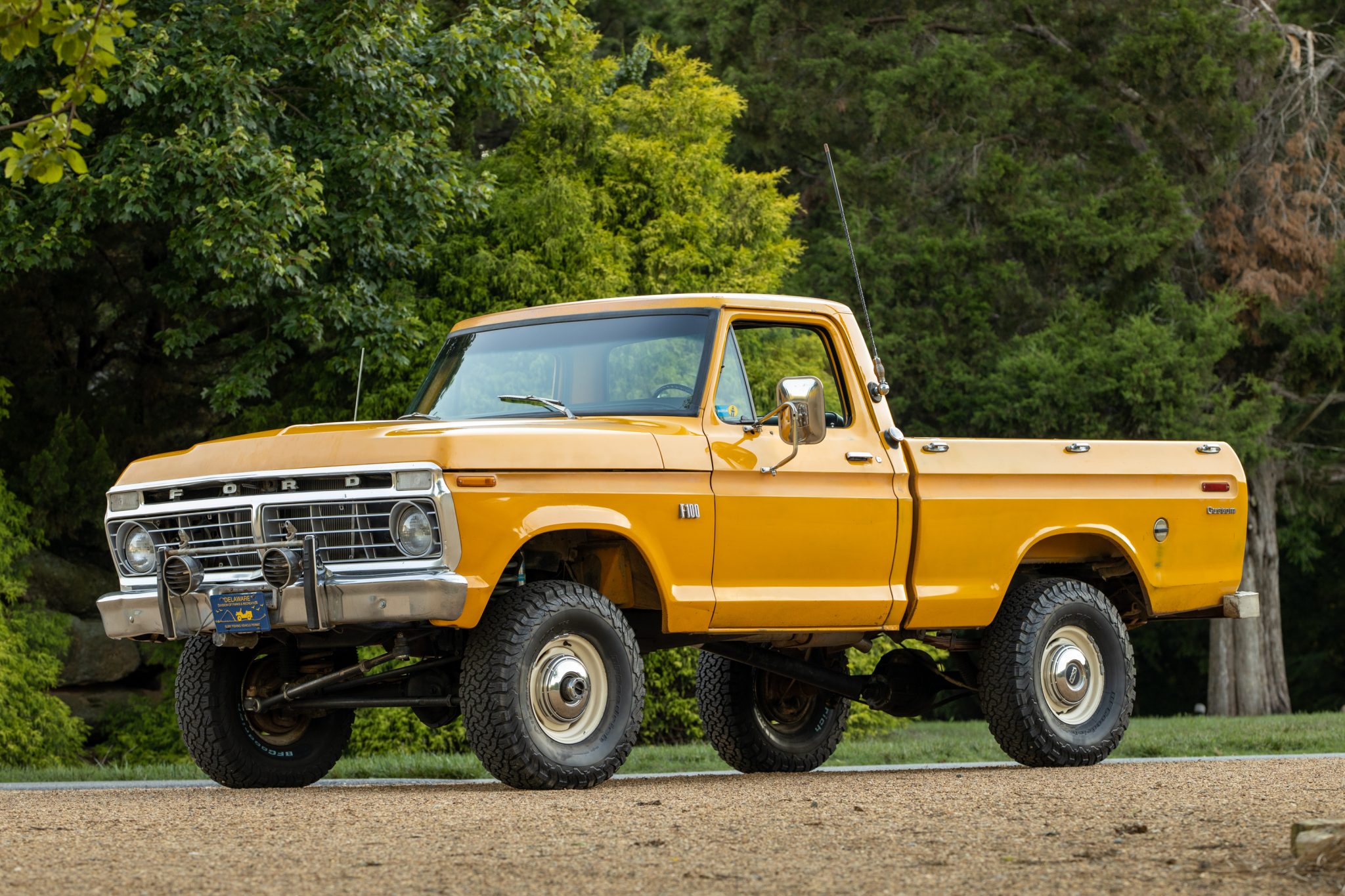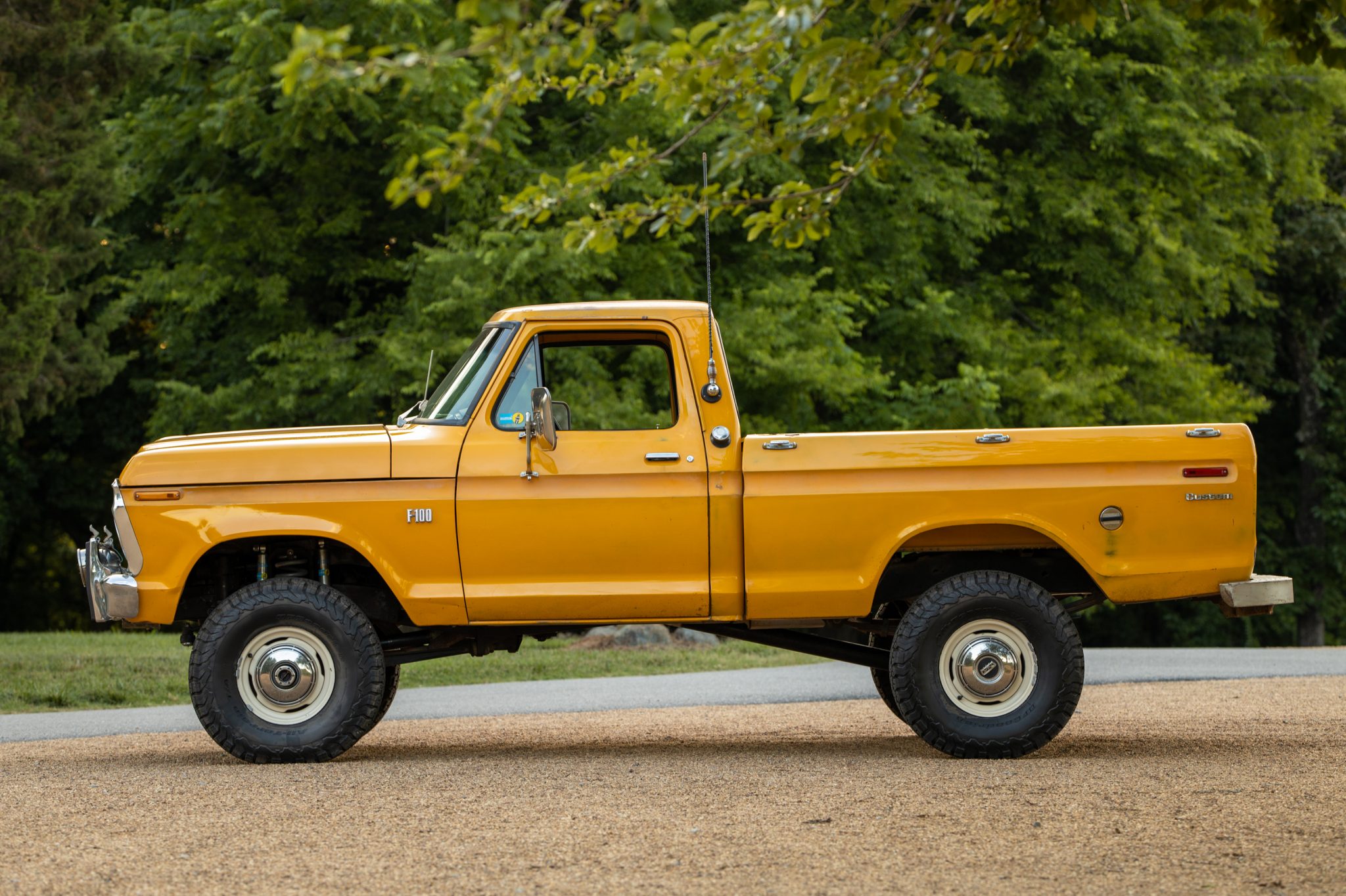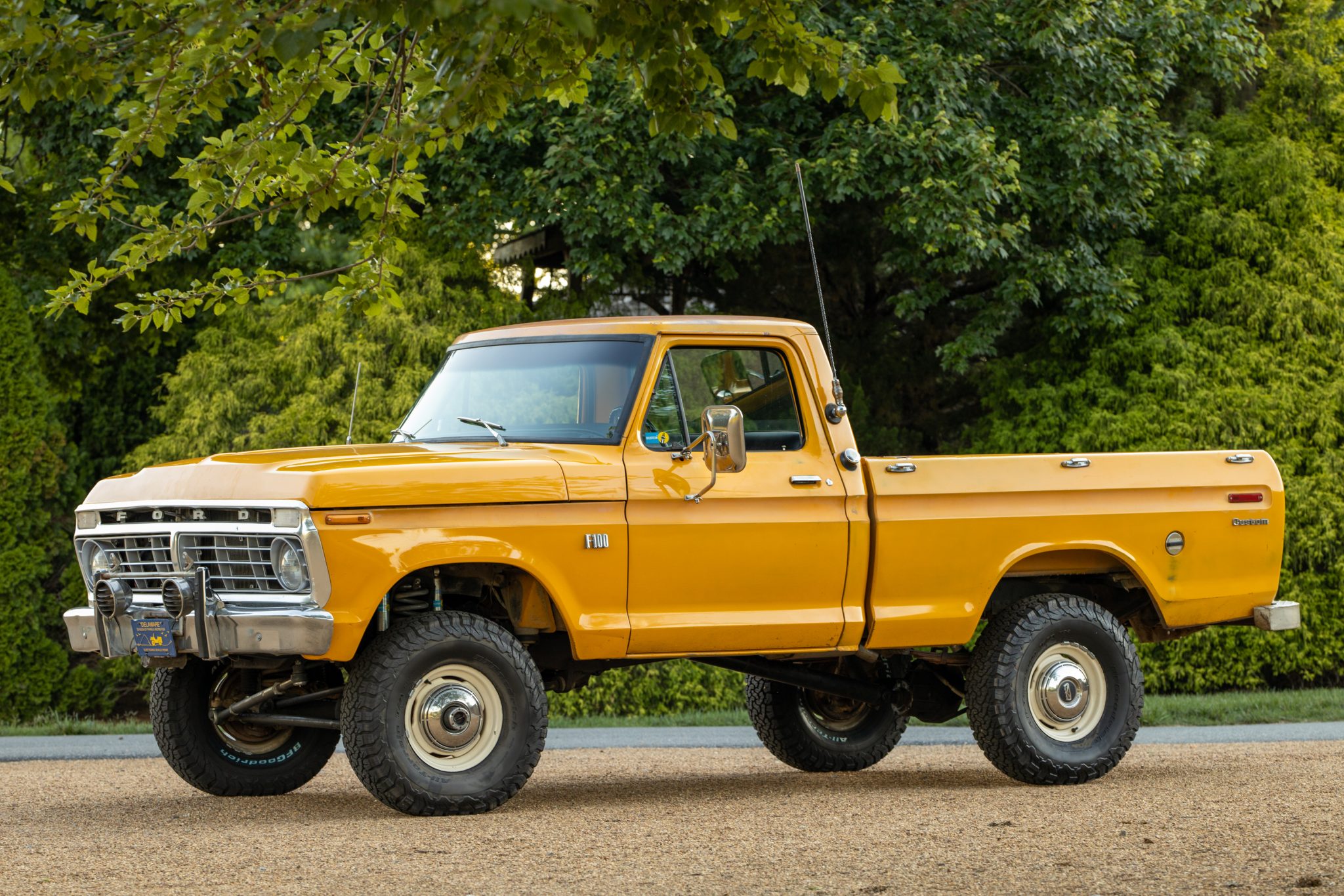 White 15″ steel wheels wear 33×10.5″ BFGoodrich All-Terrain T/A KO2 tires that are said to have been mounted in 2020. A matching spare is housed in the bed, which also has a tailgate with a white inner portion. The brakes were serviced in 2019 with a replacement master cylinder as well as front drums and shoes. The truck has been lifted approximately 5″ using Deaver leaf springs and Bilstein shocks. A Wild Horses tie rod and drag link kit was fitted in 2016, while a rebuilt steering gearbox from a 1970s F-150 was installed in 2020 along with a new Pitman arm joint.