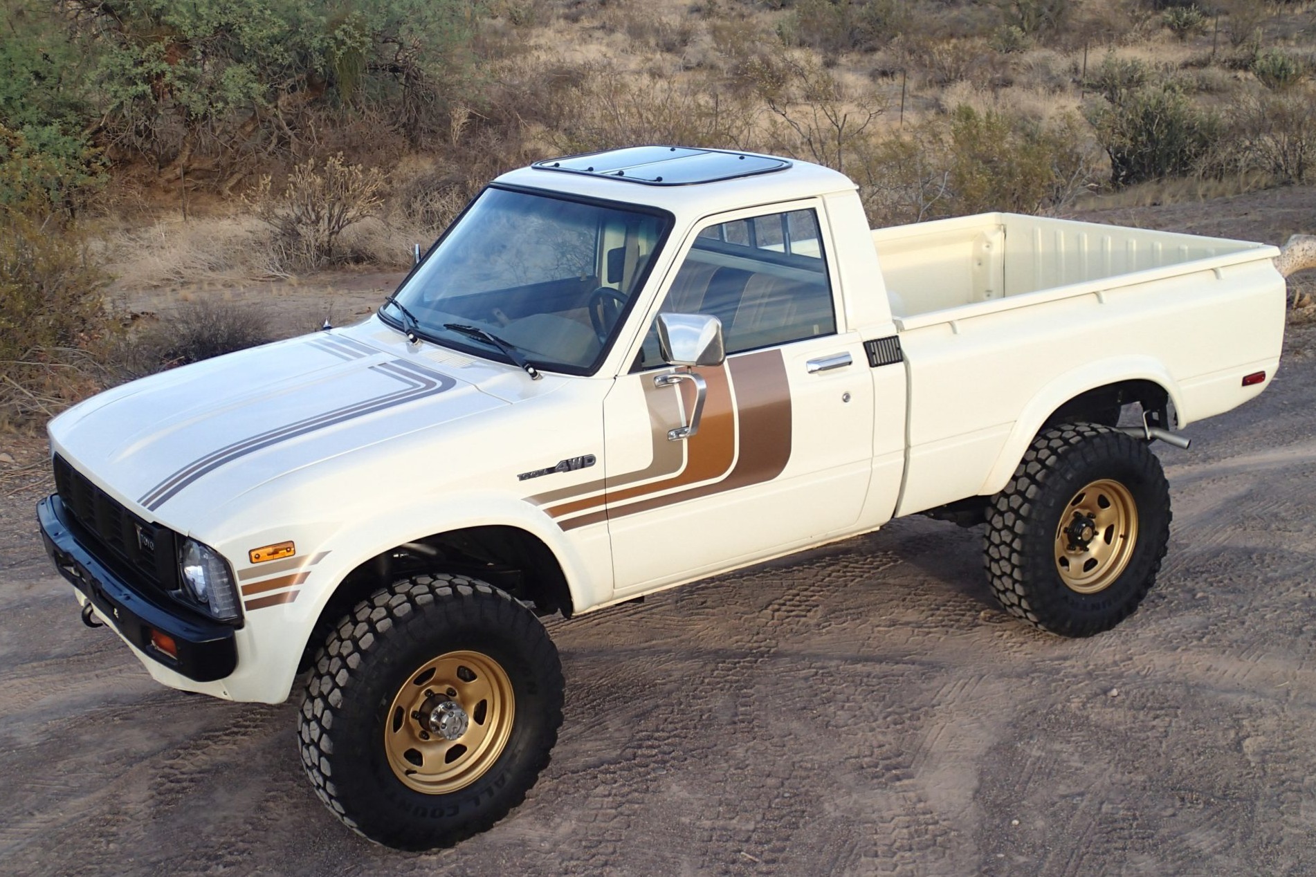 Gold-finished 15″ wheels wear Ironman Country mud-terrain tires. The truck is equipped with manually locking front hubs, and suspension consists of solid front and rear axles with leaf springs. Braking is handled by power-assisted front discs and rear drums.