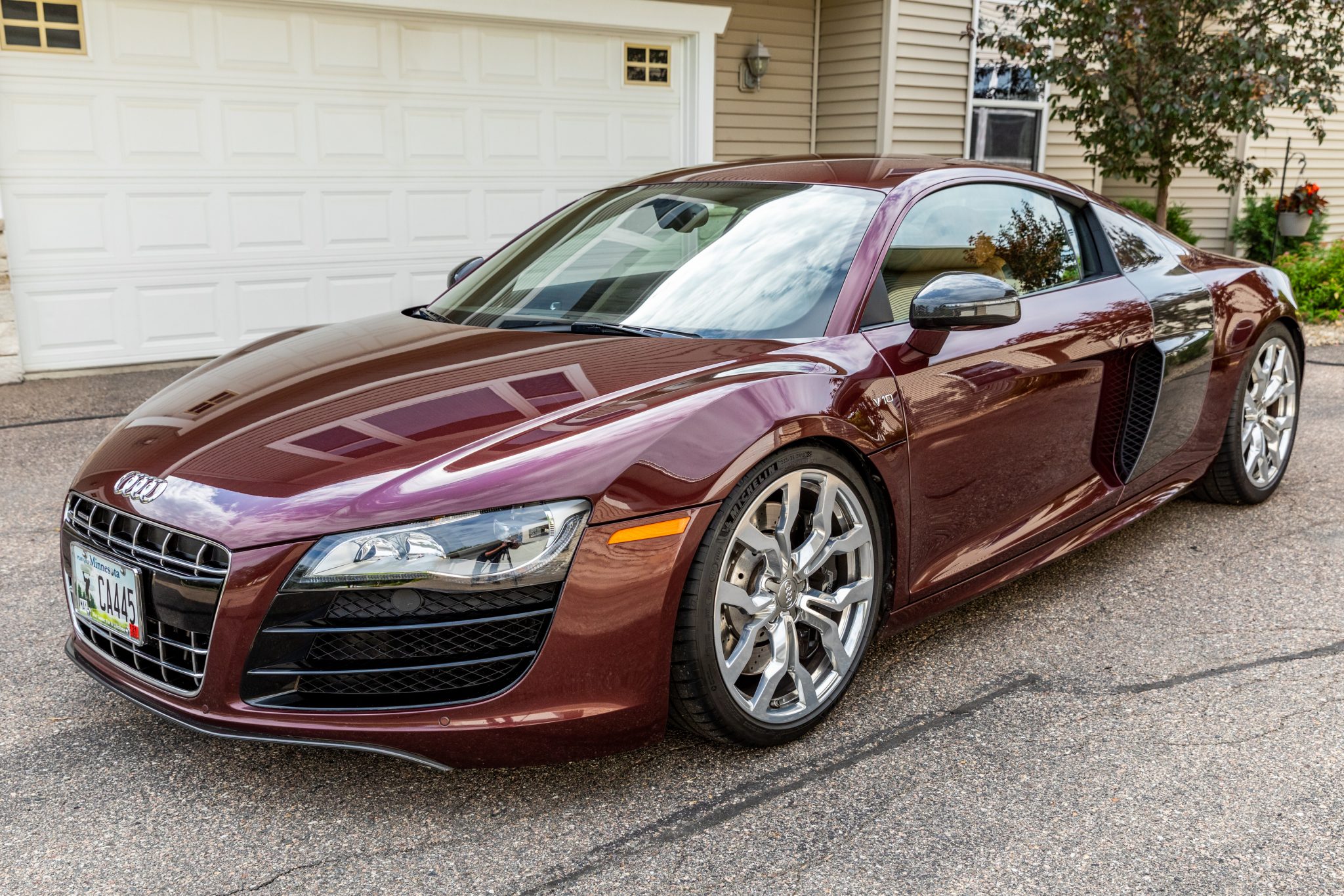 Polished and forged 19″ Y-design wheels wear Michelin Pilot Sport 4S tires measuring 235/35 up front and 305/30 out back. Stopping power is provided by cross-drilled discs with R8-branded calipers at all four corners. A KW Variant 4 suspension kit with triple-adjustable shocks and adjustable-perch springs was installed in August 2021.