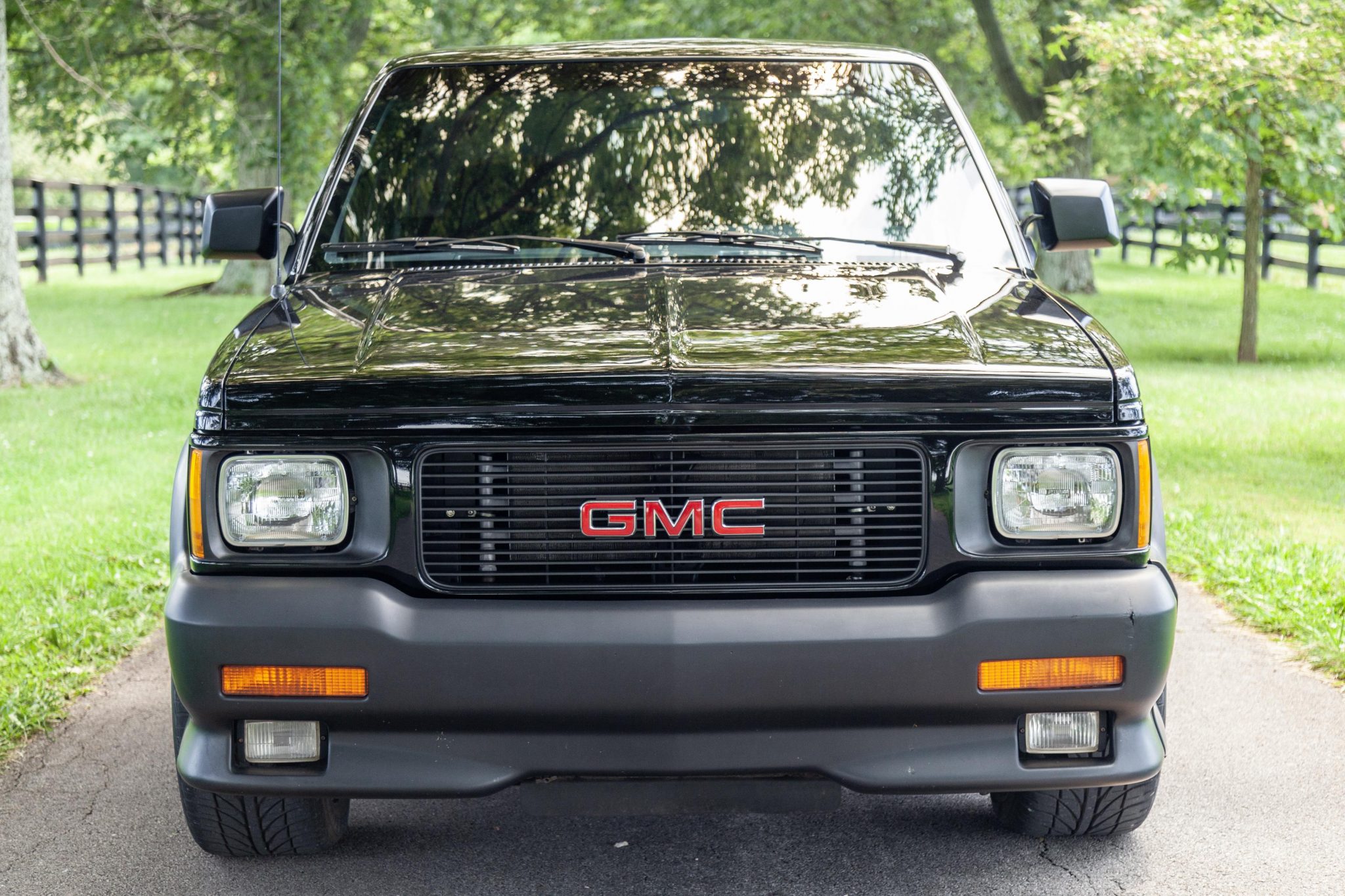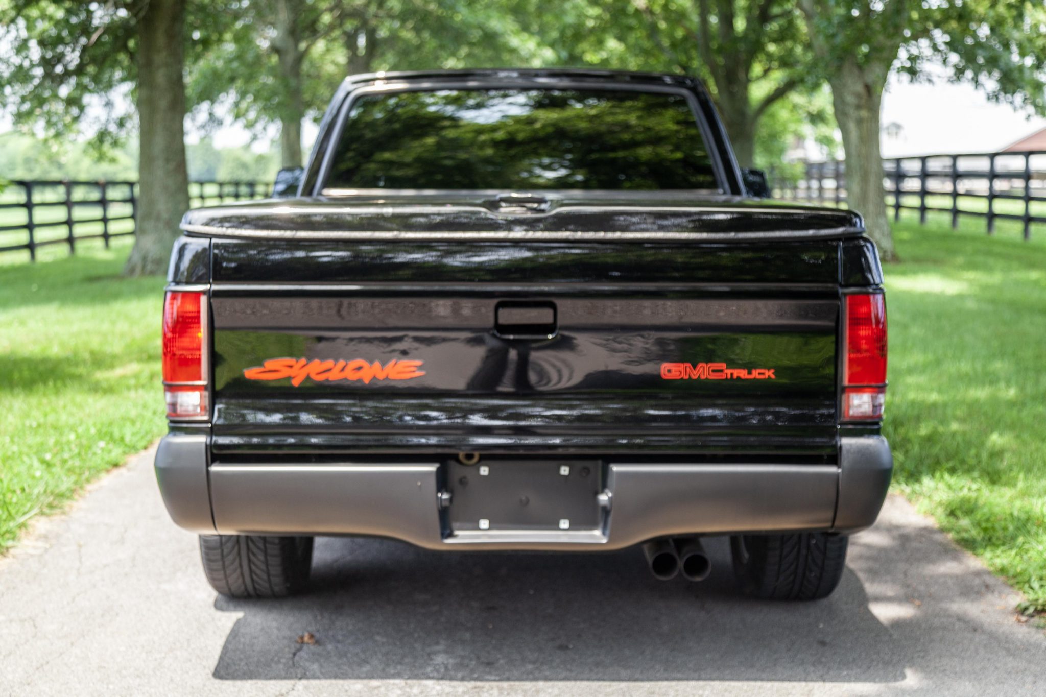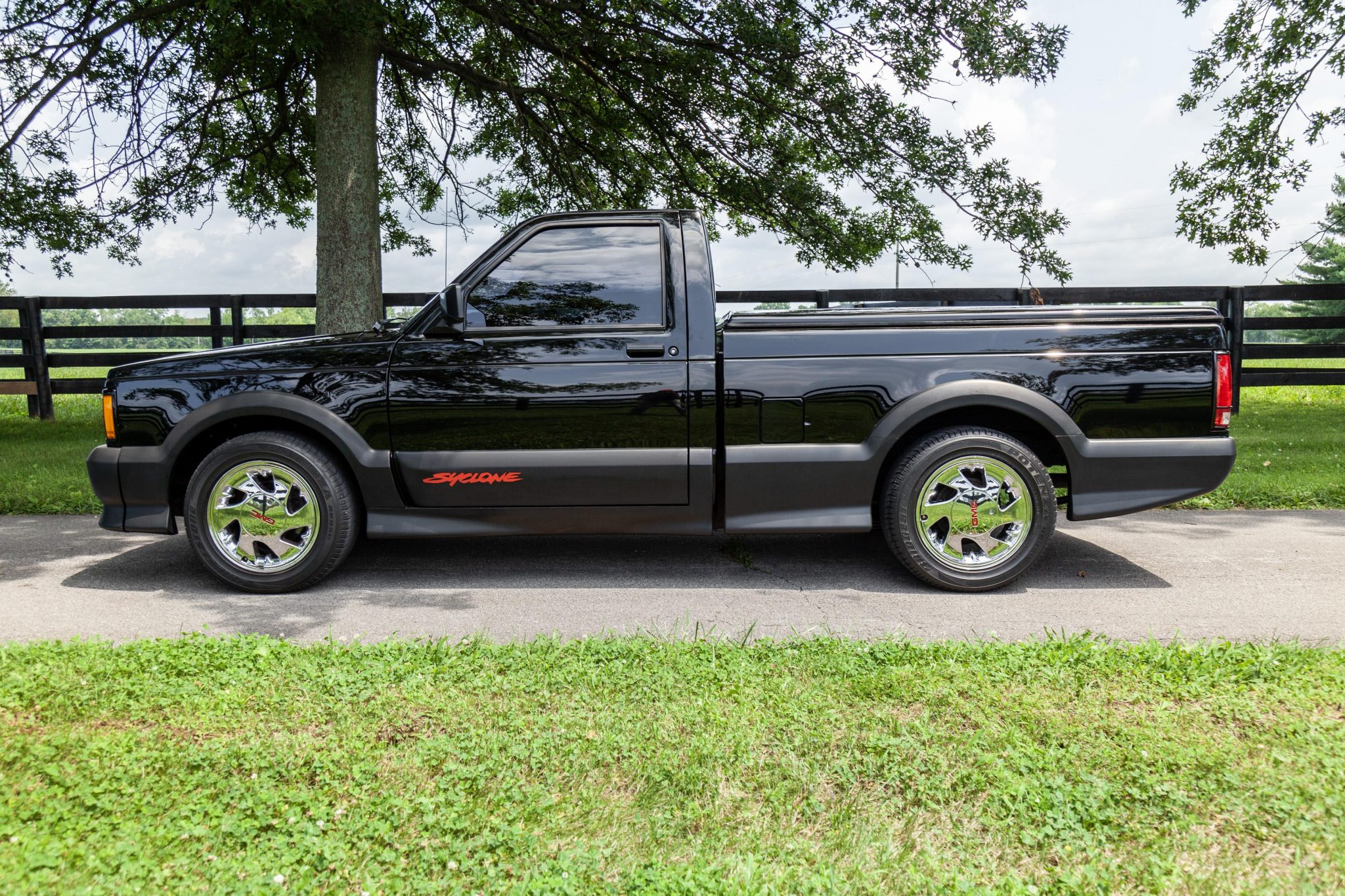 Chrome 16″ wheels wear GMC center caps are wrapped in 245/50 Bridgestone Potenza RE950 tires. Bilstein shocks have been installed, and braking is handled by cross-drilled rotors up front with drums in the rear.
