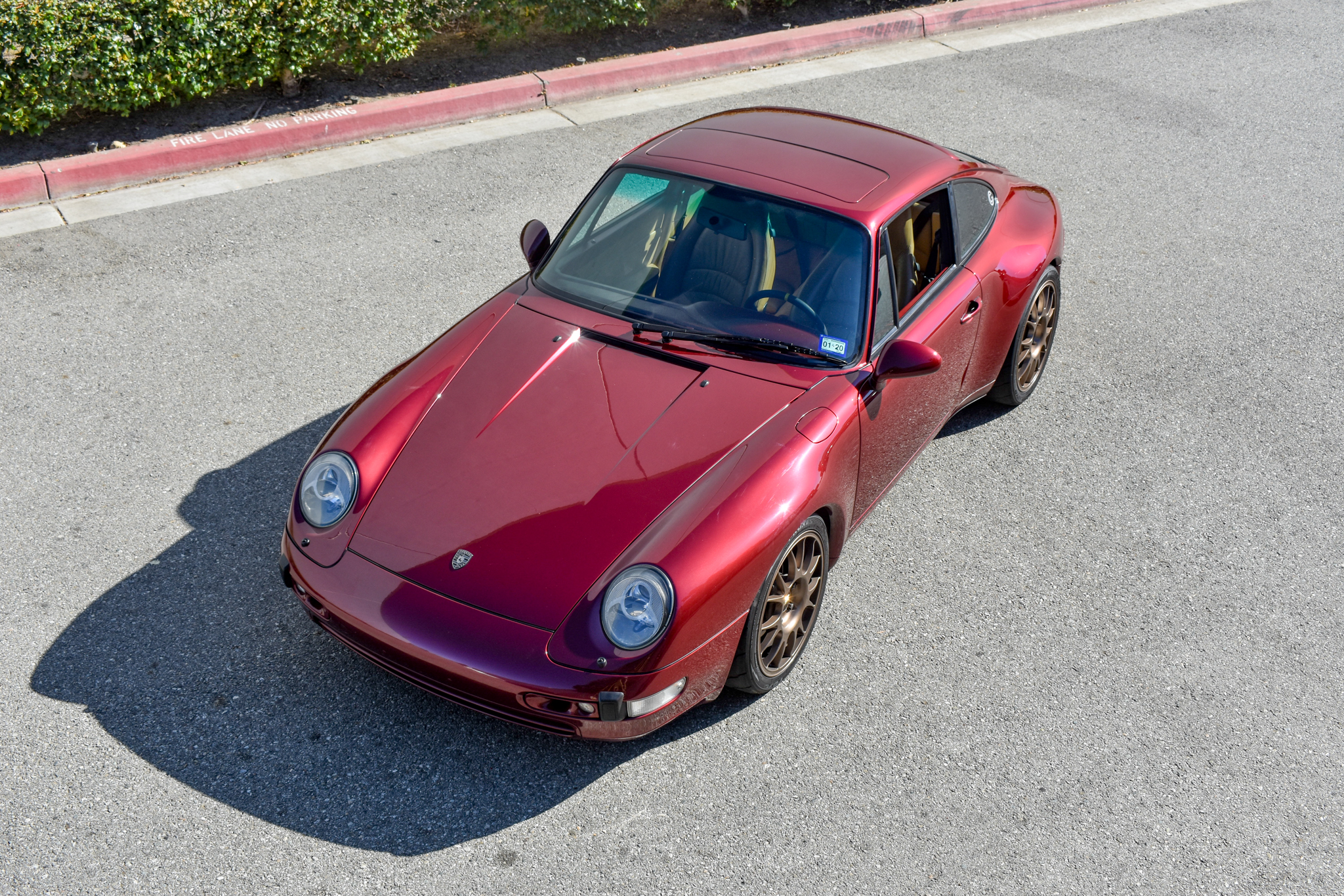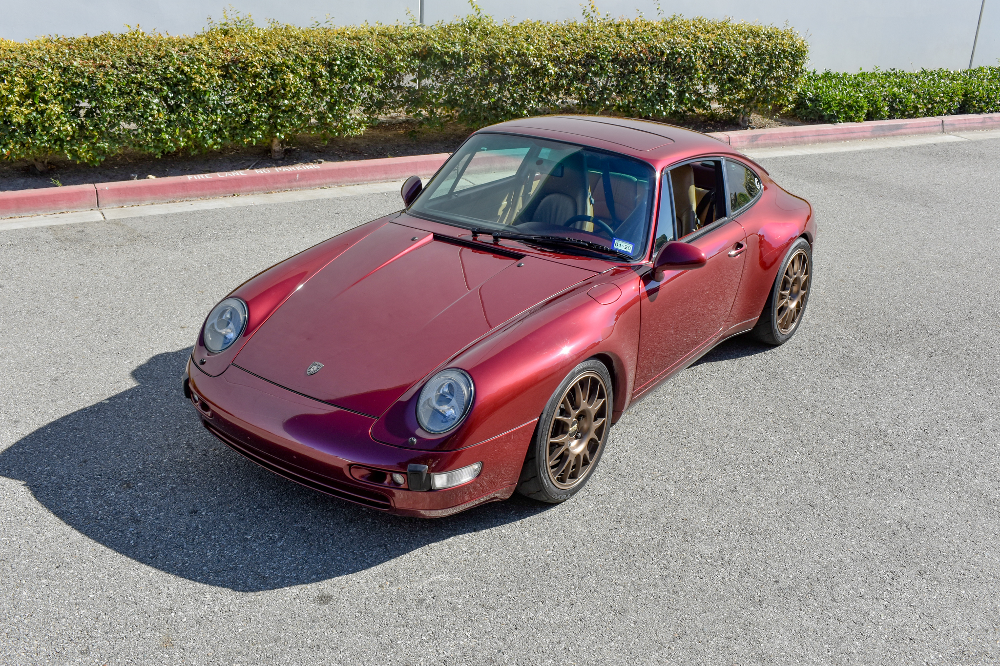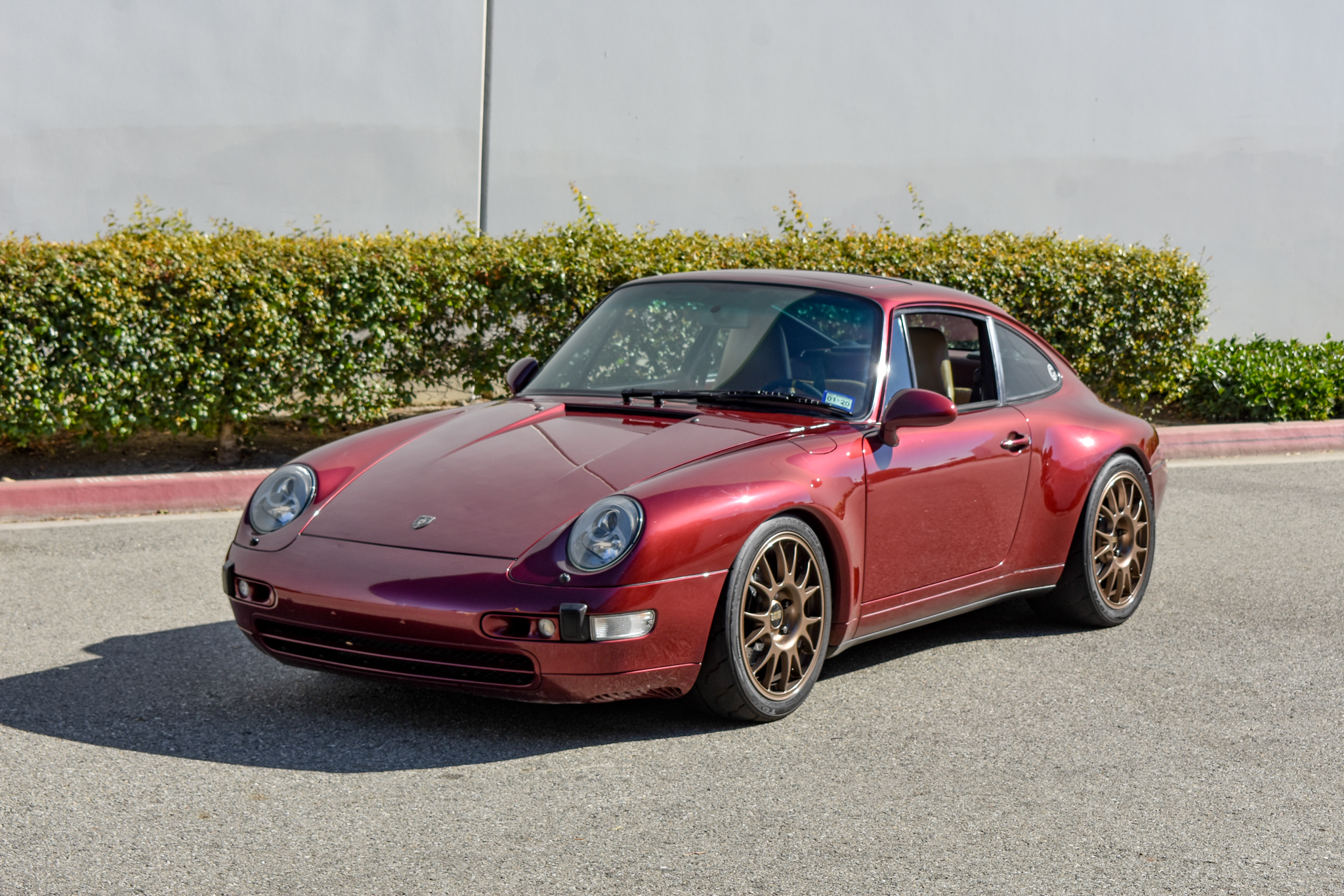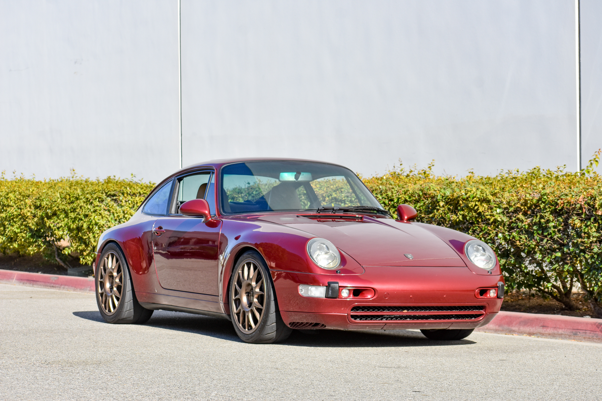 Aftermarket 18″ BBS RE wheels are finished in bronze and wrapped in Toyo R888R tires. Stopping power is provided by Porsche-branded calipers over cross-drilled rotors at all four corners. The suspension was modified with the following components: