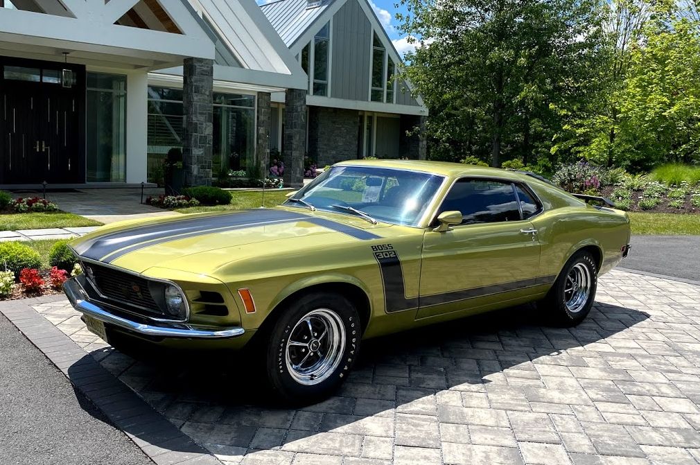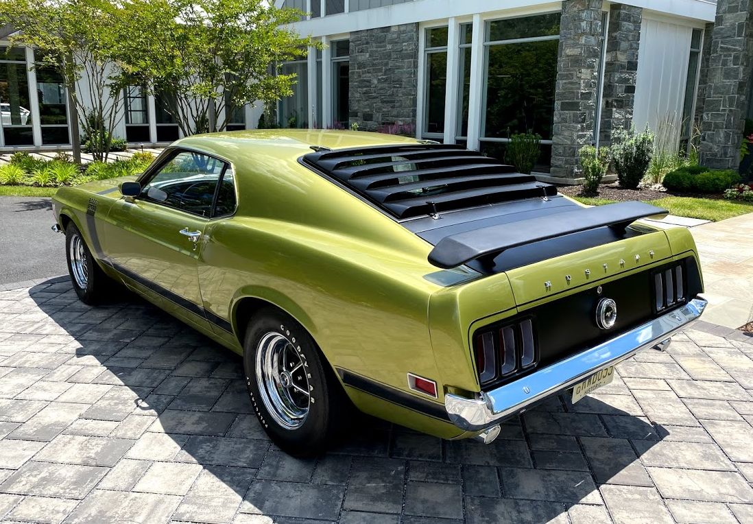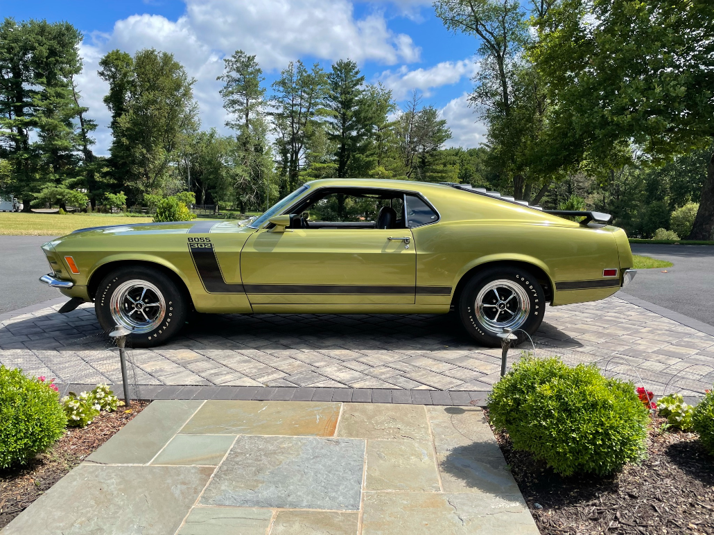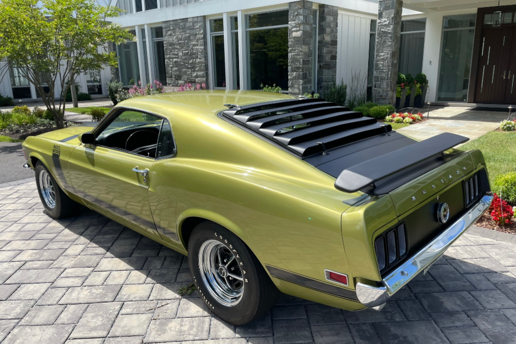 15″ Magnum 500-style wheels are mounted with F60x15 Goodyear Polyglas GT tires, and a spare set of Magnum 500-style wheels wearing Futura Ultra radial tires will accompany the car. Standard Boss 302 equipment includes power-assisted front disc brakes and quick-ratio steering.