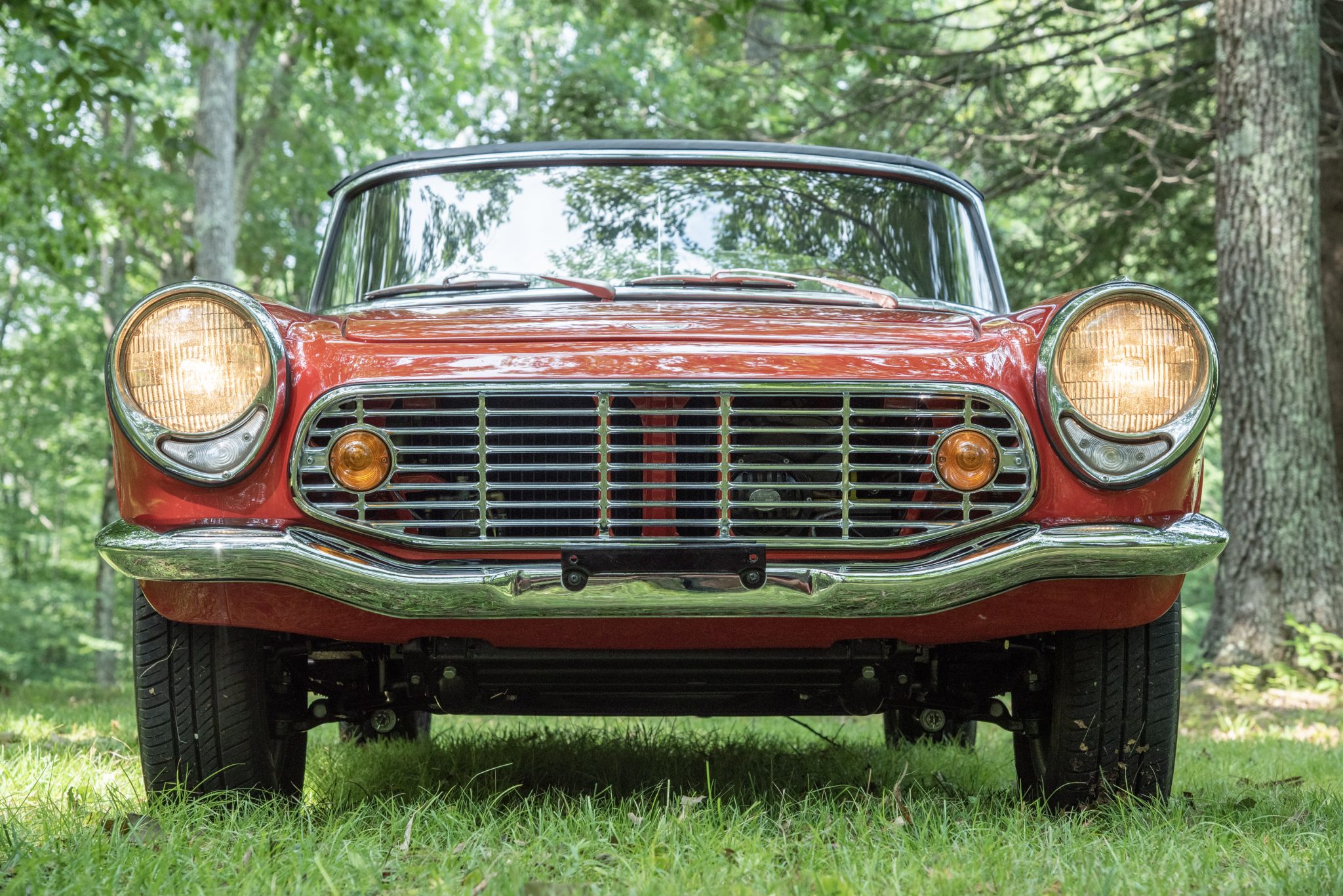 Five-spoke 13″ wheels wear chrome hubcaps and 155/80 Thunderer City tires. The suspension and brakes have been refurbished.