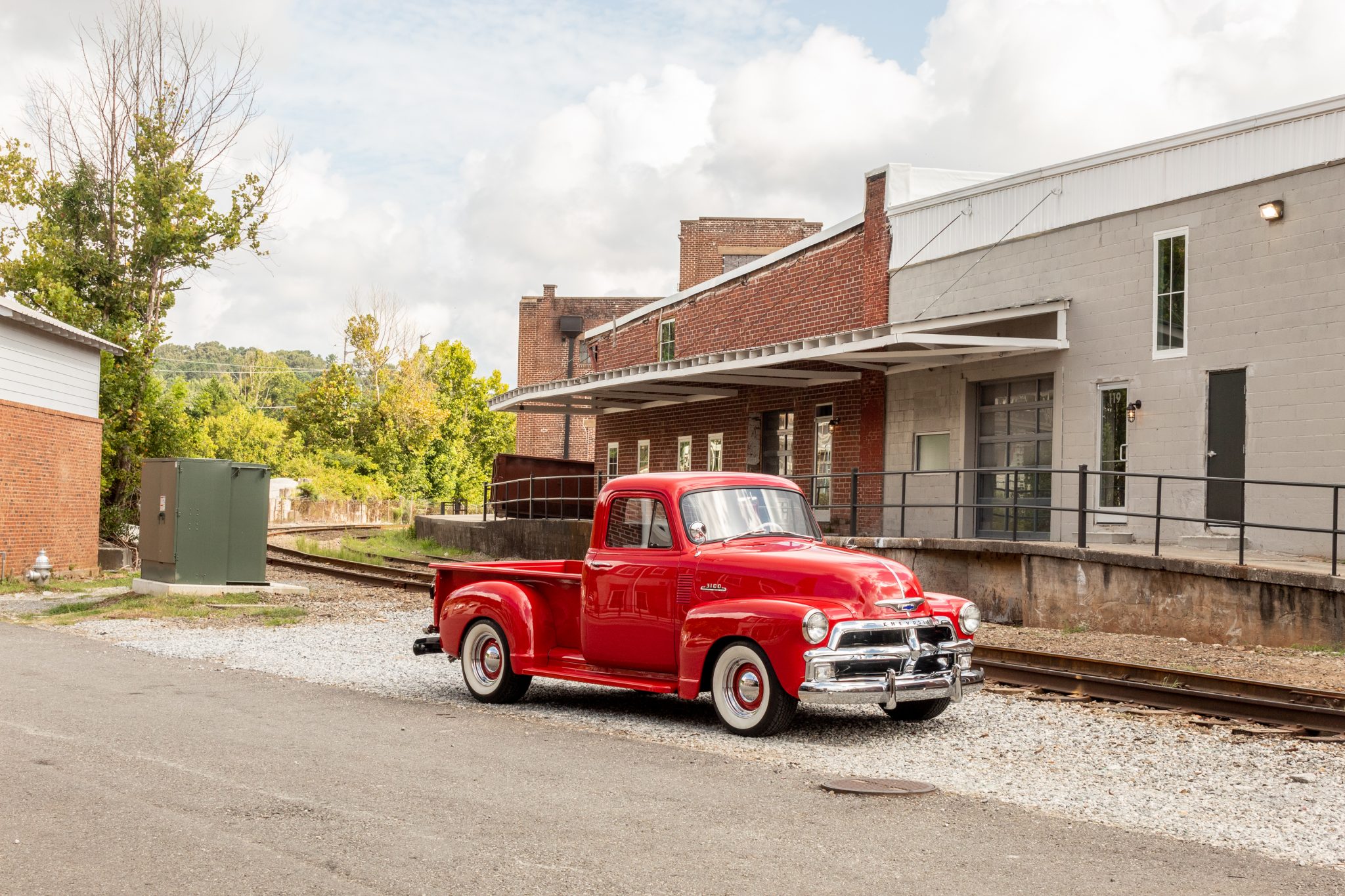 Red-painted 15″ steel wheels wear chrome hubcaps and trim rings along with 255/70 BFGoodrich Silvertown whitewall tires. A Mustang II-style front end with tubular A-arms has been installed as part of the refurbishment along with front disc brakes and power steering. The truck sits on adjustable Ridetech shocks and has been lowered according to the seller.