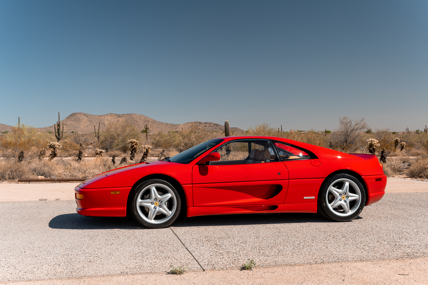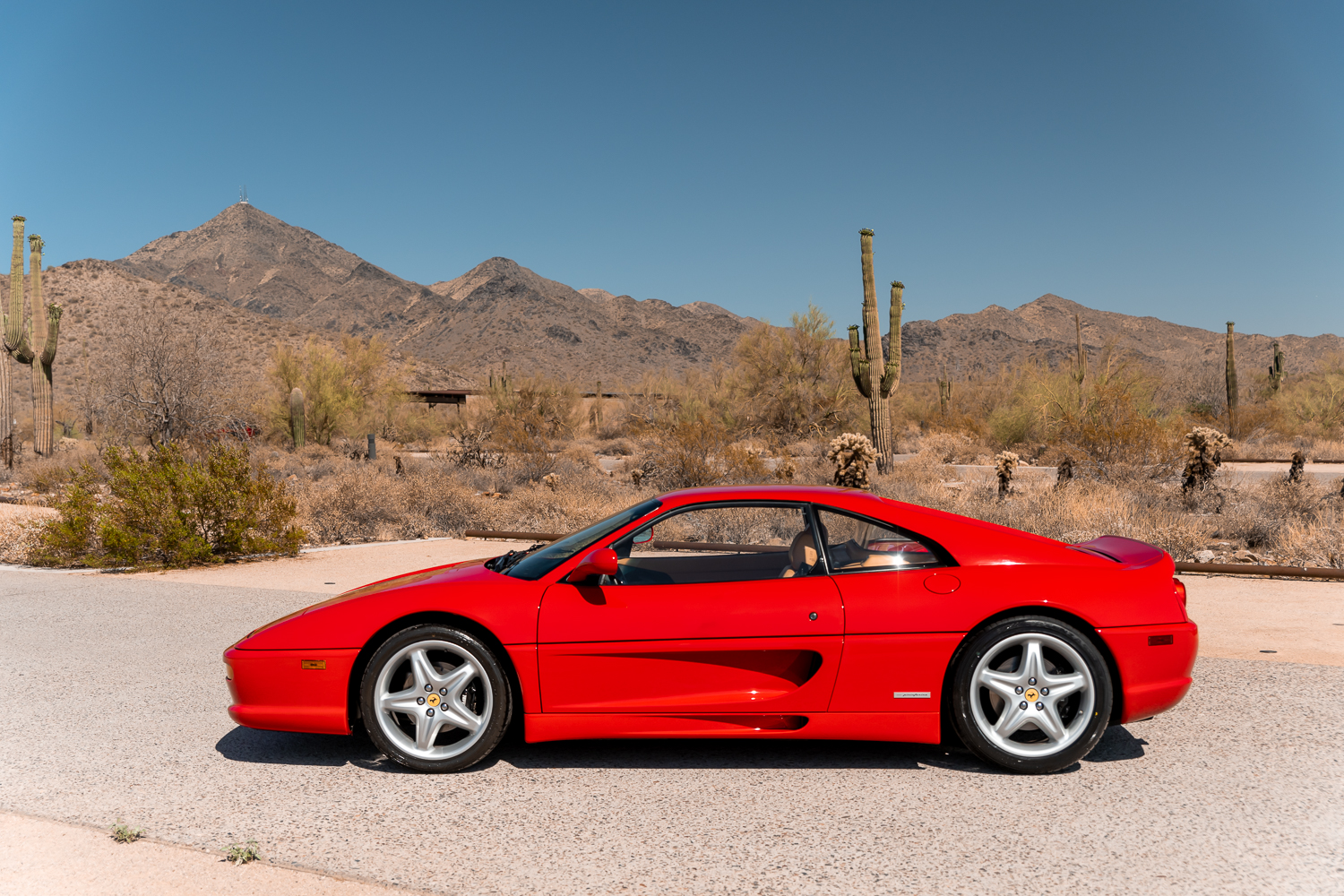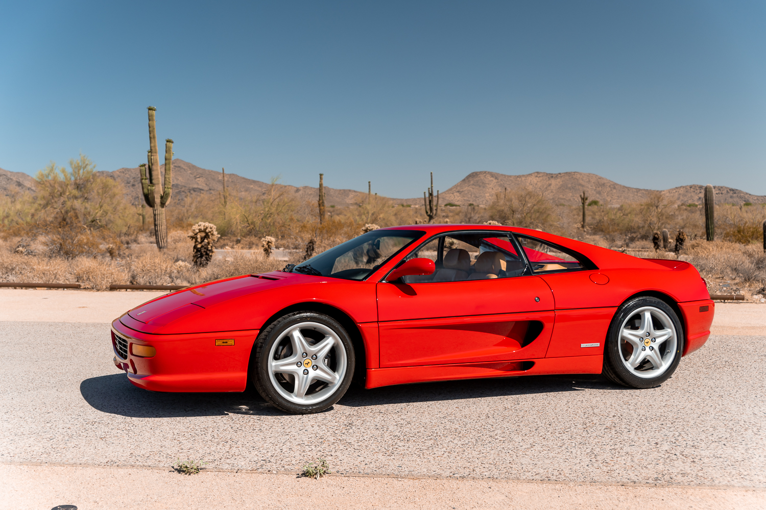 Factory 18″ five-spoke alloys wear 225/40 front and 265/40 rear Bridgestone Potenza tires. The braking system features black calipers with white Ferrari script and vented discs at all four corners.