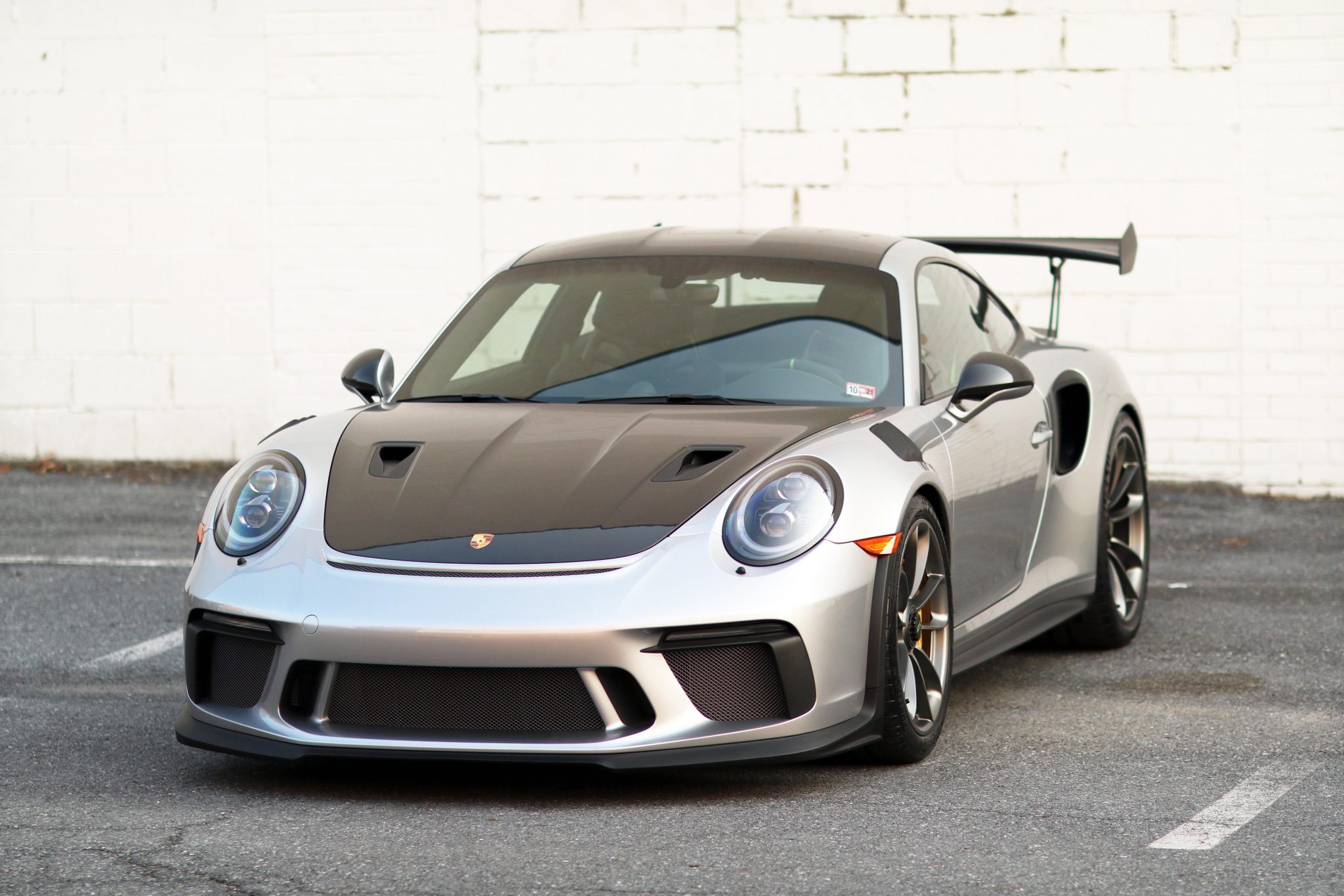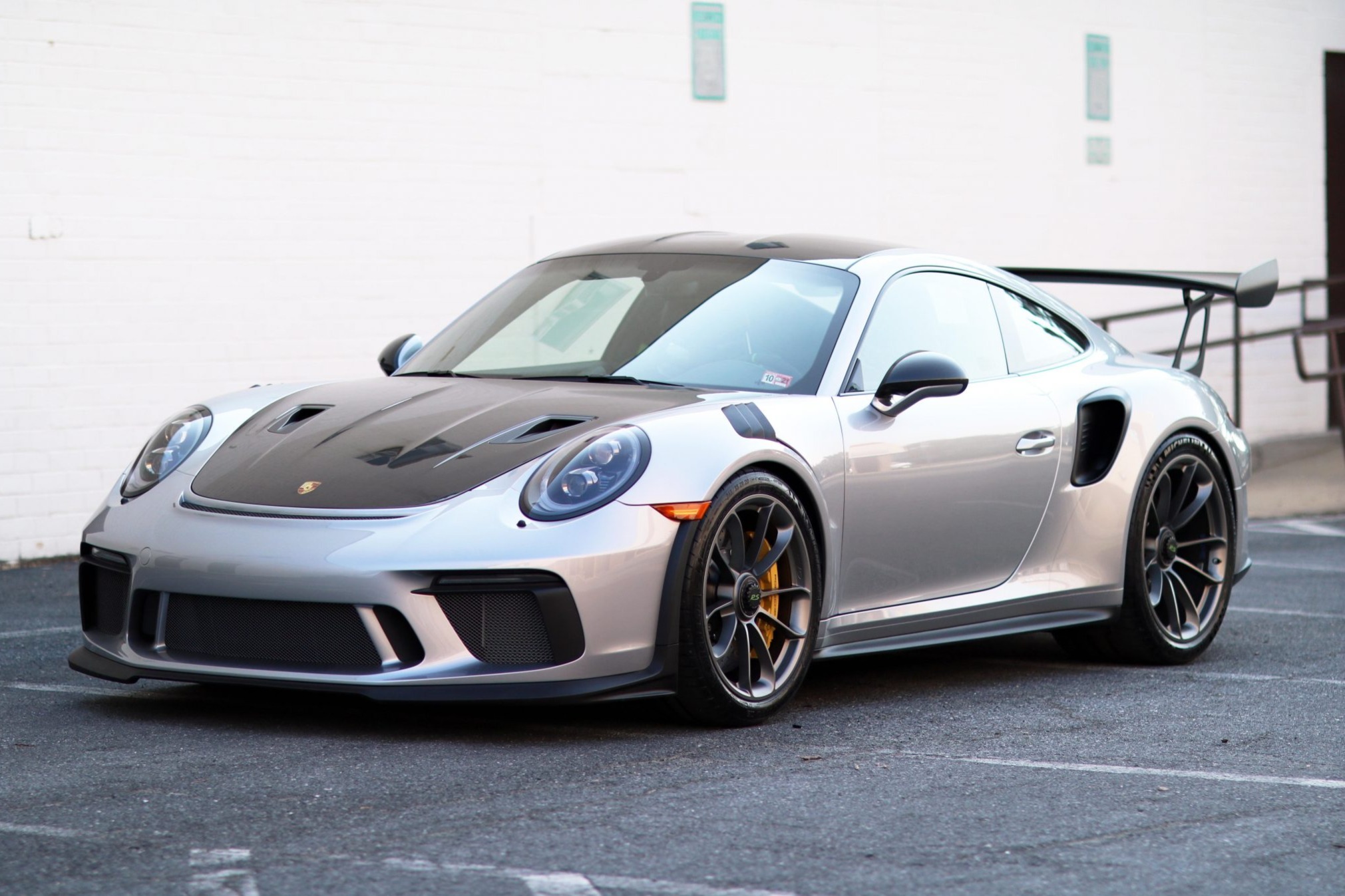 Satin Platinum-finished center-lock wheels measuring 20″ in diameter up front and 21″ out back are wrapped in Michelin Pilot Sport Cup 2 tires measuring 265/35 and 325/30, respectively. The Weissach Package specified stiffer carbon-composite anti-roll bars, and stopping power is provided by optional Porsche Ceramic Composite Brakes with yellow-finished calipers.