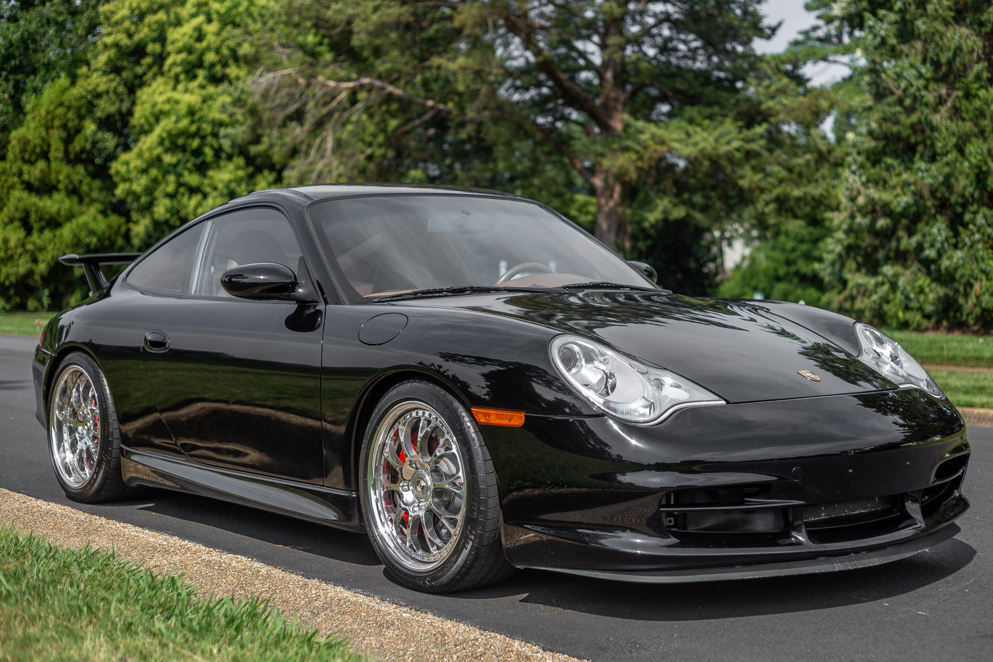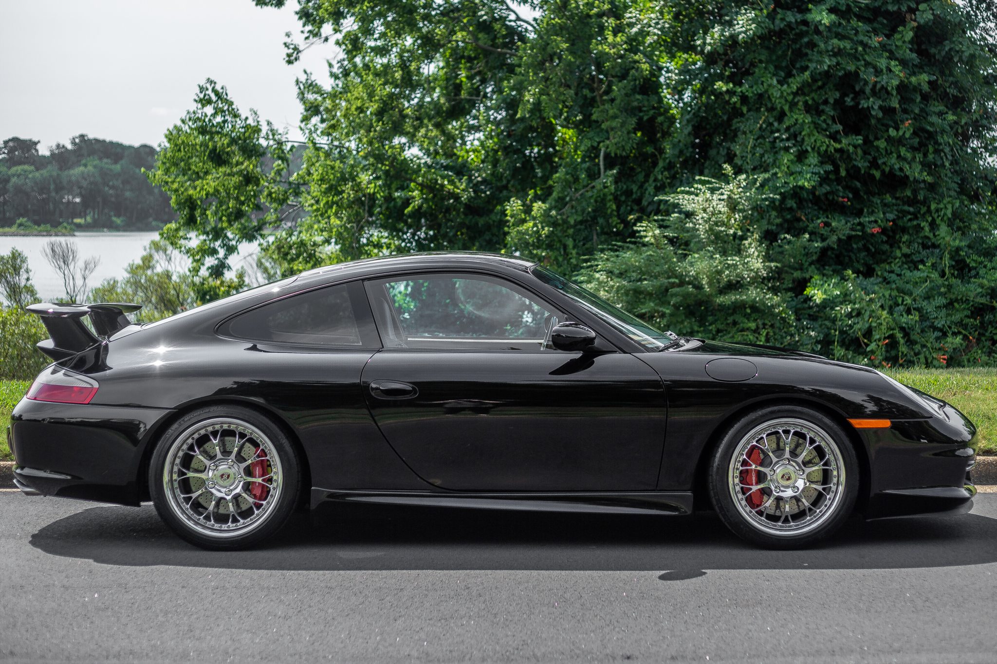 Staggered-width 18” Kinesis three-piece forged wheels wear 235/40 front and 295/30 rear Michelin Pilot Sport tires. Braking is handled by red-finished calipers with Porsche script over cross-drilled rotors at all four corners. The removed wheels are included in the sale and are shown in the gallery below.