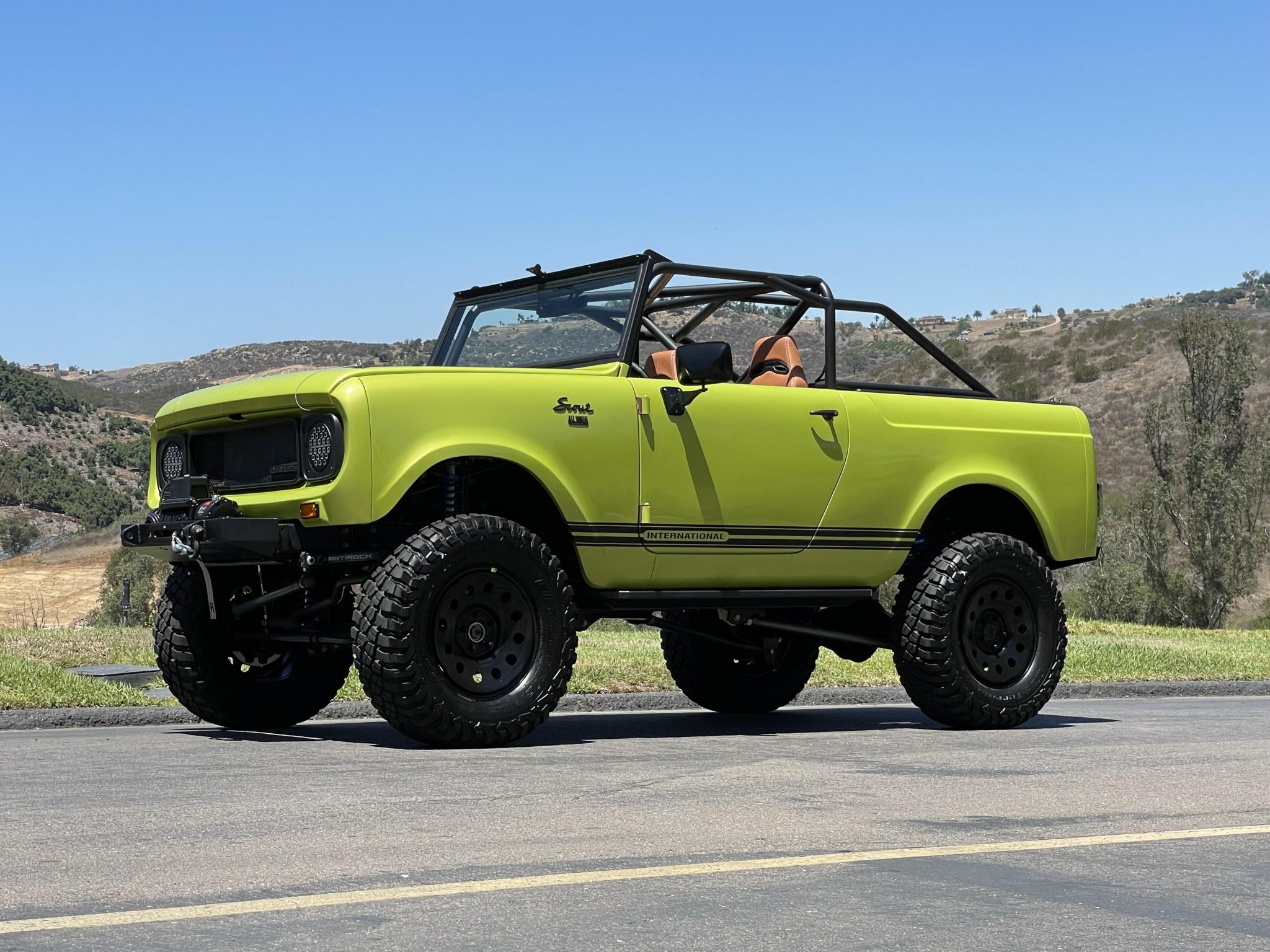 Jeep-sourced 17″ Mopar steel wheels wear a black finish and are mounted with 295/70 BFGoodrich Mud-Terrain KM3 tires. The factory leaf-spring suspension has been removed and replaced with a custom multi-link system utilizing Dana 30 front and 40 rear axles, King 2.0″ Emulsion coilovers, a Synergy heavy-duty drag link kit, and RockJock sway bar and control arm components. The truck is also equipped with four-wheel power-assisted disc brakes that feature stainless steel lines and a Corvette-sourced master-cylinder and proportioning valve.