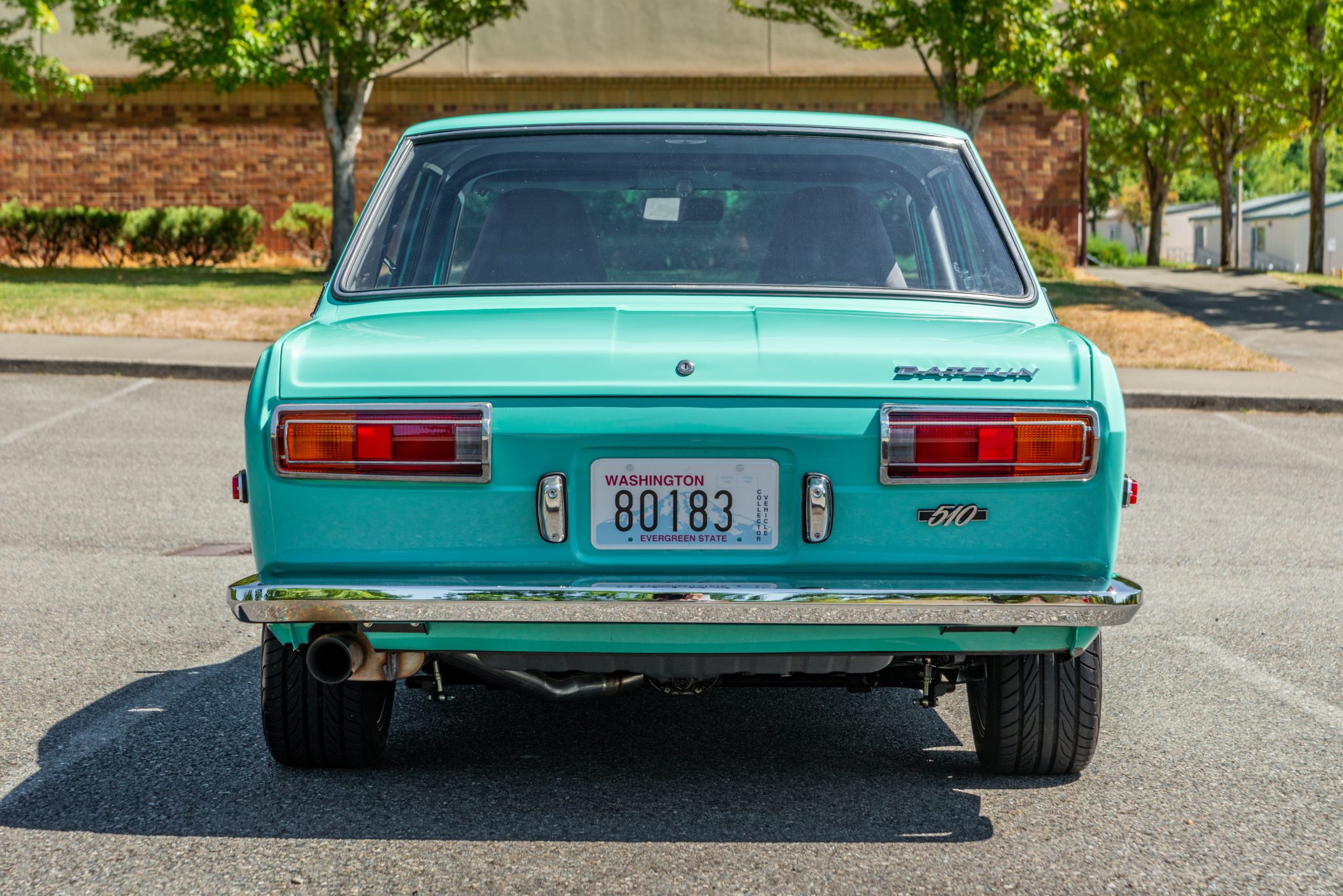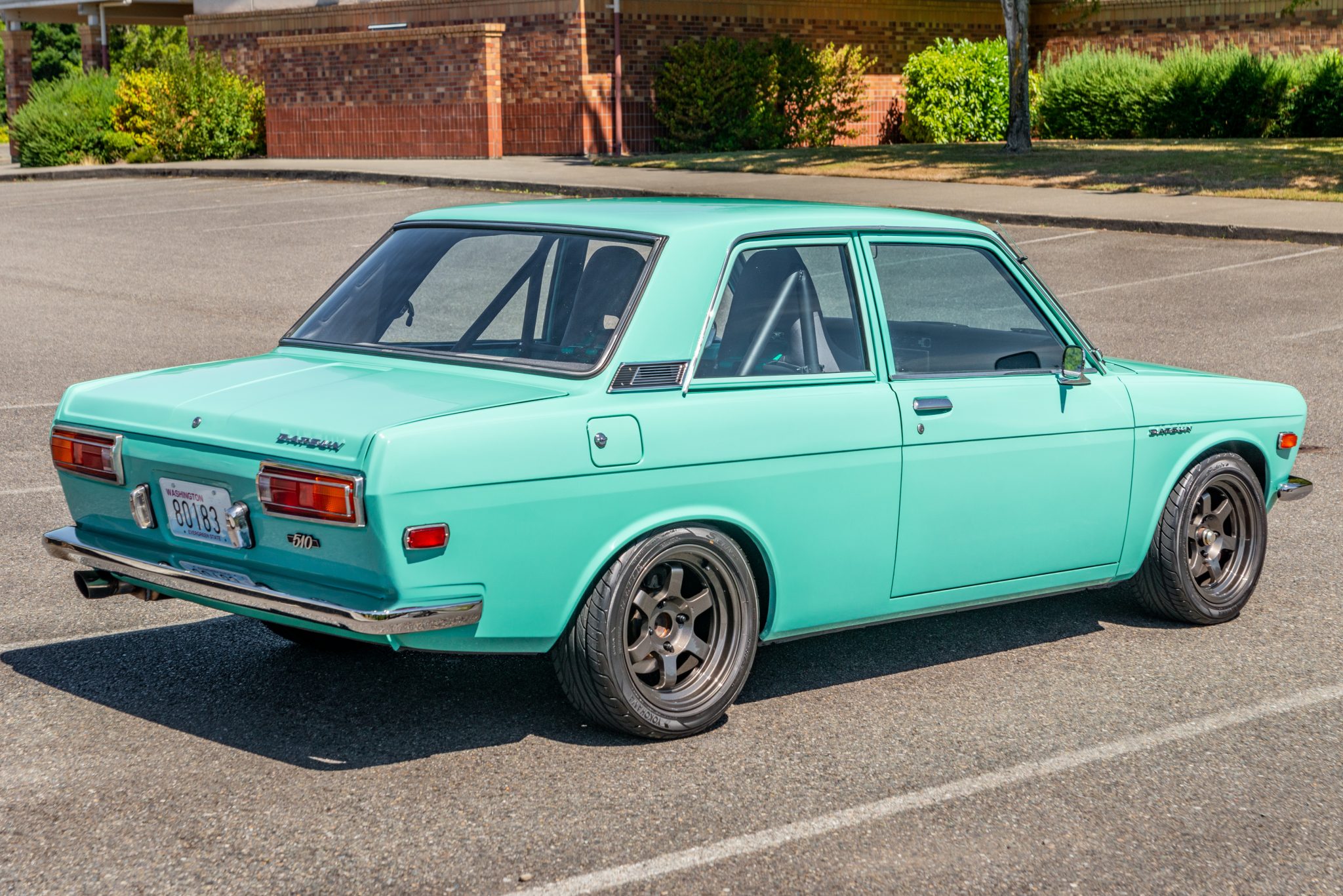 Bronze-colored 15″ aftermarket wheels are mounted with 195/50 Yokohama S.drive tires. The front end has been modified with Ground Control coilovers and 280ZX disc brakes, while Datsport coil springs and 240SX disc brakes have been installed at the rear. Other modifications include a dual-reservoir brake master cylinder and braided brake hoses.