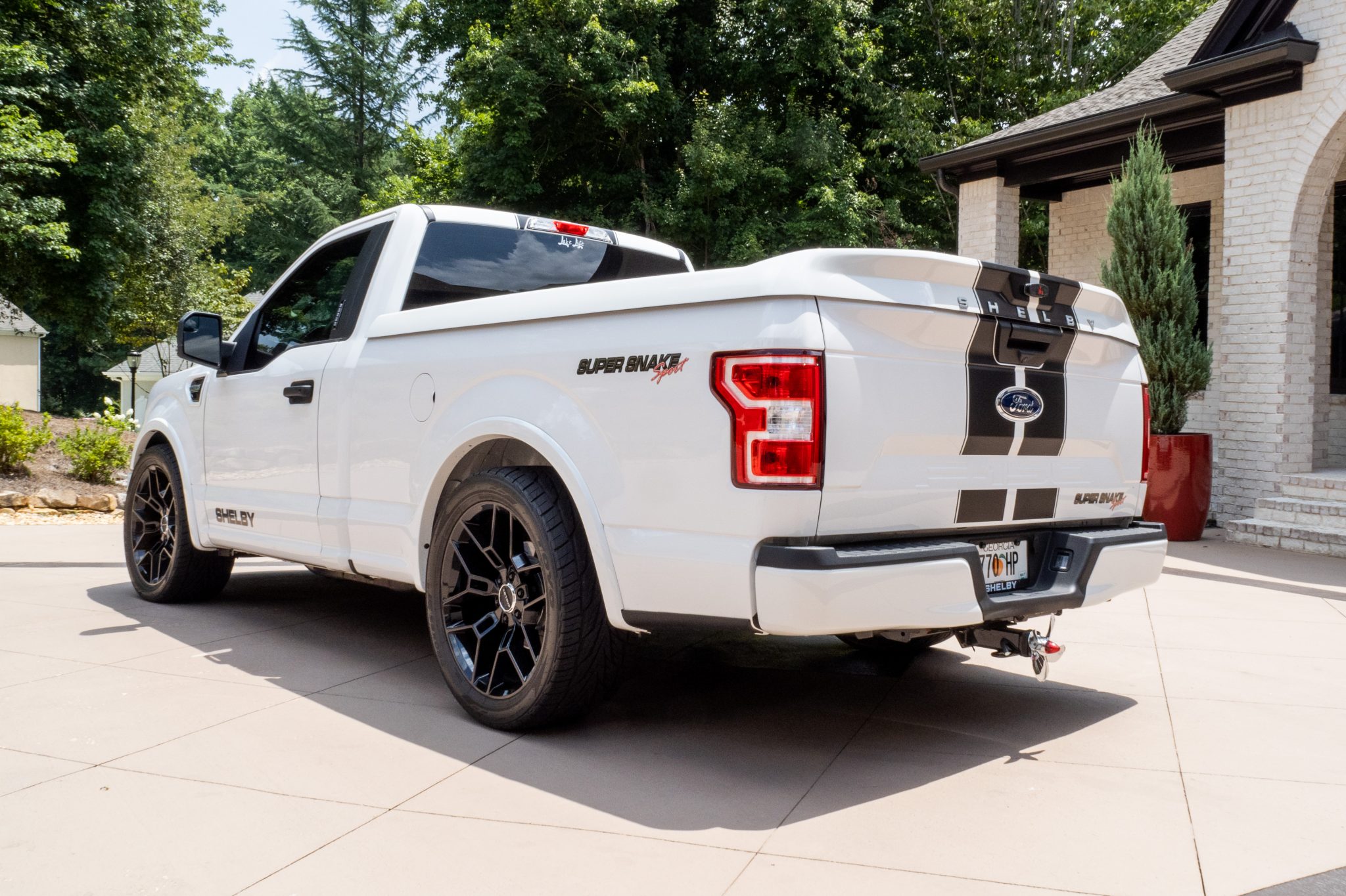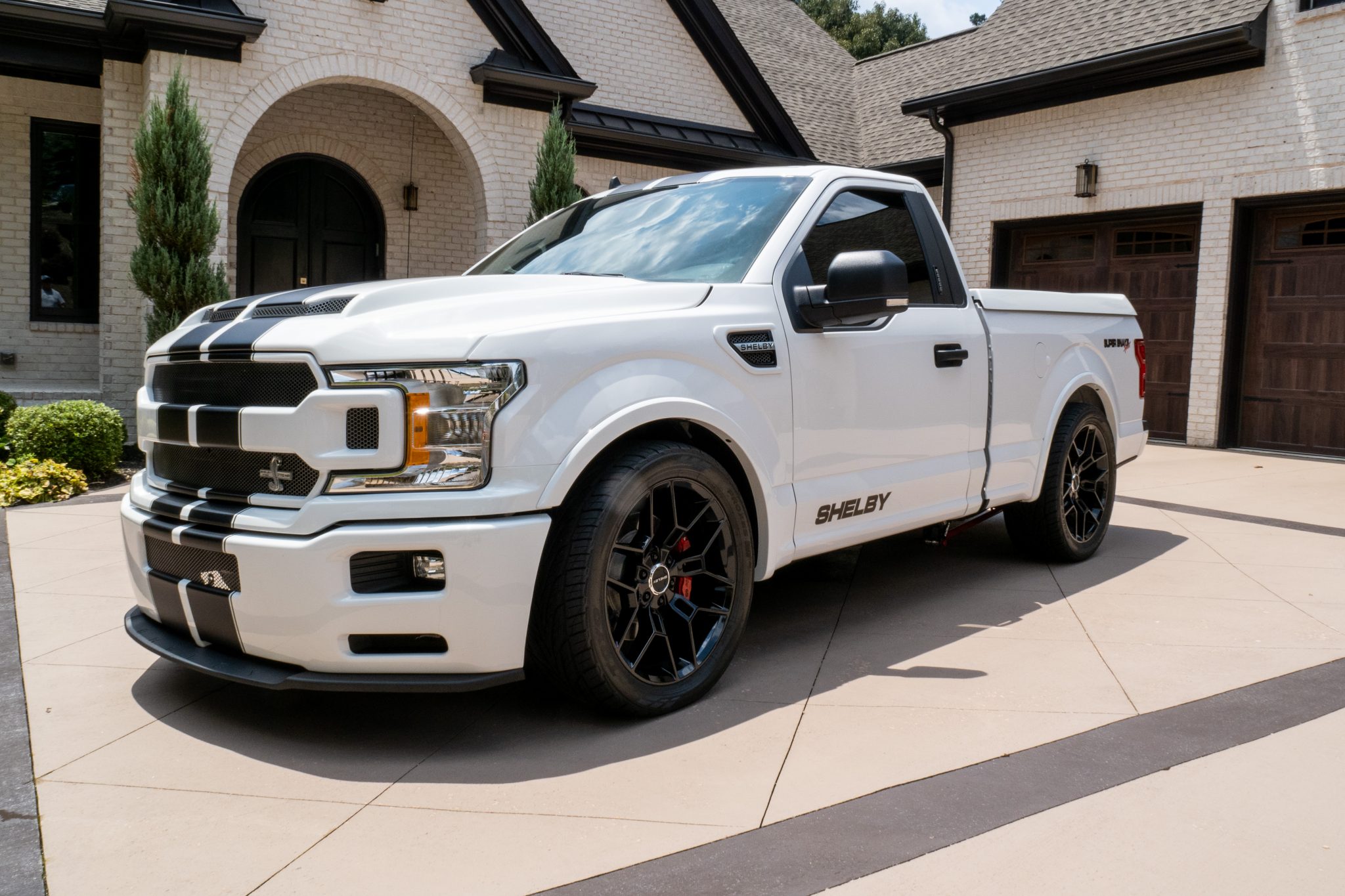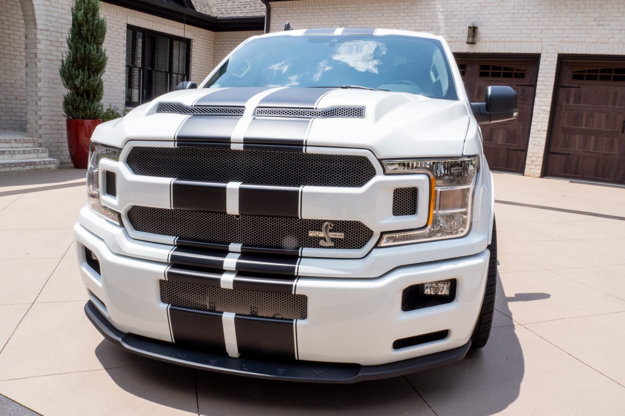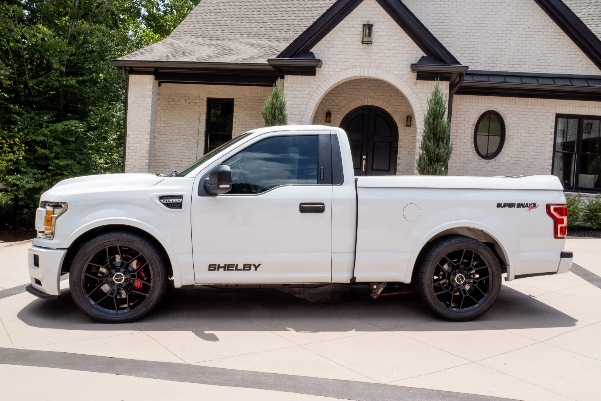 Black 22″ wheels wear Shelby center caps and 305/40 Toyo Proxes ST III tires. Shelby added a lowered Stage 3 racing suspension that included adjustable upper control arms, cam alignment lower control arms, Shelby-tuned performance front coilovers and rear shocks, a rear leaf-spring shackle kit, and an adjustable rear sway bar. Braking is handled by Baer six-piston calipers in the front and Shelby-branded calipers in the rear along with slotted rotors at all four corners.