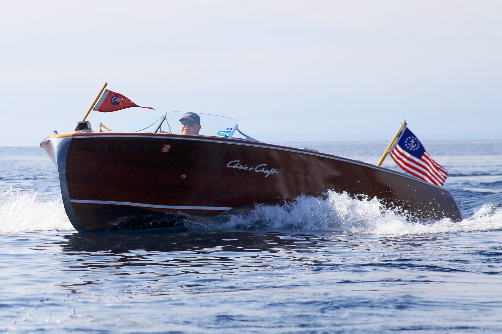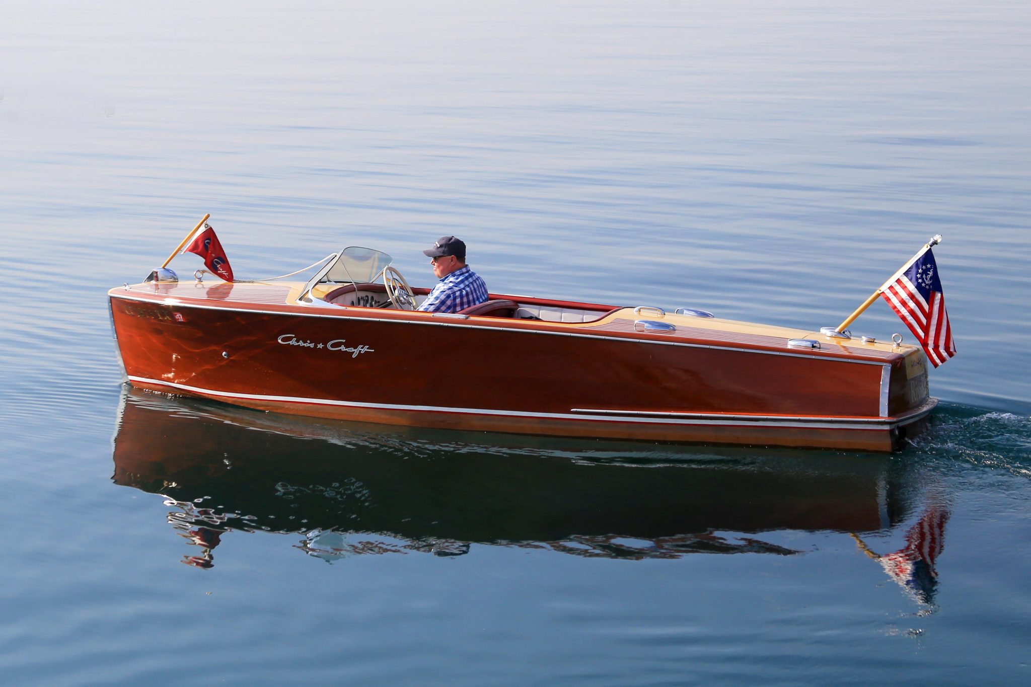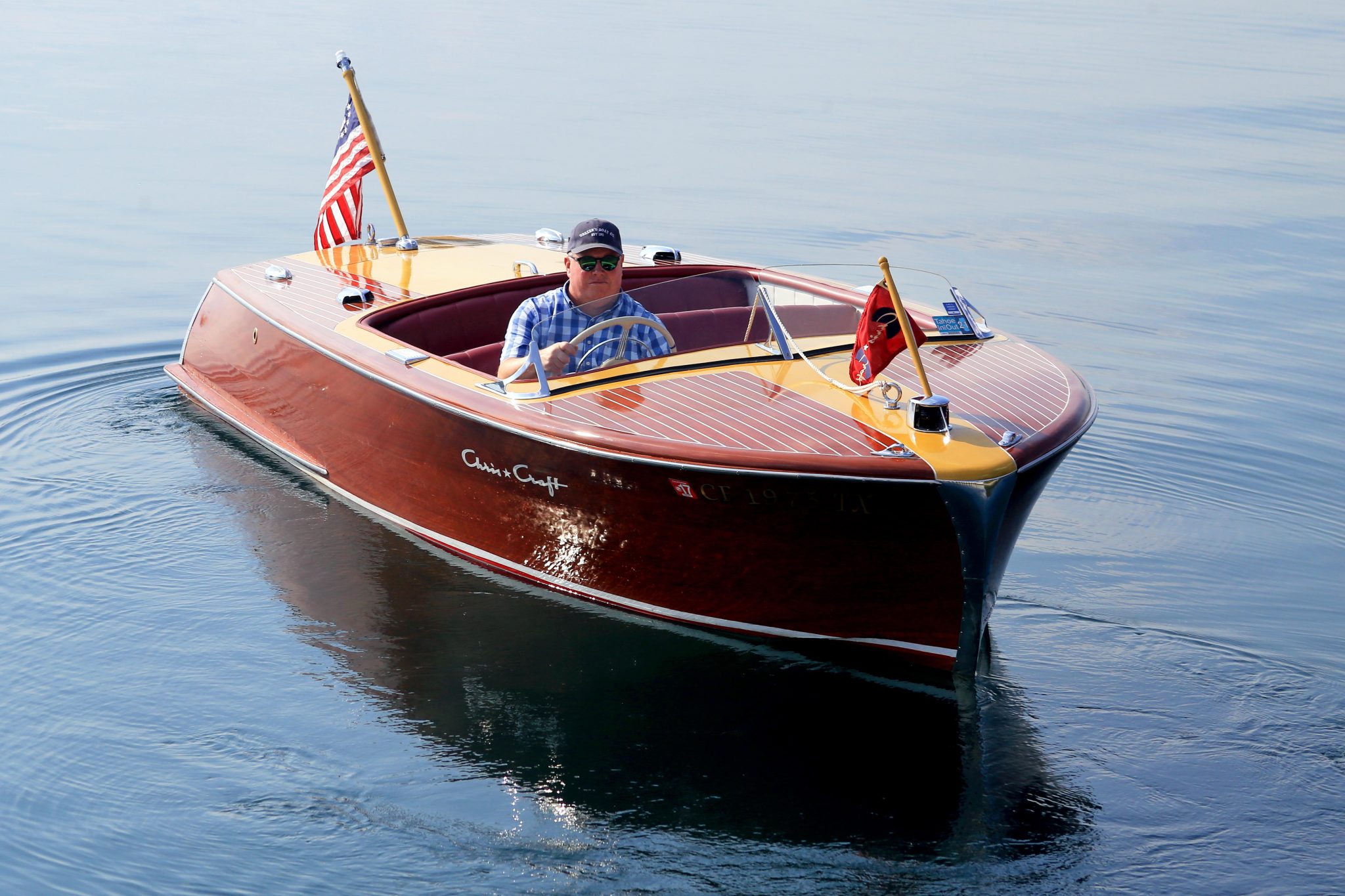 The cockpit features twin bench seats upholstered in red vinyl with pleated backrests, and is accessed using gunwale-mounted step plates. The side walls and crash padding are upholstered to match, and the floorboards are finished in white. Additional seat-bottom cushions can be seen in the gallery and are included in the sale.