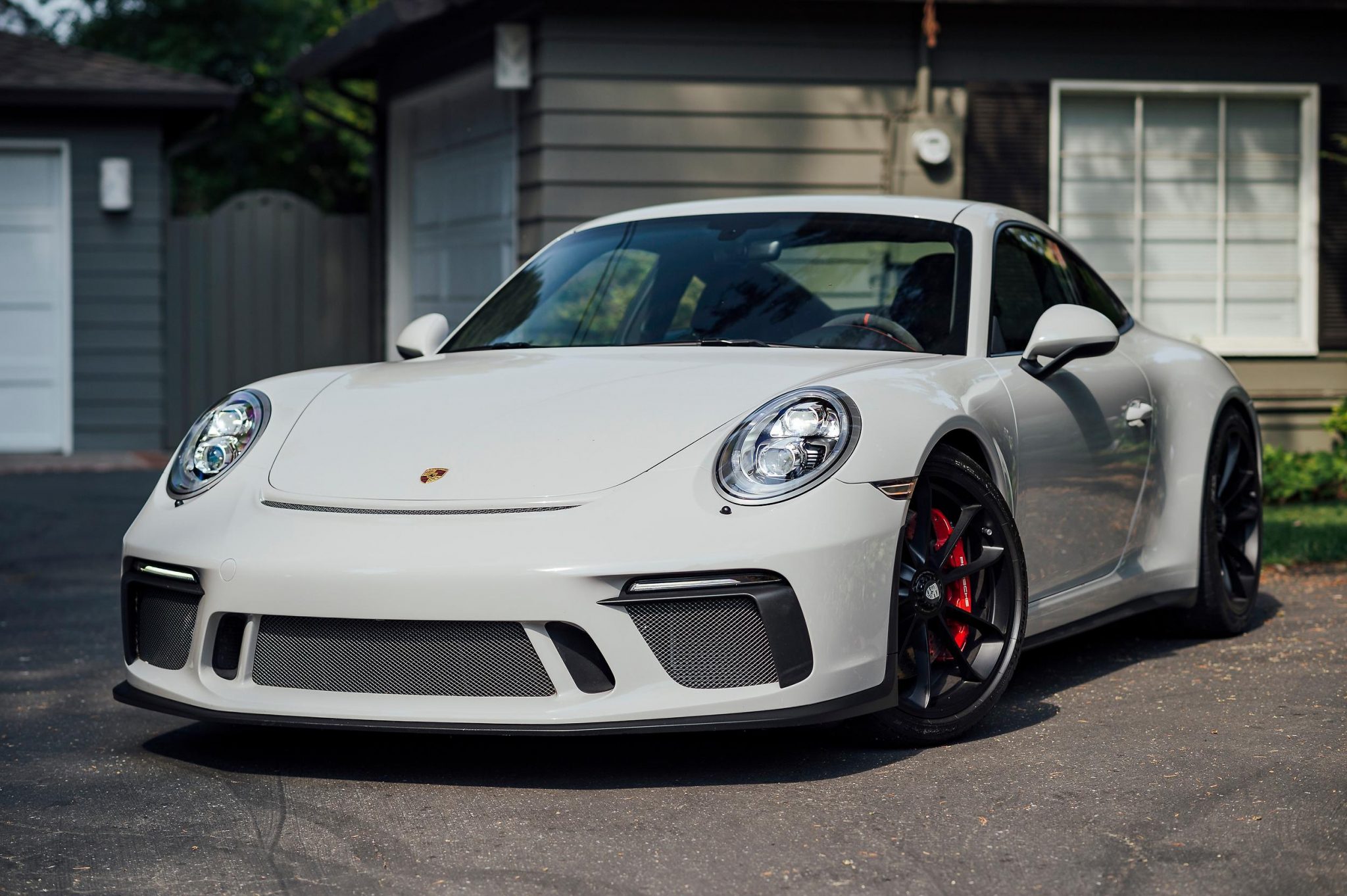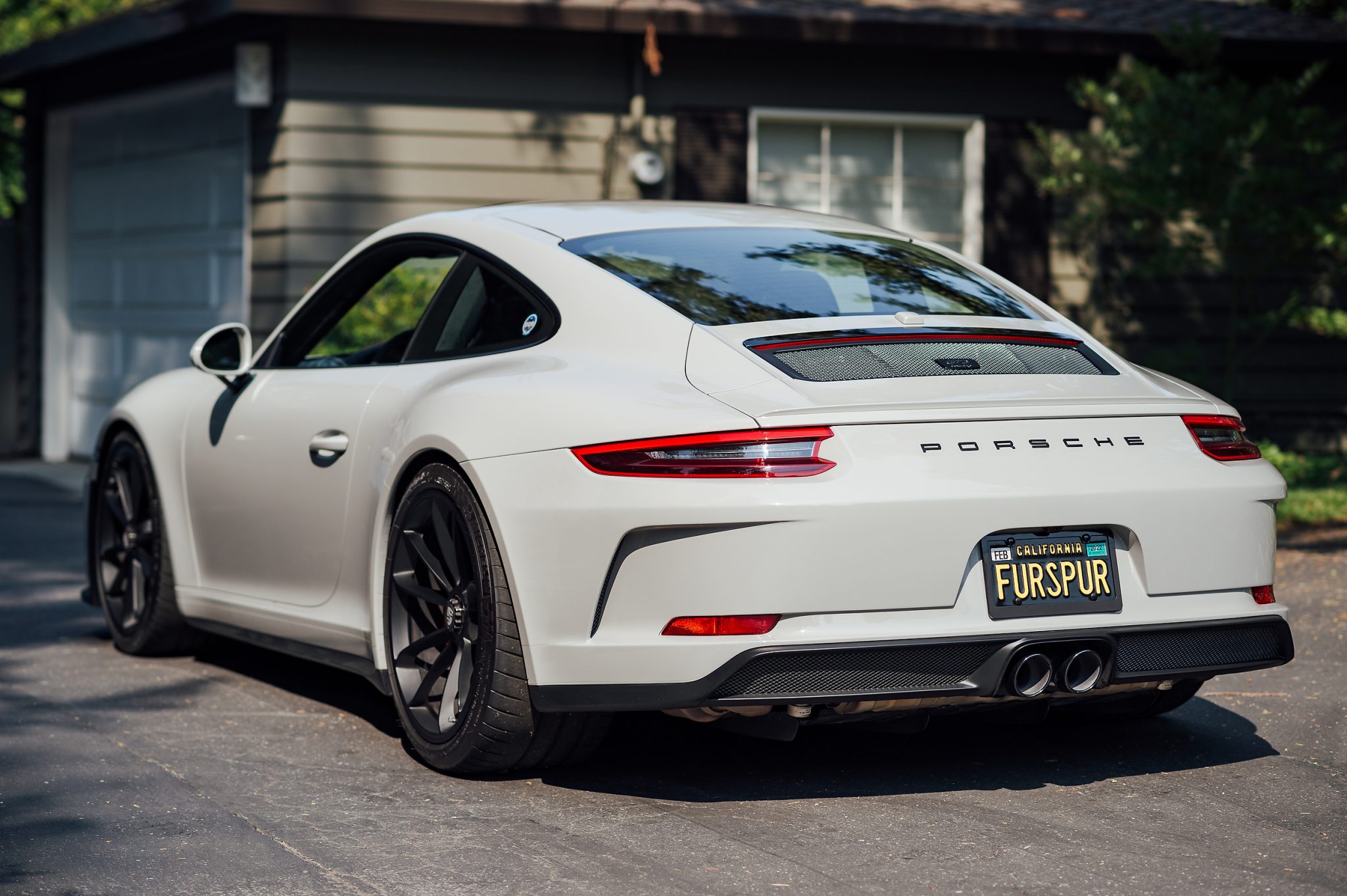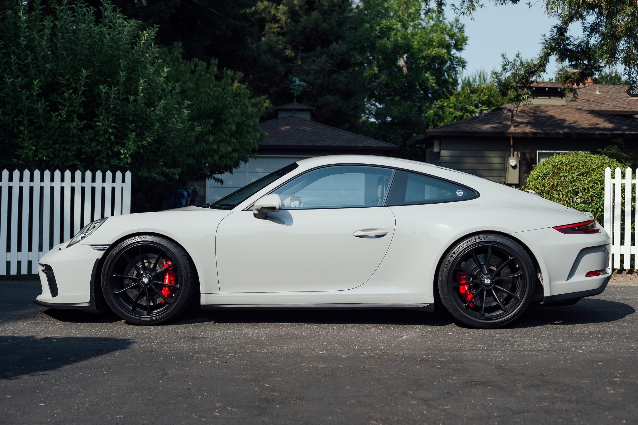 Satin Black-painted 20” center-lock wheels are mounted with Michelin Pilot Sport Cup 2 tires sized 245/35 up front and 305/30 out back. Stopping power is provided by red-painted calipers with white Porsche script with cross-drilled rotors at all four corners. A brake fluid flush was performed in January 2021 by Porsche Walnut Creek.