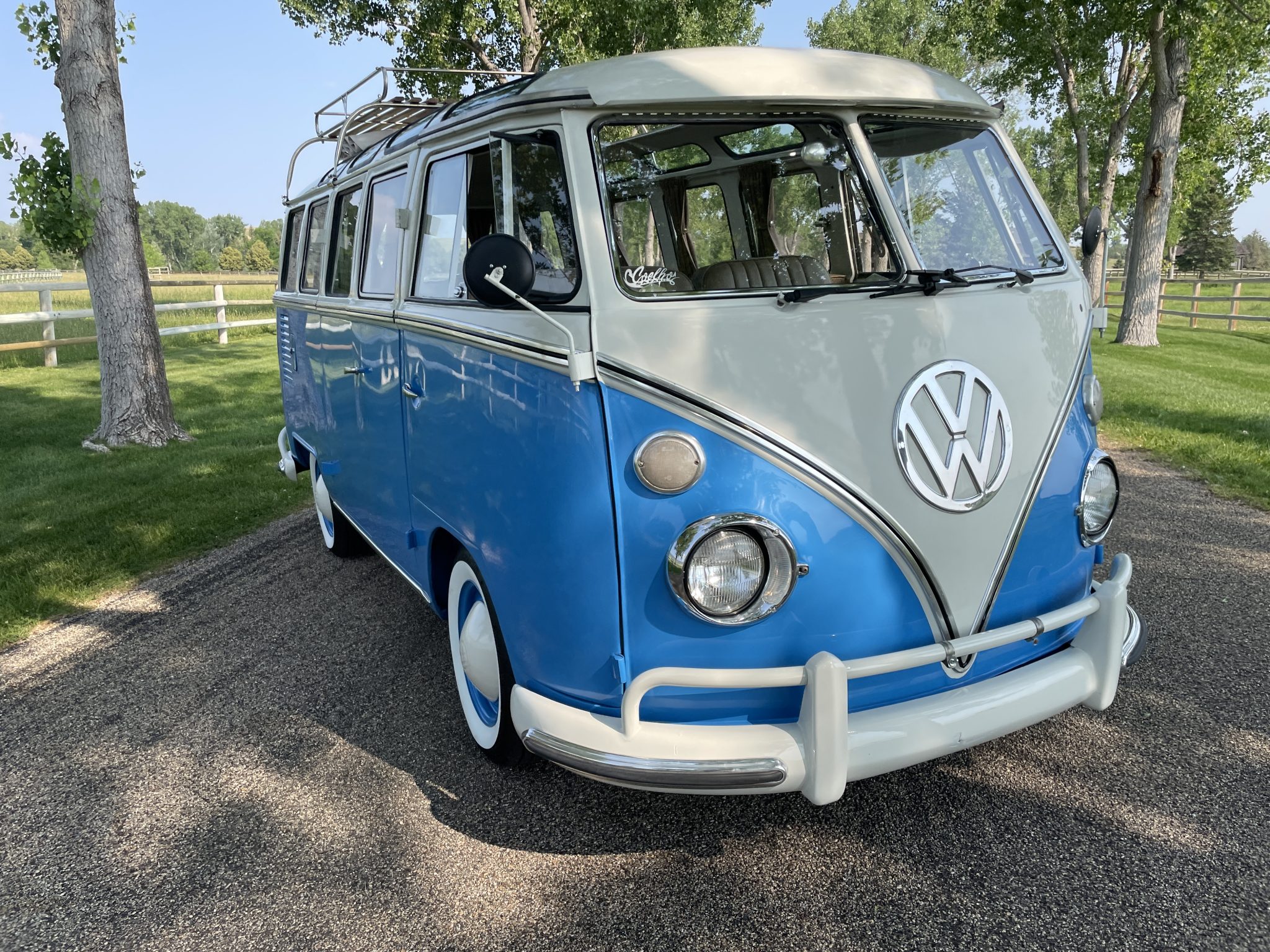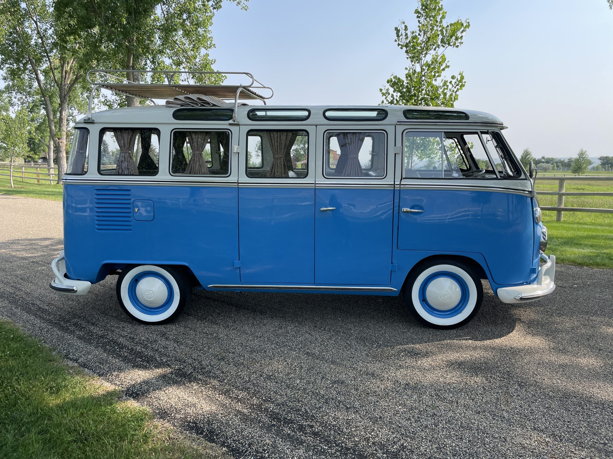 Blue-painted 14″ steel wheels wear white-painted VW-stamped hubcaps and are mounted with 185/75 BFGoodrich Silvertown whitewall tires.