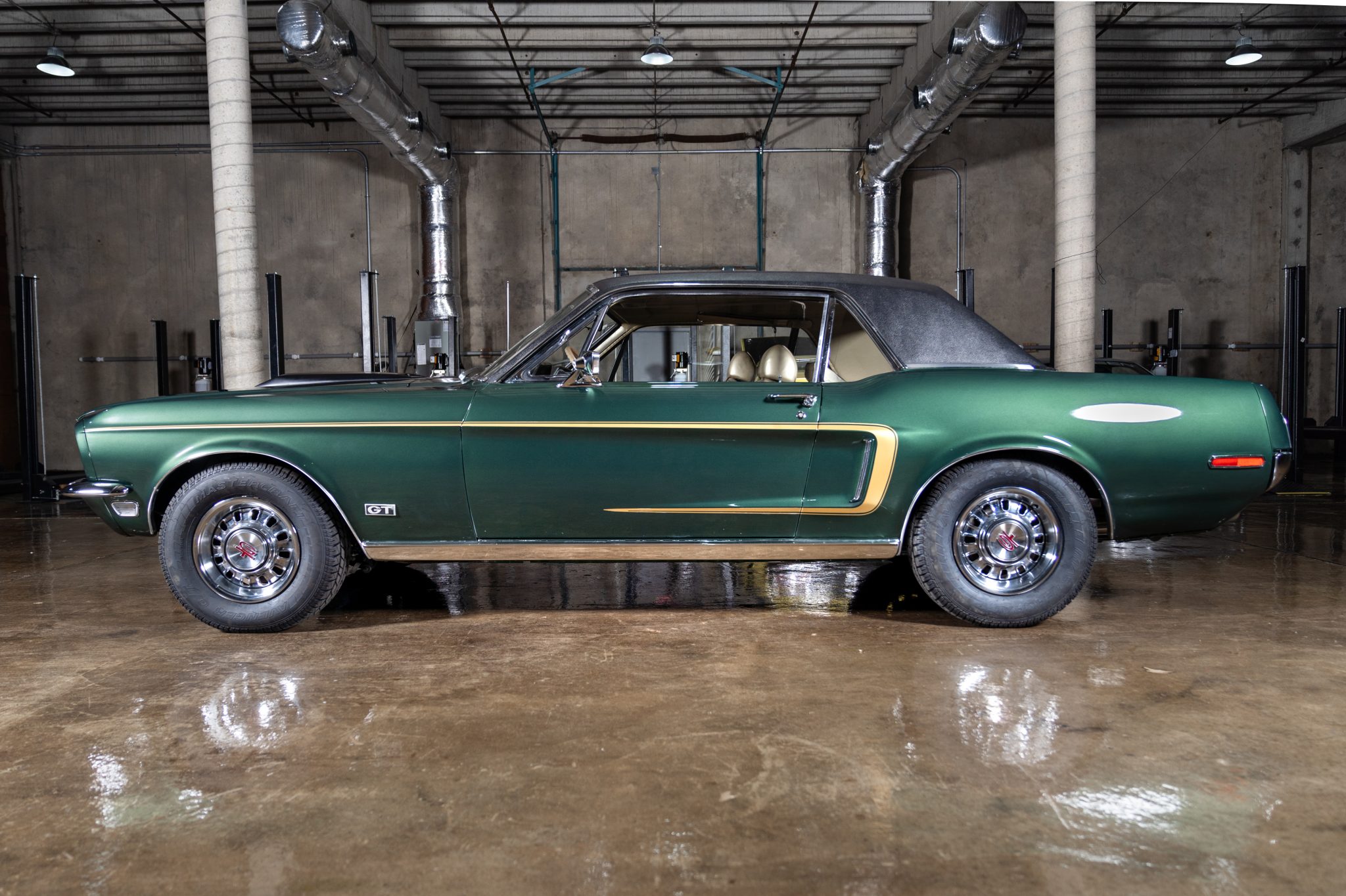 Stamped steel 14″ wheels wear beauty rings, GT hubcaps, and 225/70 Mastercraft tires. The car is equipped with power-assisted steering as well as front disc and rear drum brakes.