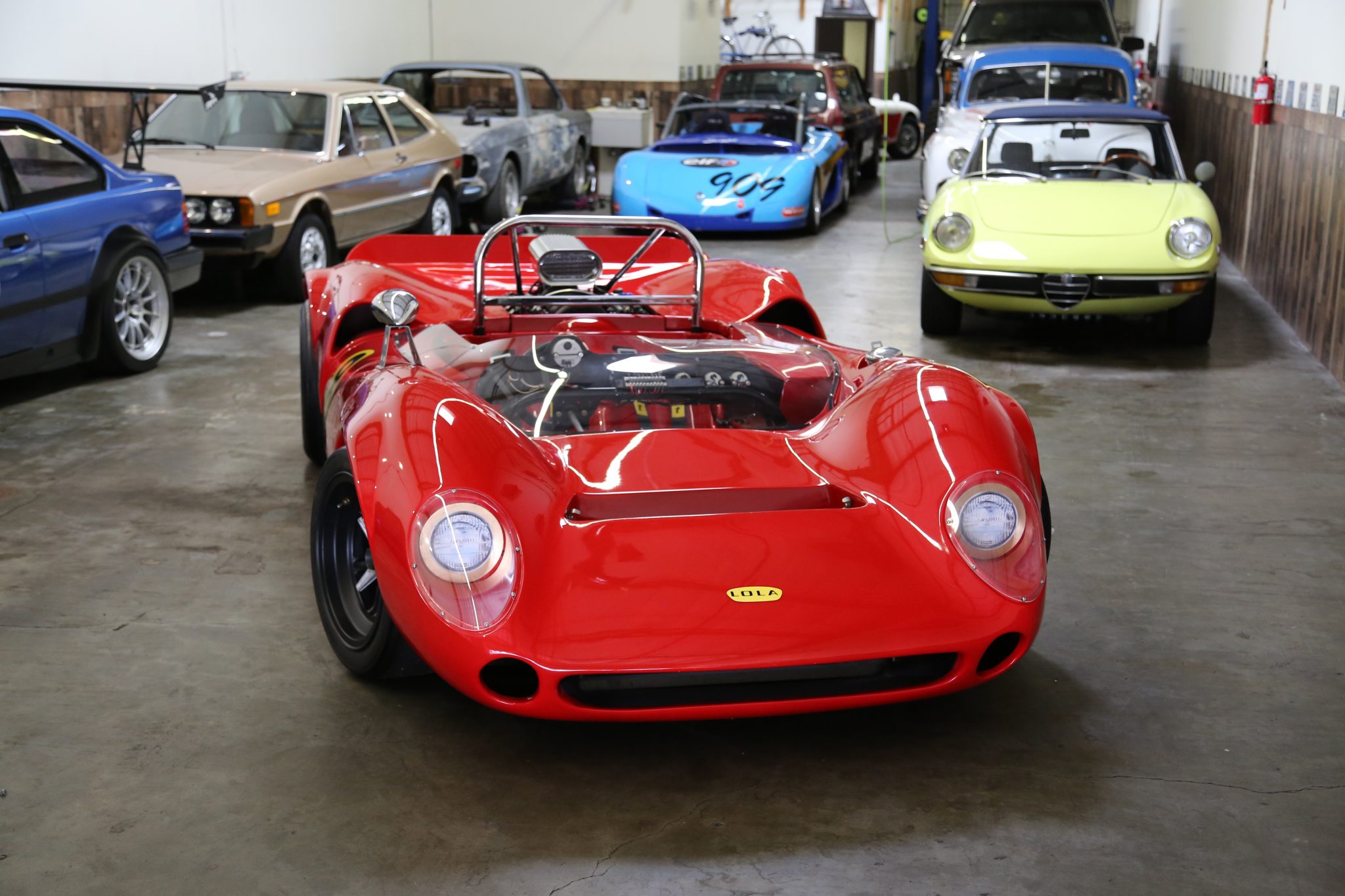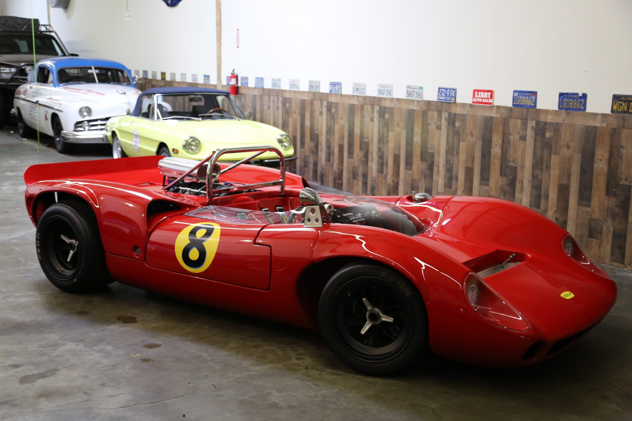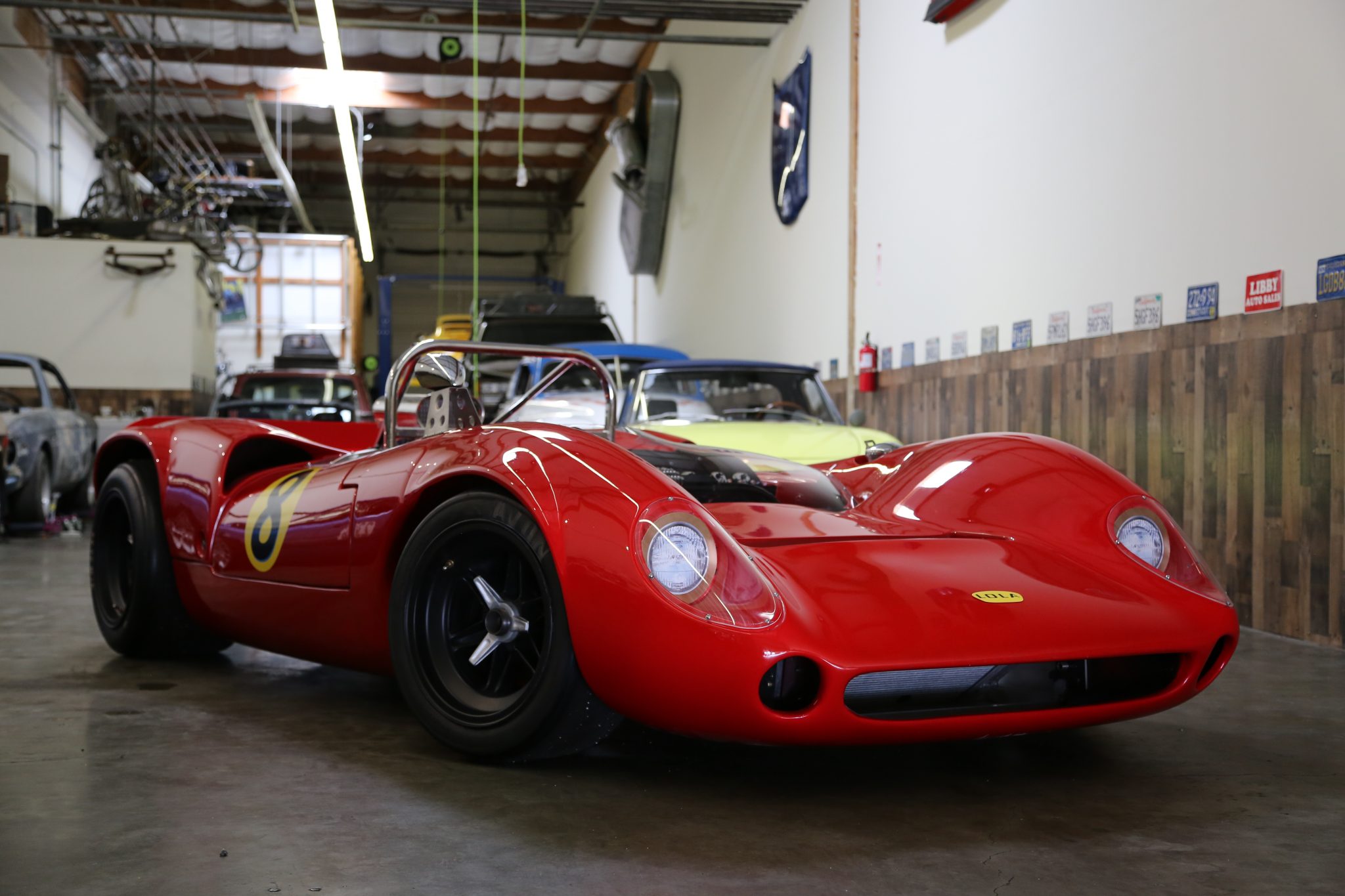 Black-painted wheels are secured by three-eared knock-off spinners and mounted with Avon slicks, and stopping power is provided by Wilwood discs at all four corners. Work performed by the seller’s shop included replacing the wheel bearings and installing the steering system as well as adjustable coilovers.
