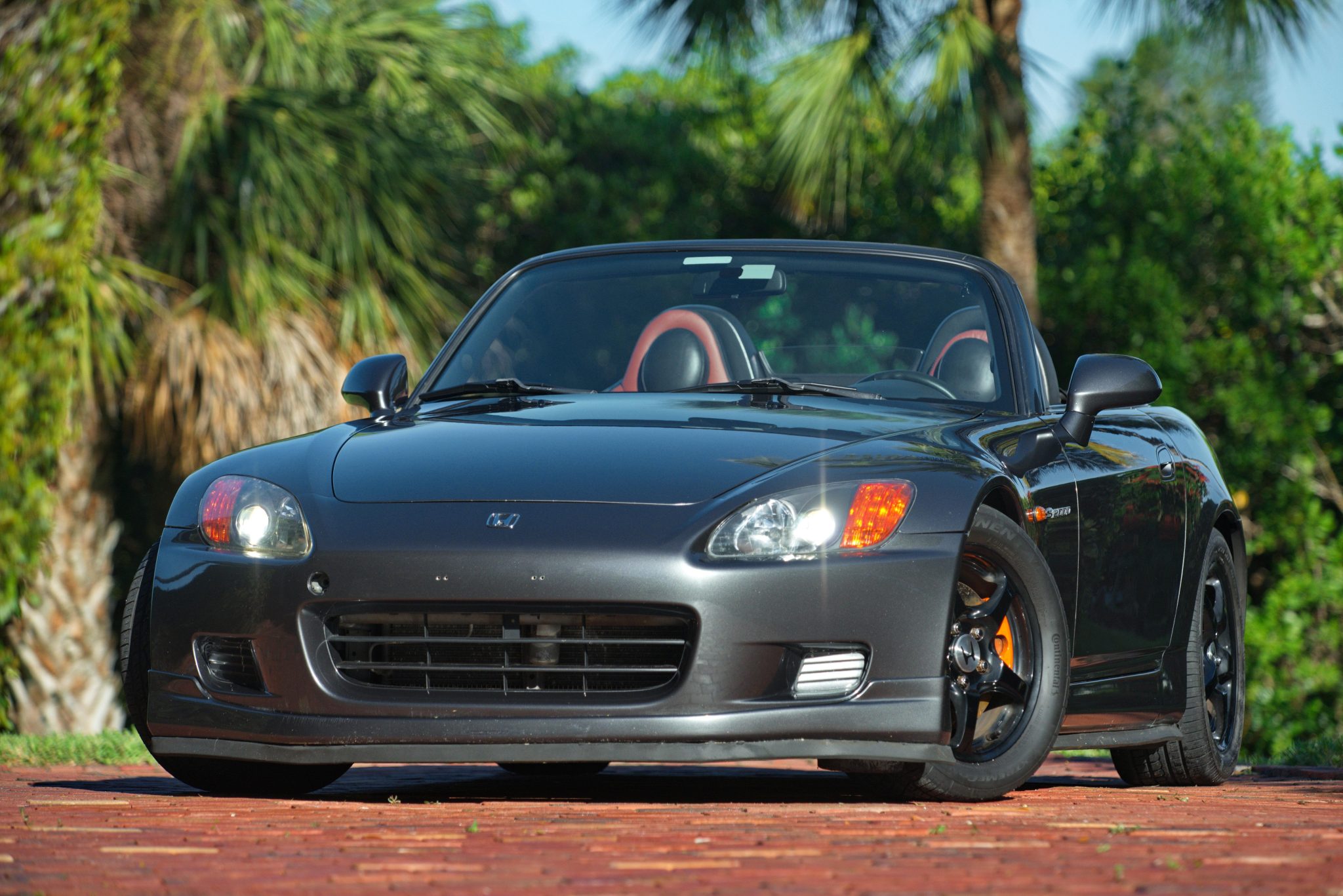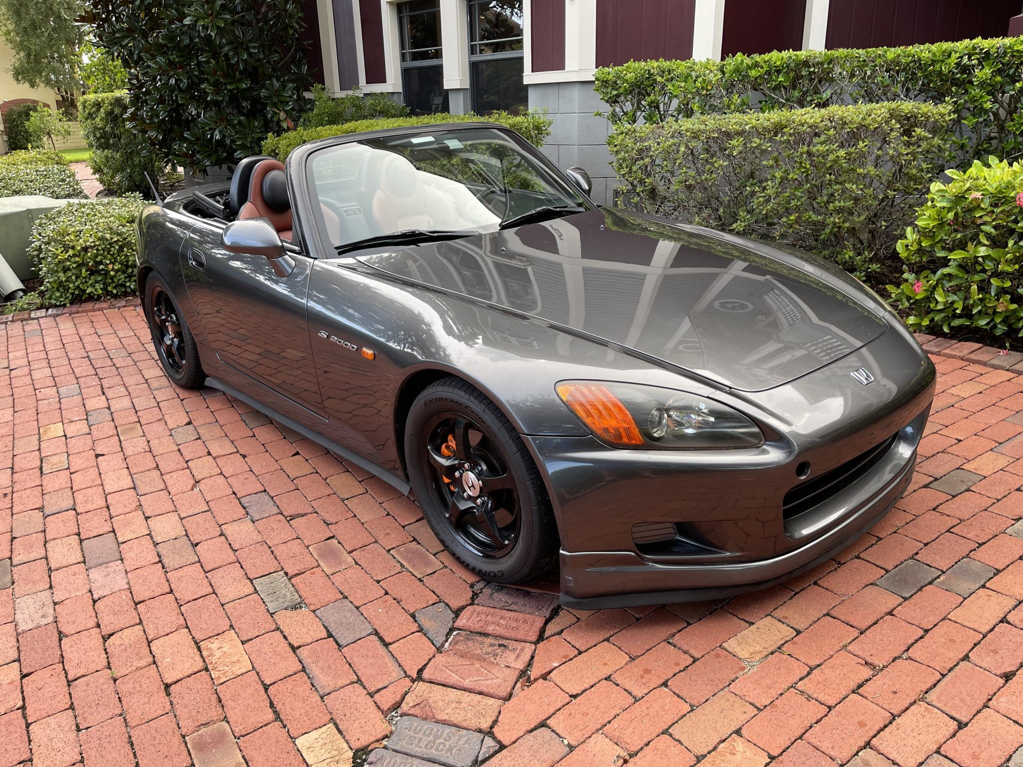 Black-finished 16″ wheels are mounted with staggered-width Pirelli and Continental tires that show date codes from 2016 and 2020. Braking is handled by four-wheel discs with orange-finished calipers, and the suspension has been modified with Buddy Club adjustable coilovers.