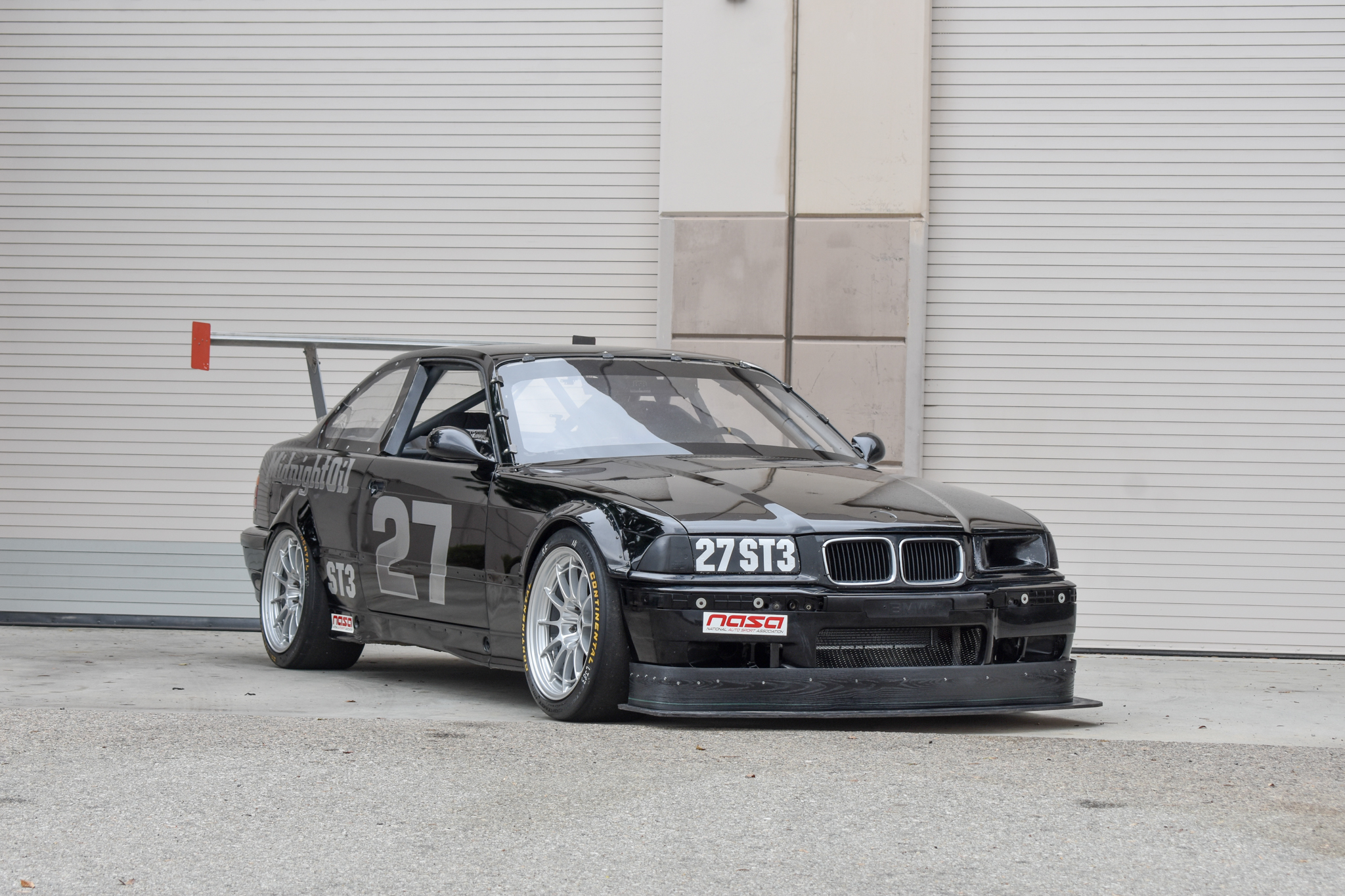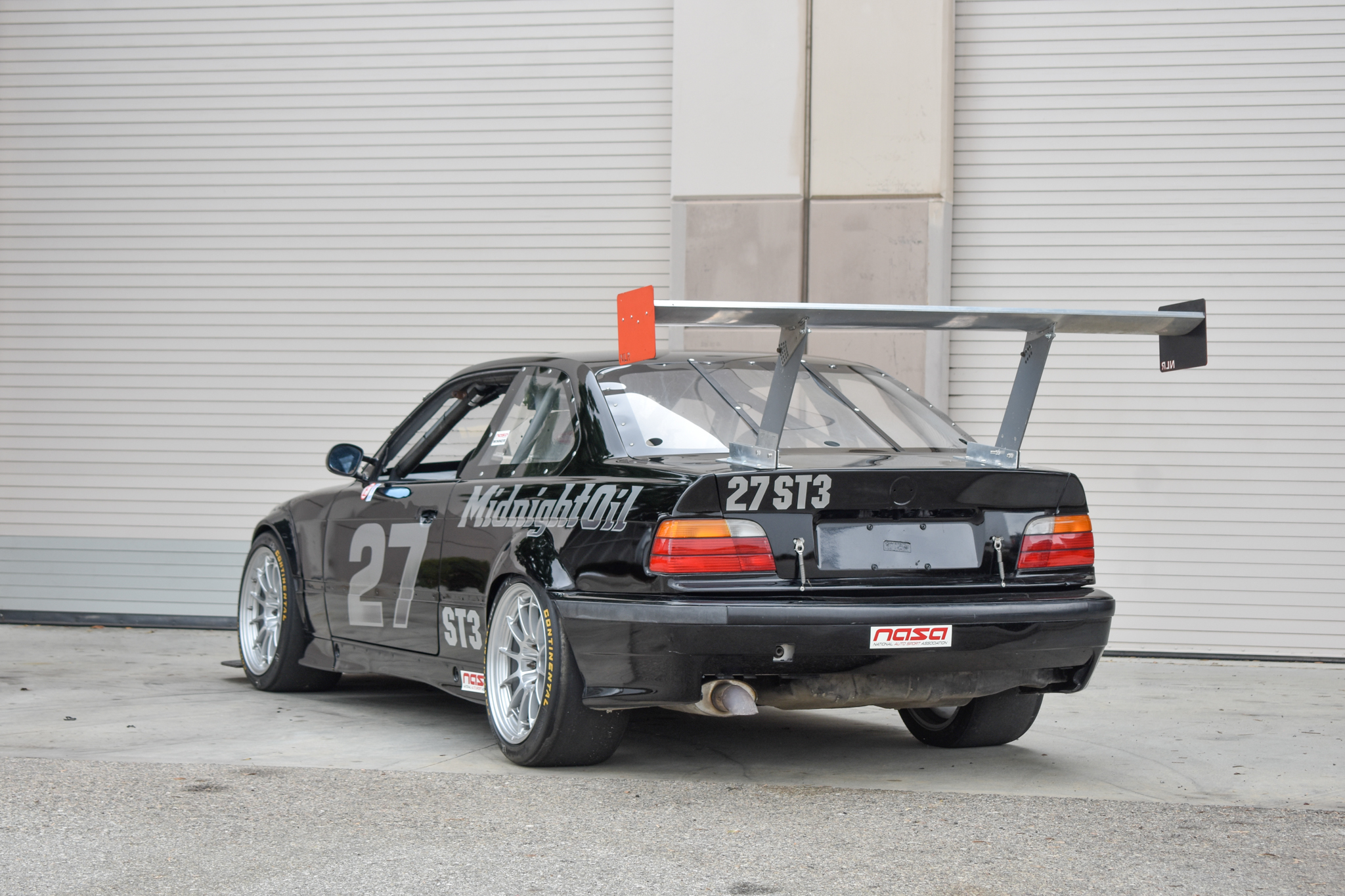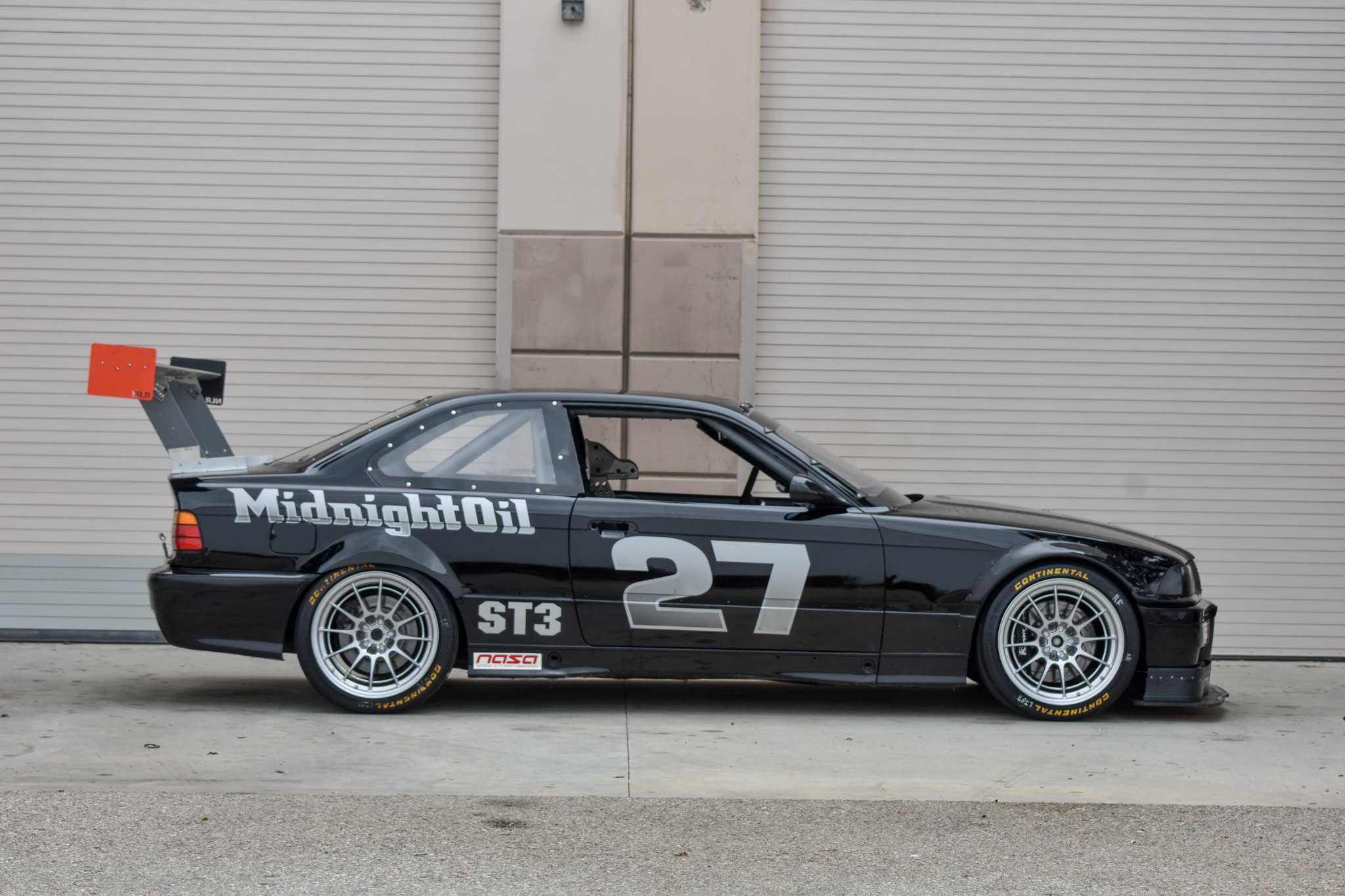 Silver-finished 18″ Enkei NT03+M wheels wear 275/35 Continental slick tires that show visible wear, and a set of uninstalled new Hoosier R7 slick tires is included in the sale. Stopping power is provided by four-wheel disc brakes with Ksport front calipers. The car’s suspension has been upgraded with Moton Clubsport remote coilovers, adjustable front camber plates, and adjustable rear lower control arms with heim joints.