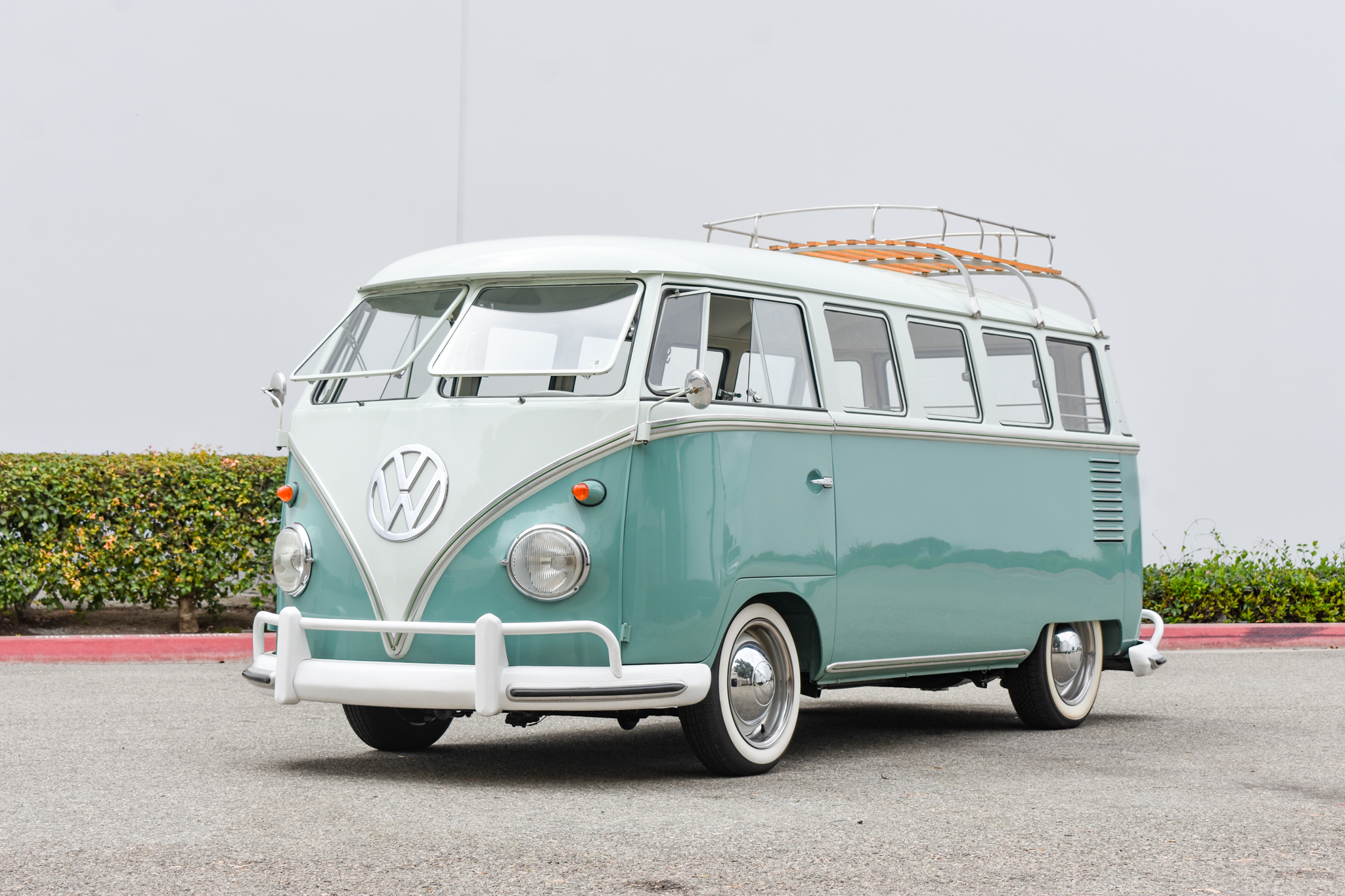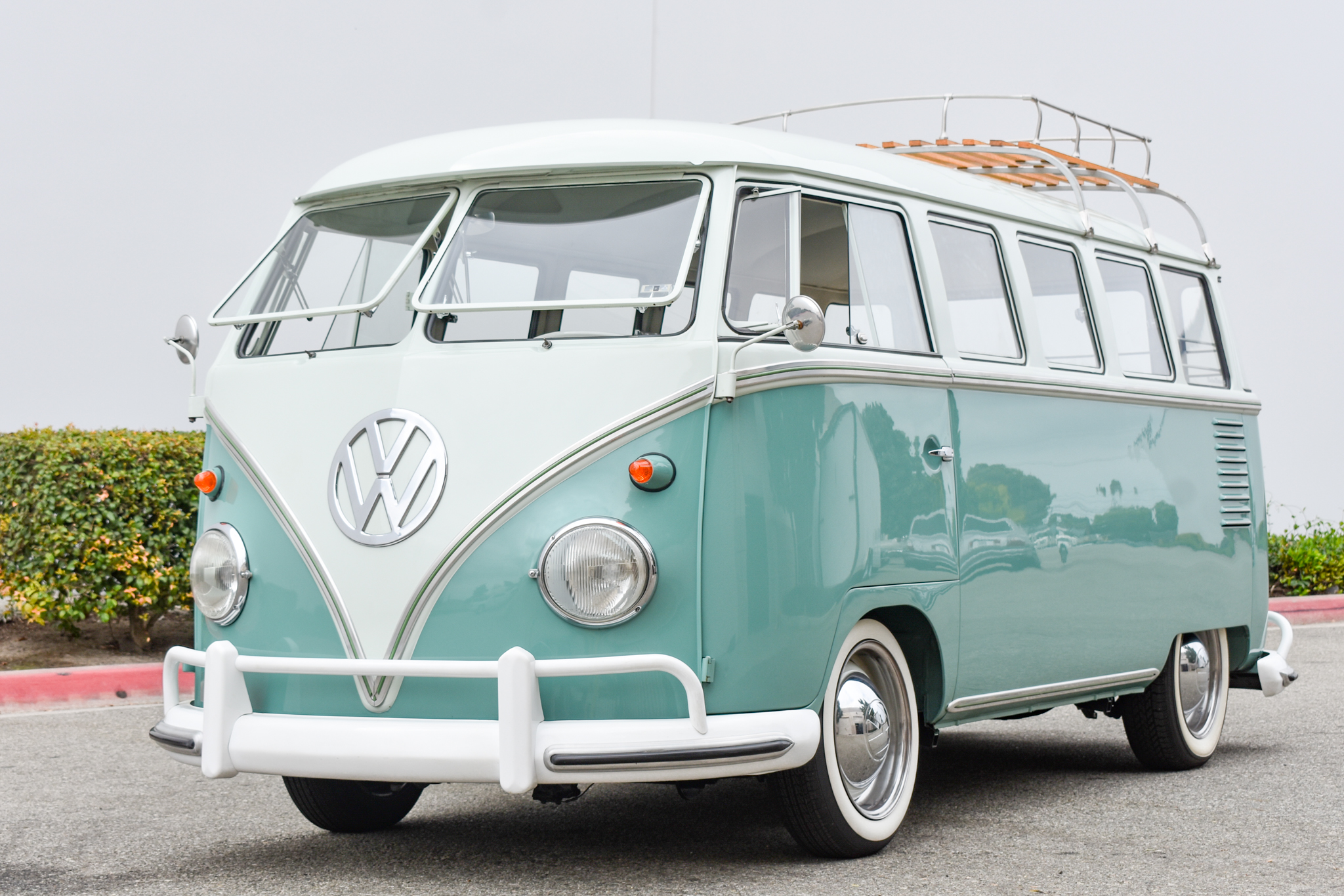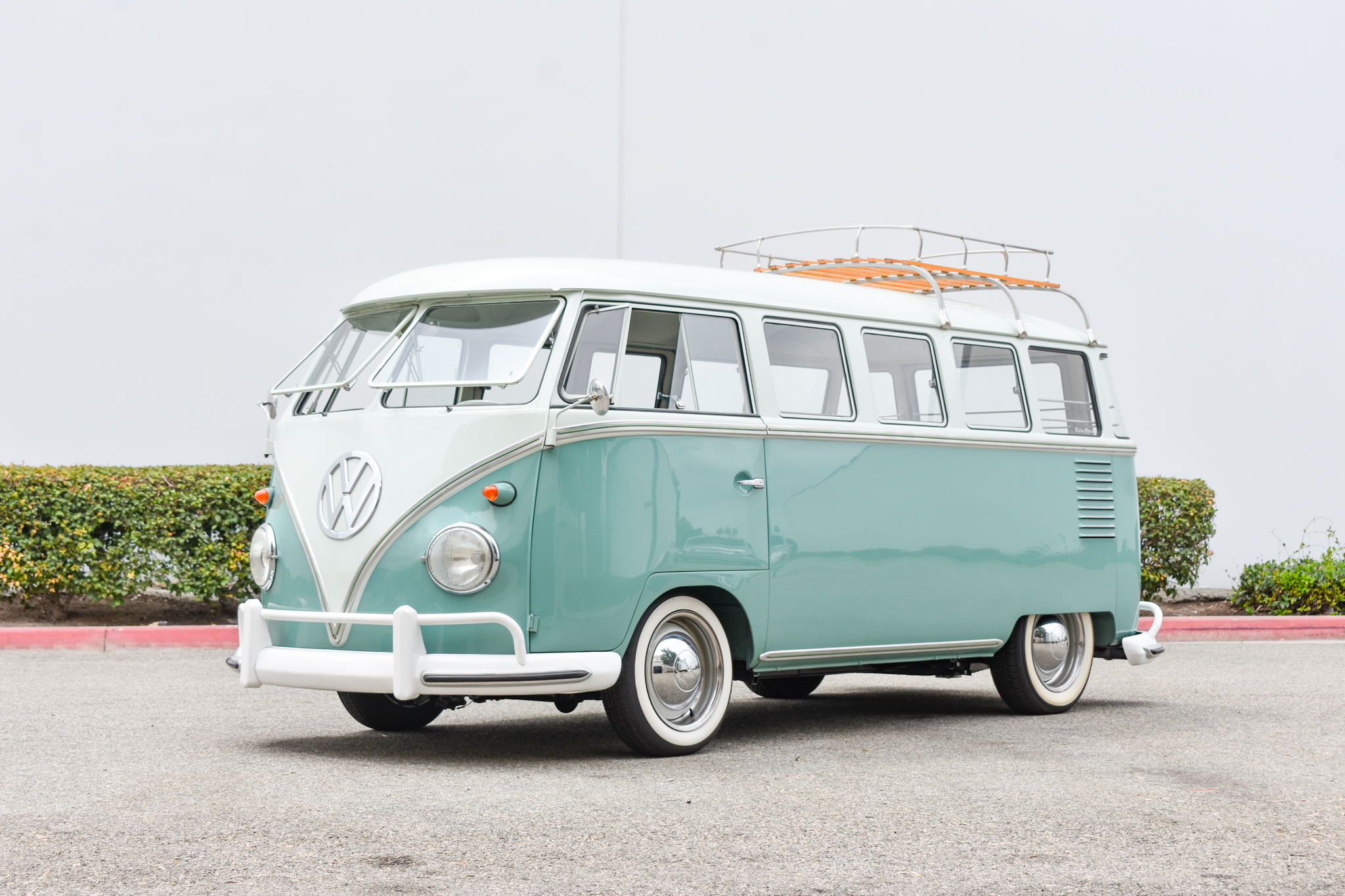 White-finished 15″ replacement steel wheels sourced from DeepVeez feature chrome hubcaps and beauty rings and are mounted with whitewall tires that were fitted in 2018. A lowered ride height was achieved utilizing a post-1967 narrowed front axle beam as well as adjustable rear swing-axle plates. Disc brakes are fitted at all four corners.