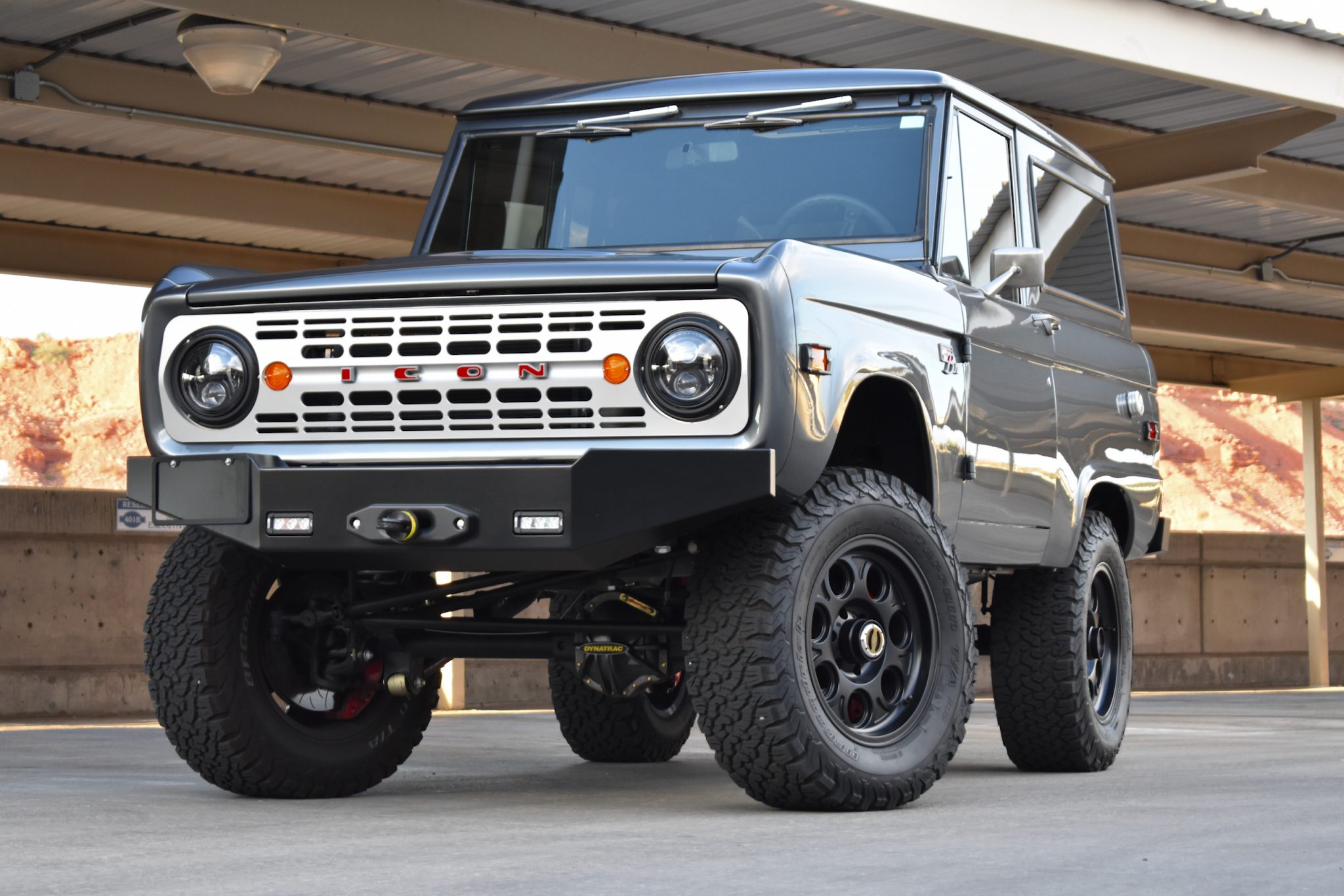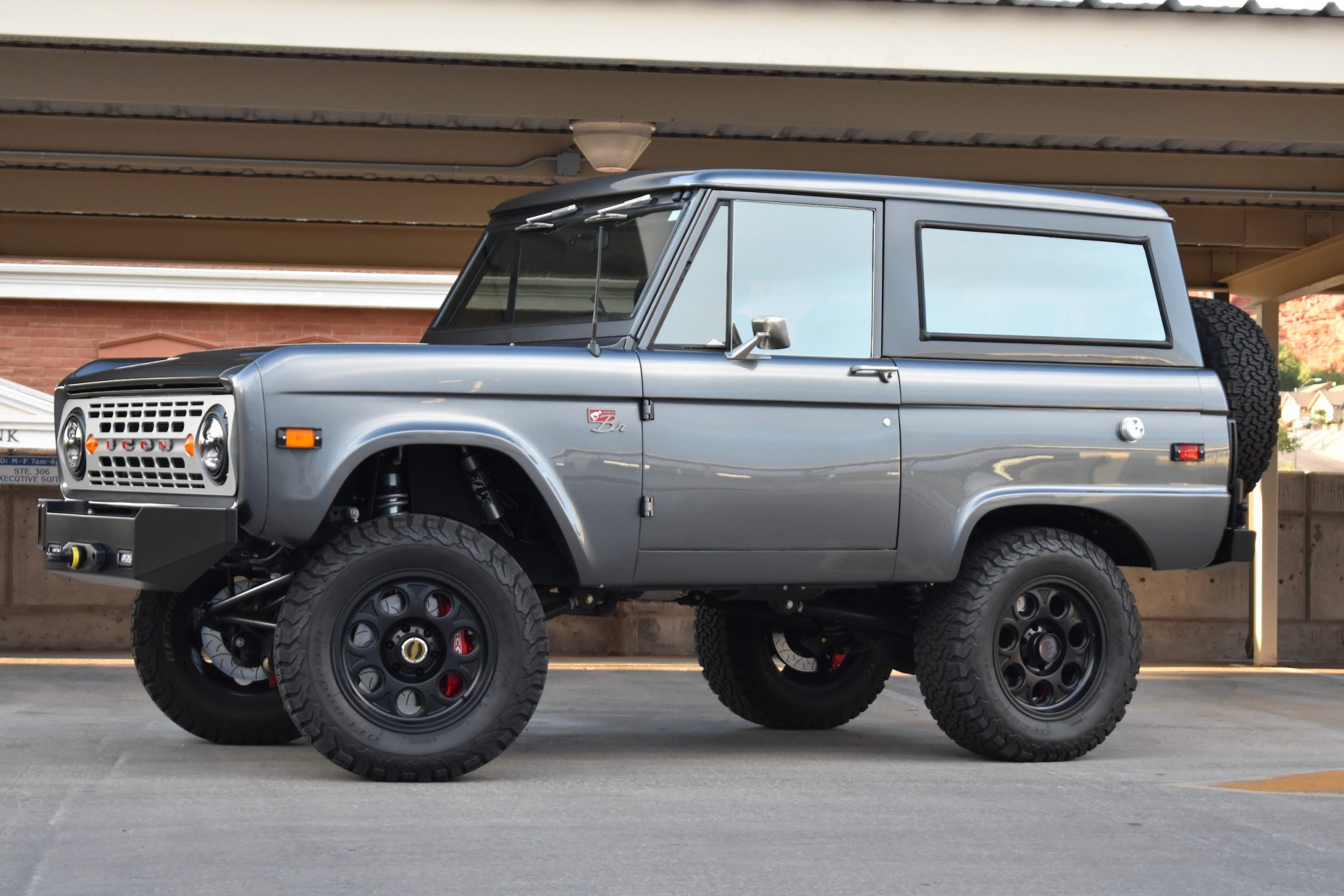 Satin black 18” wheels are wrapped in 285/65 BFGoodrich All-Terrain T/A tires. Braking is provided by Brembo multi-piston red calipers over slotted rotors at all four corners, and the truck is equipped with a Fox Racing sport suspension.