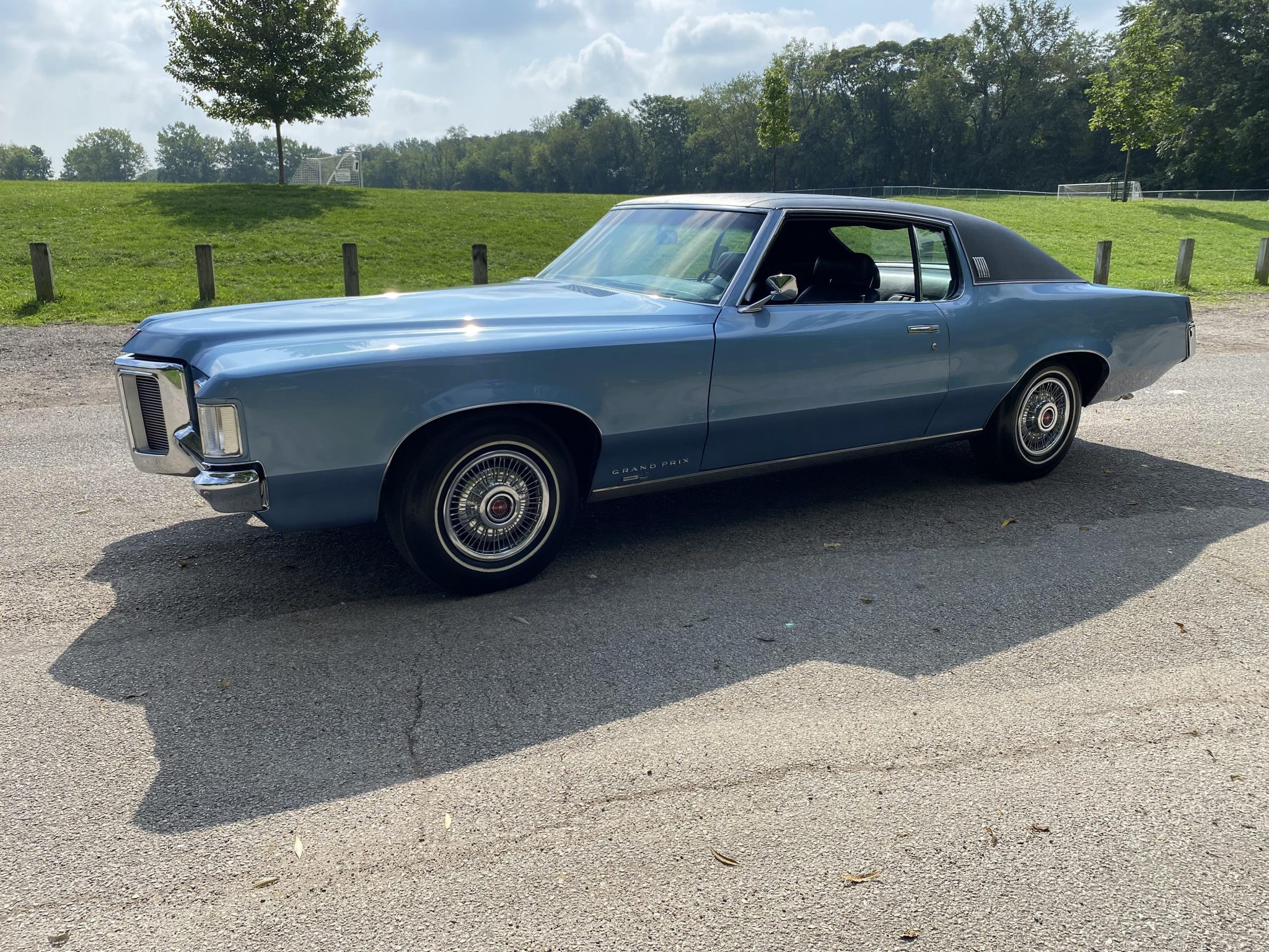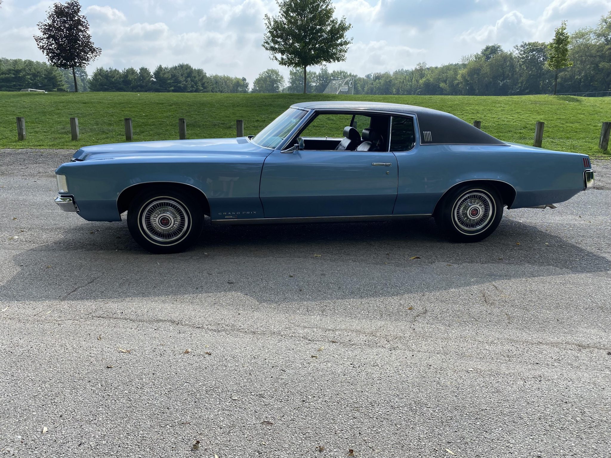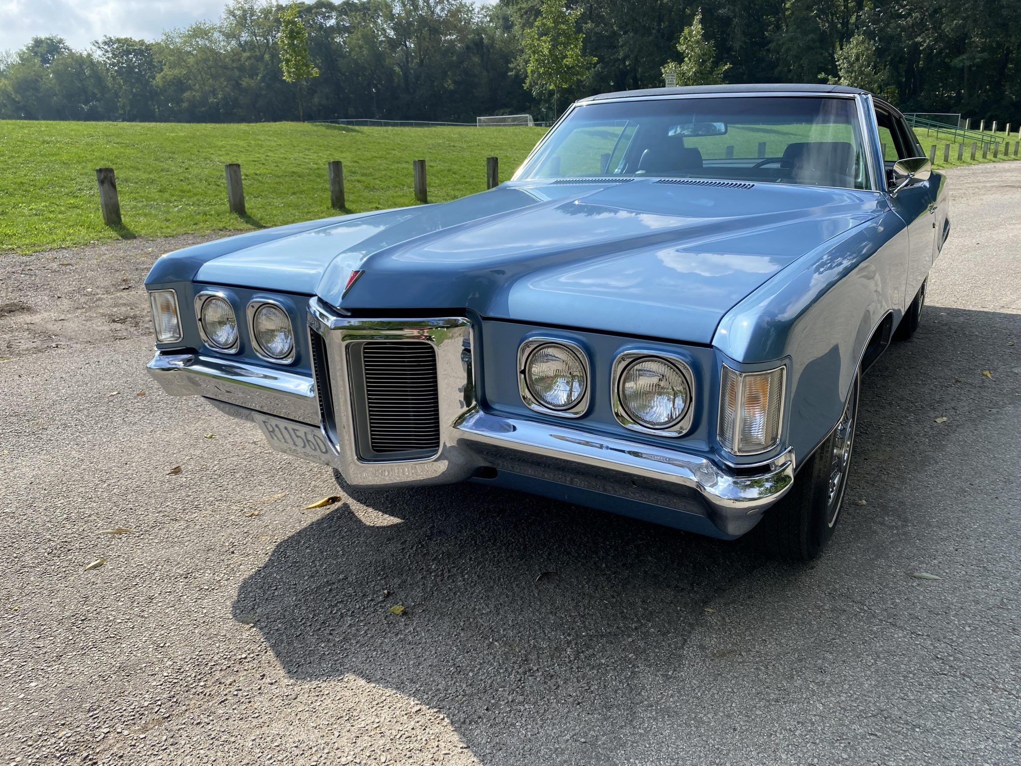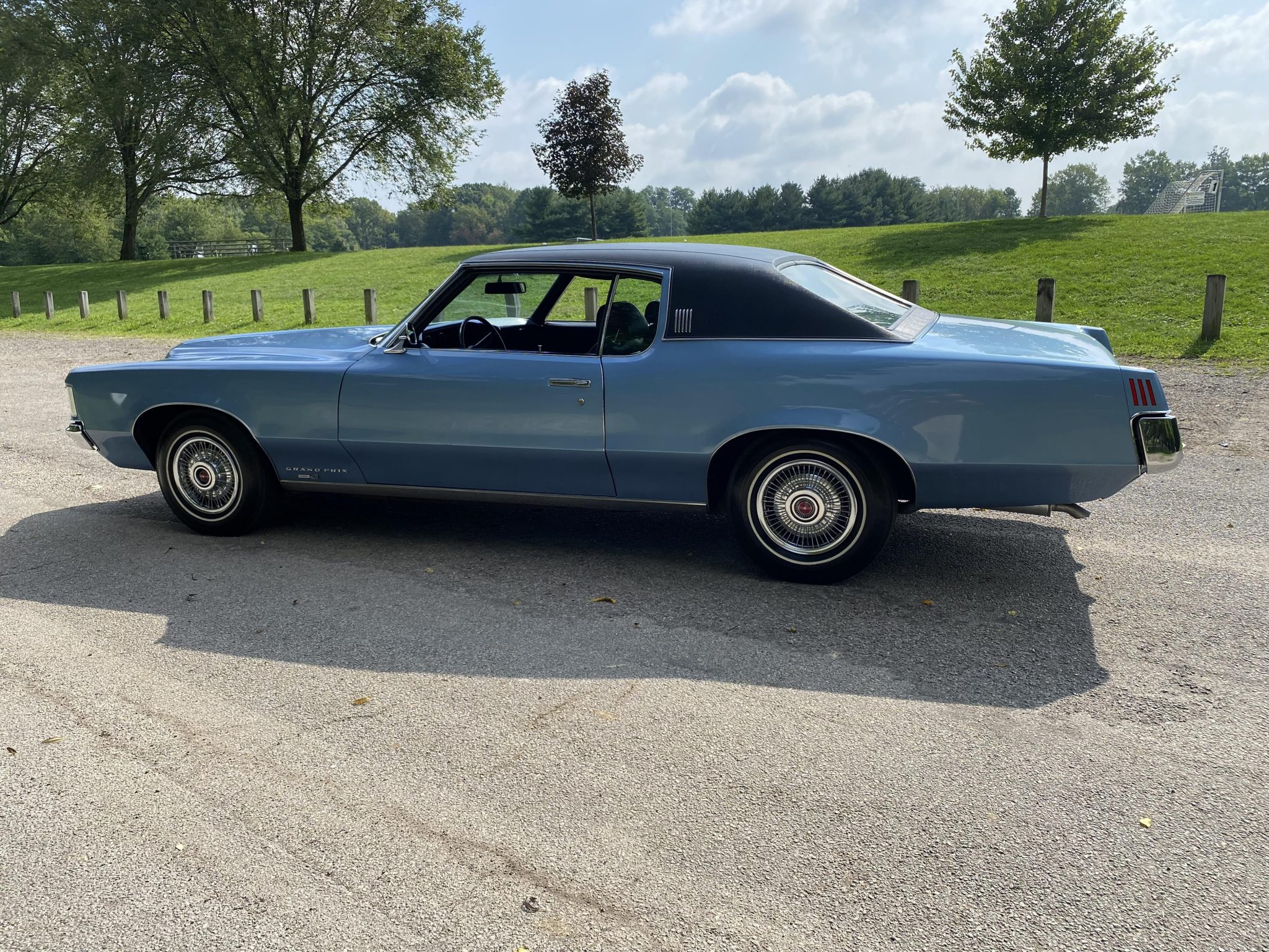 Factory 14″ steel wheels feature polished wire covers with red Pontiac center caps and wear Goodyear whitewall tires. The car was factory equipped with power steering and front disc brakes.