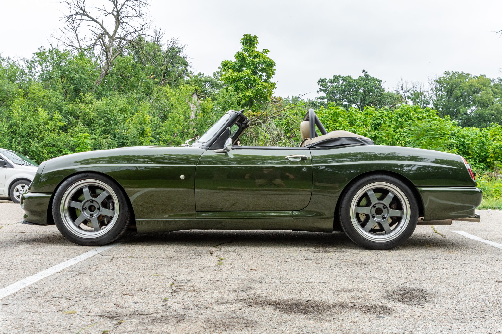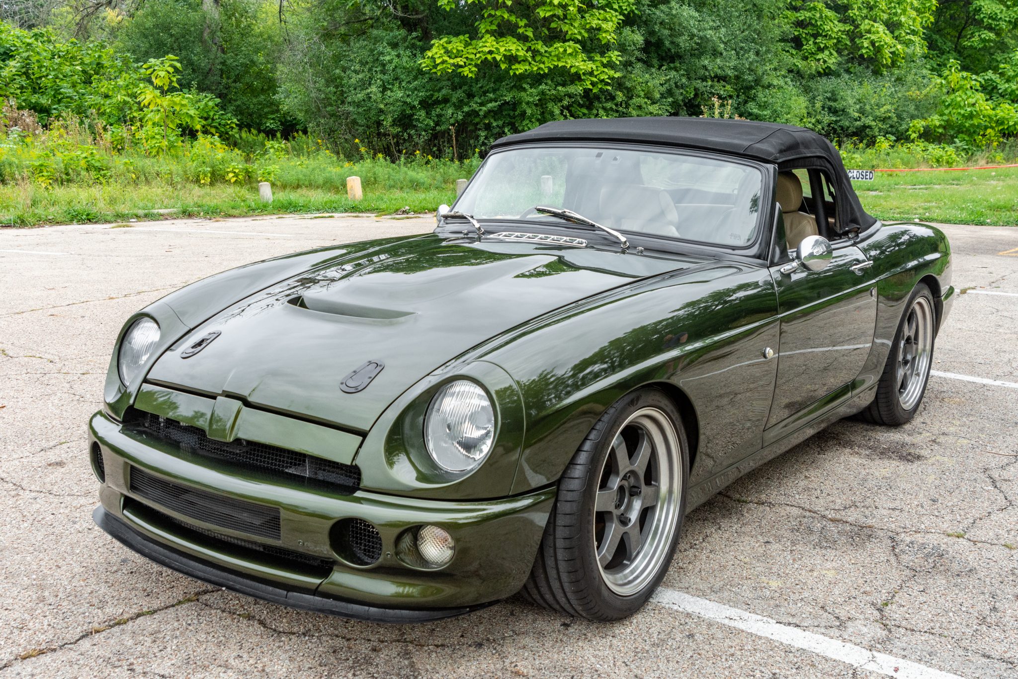 Gray-finished 17″ six-spoke wheels are mounted with 245/40 Goodyear Eagle F1 tires, which the seller states are in need of replacement. The braking system is modified with Wilwood calipers and slotted rotors at all four corners, and a brake-bias adjustment knob is mounted in the interior to the right of the steering wheel.