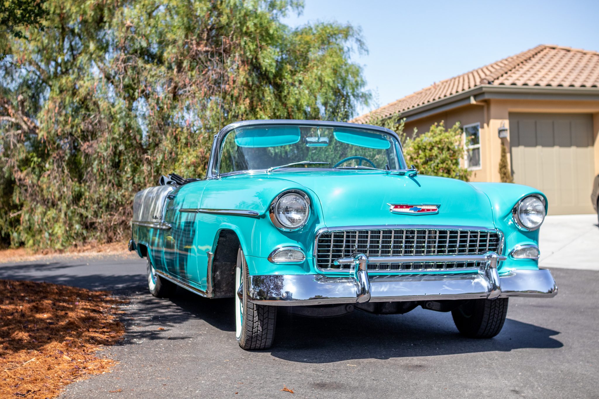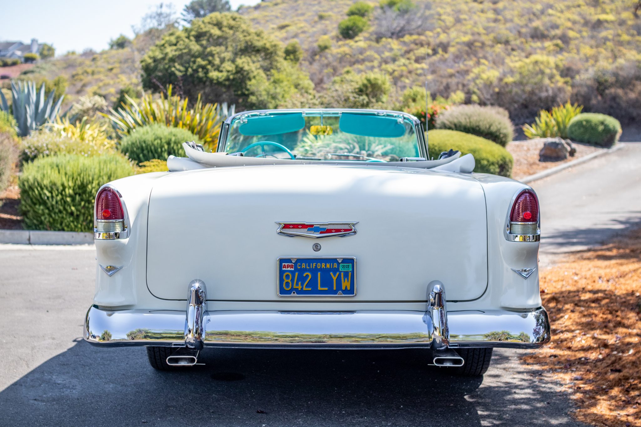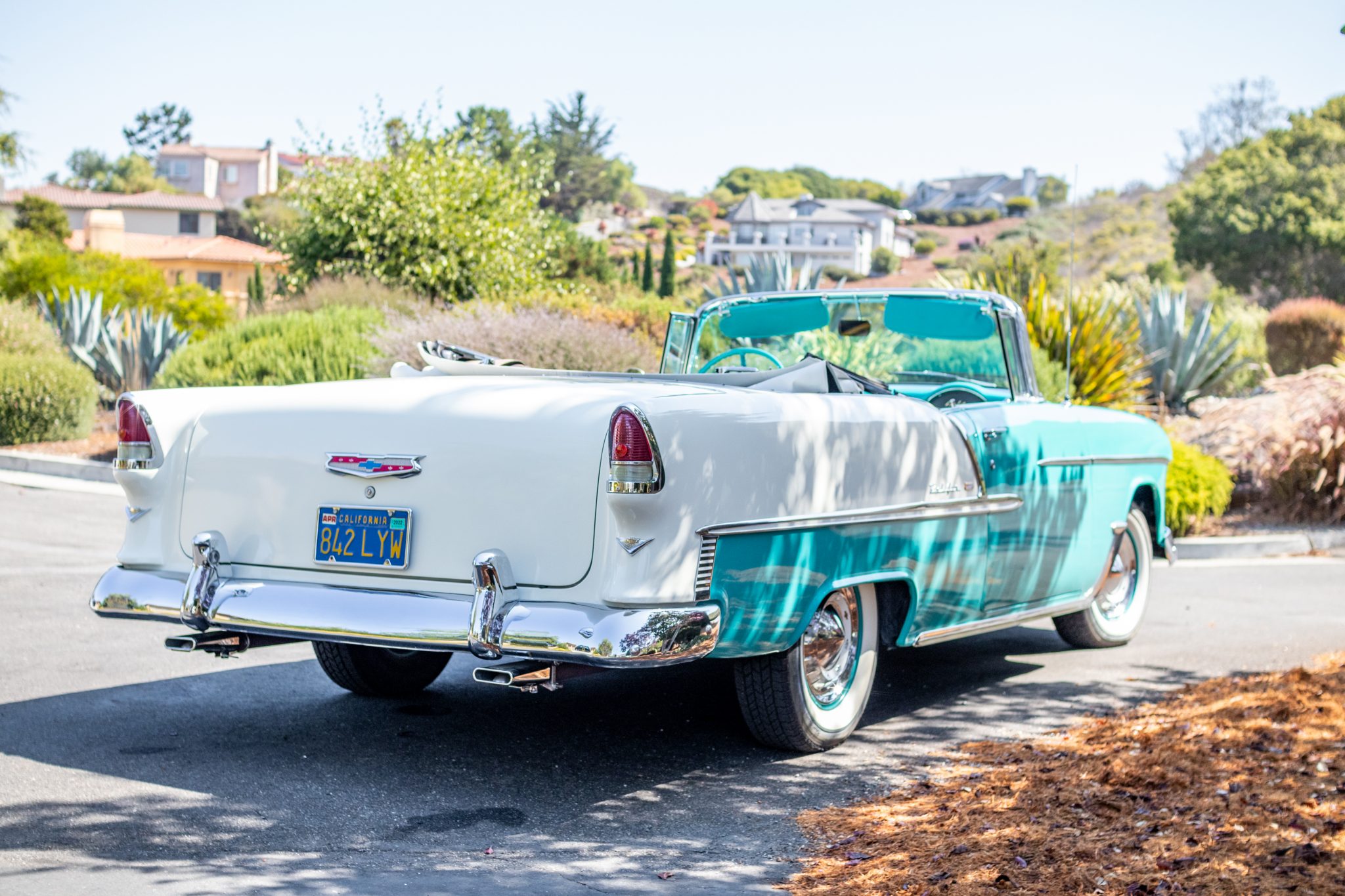 The white soft top was installed under current ownership. The 15″ steel wheels are finished in turquoise and are mounted with 205/75 Coker Classic whitewall radial tires. A matching spare wheel is mounted in the trunk. The suspension features front coil springs and rear leaf springs, and braking is handled by four-wheel drum brakes actuated by a single-pot master cylinder.