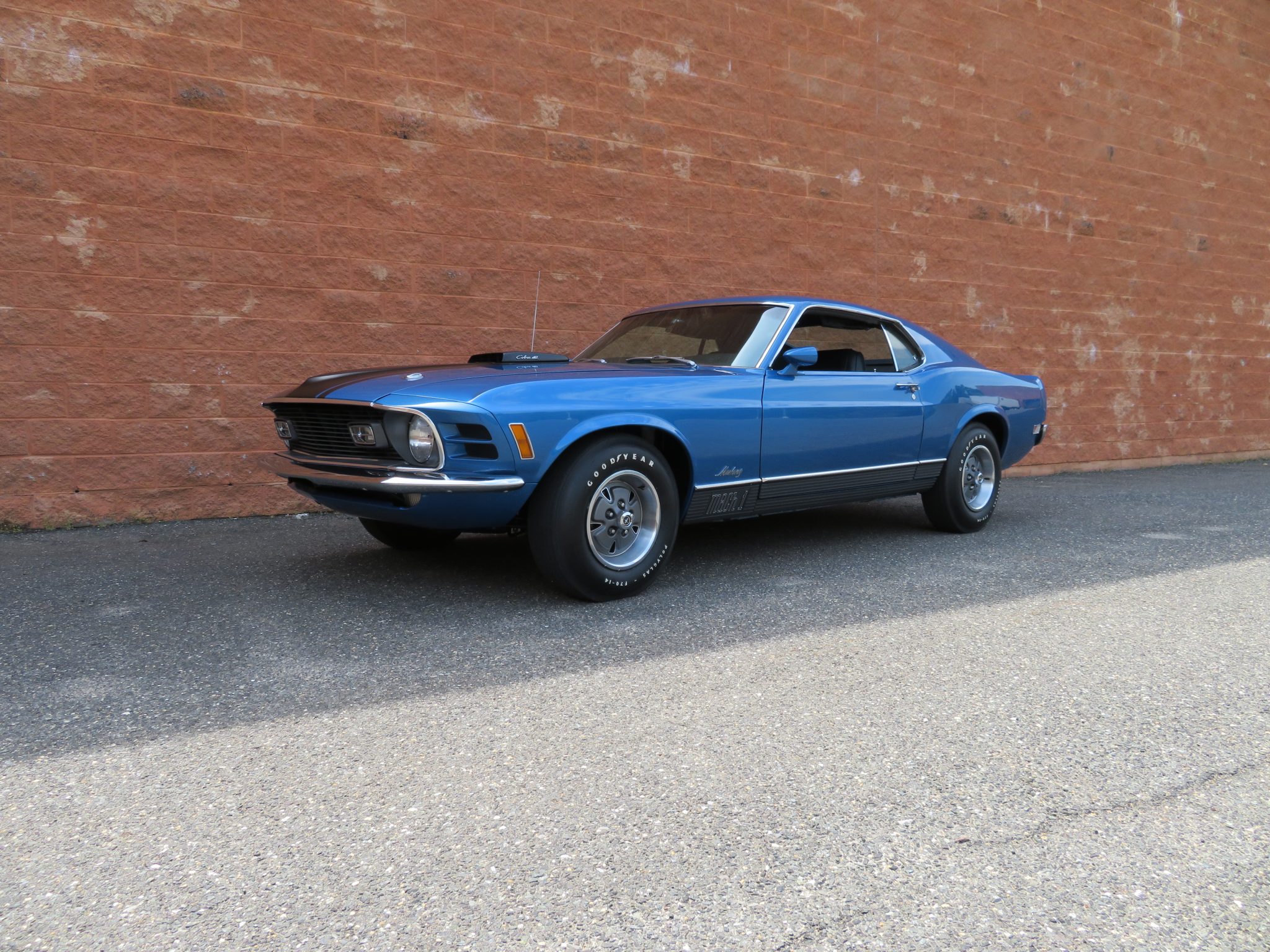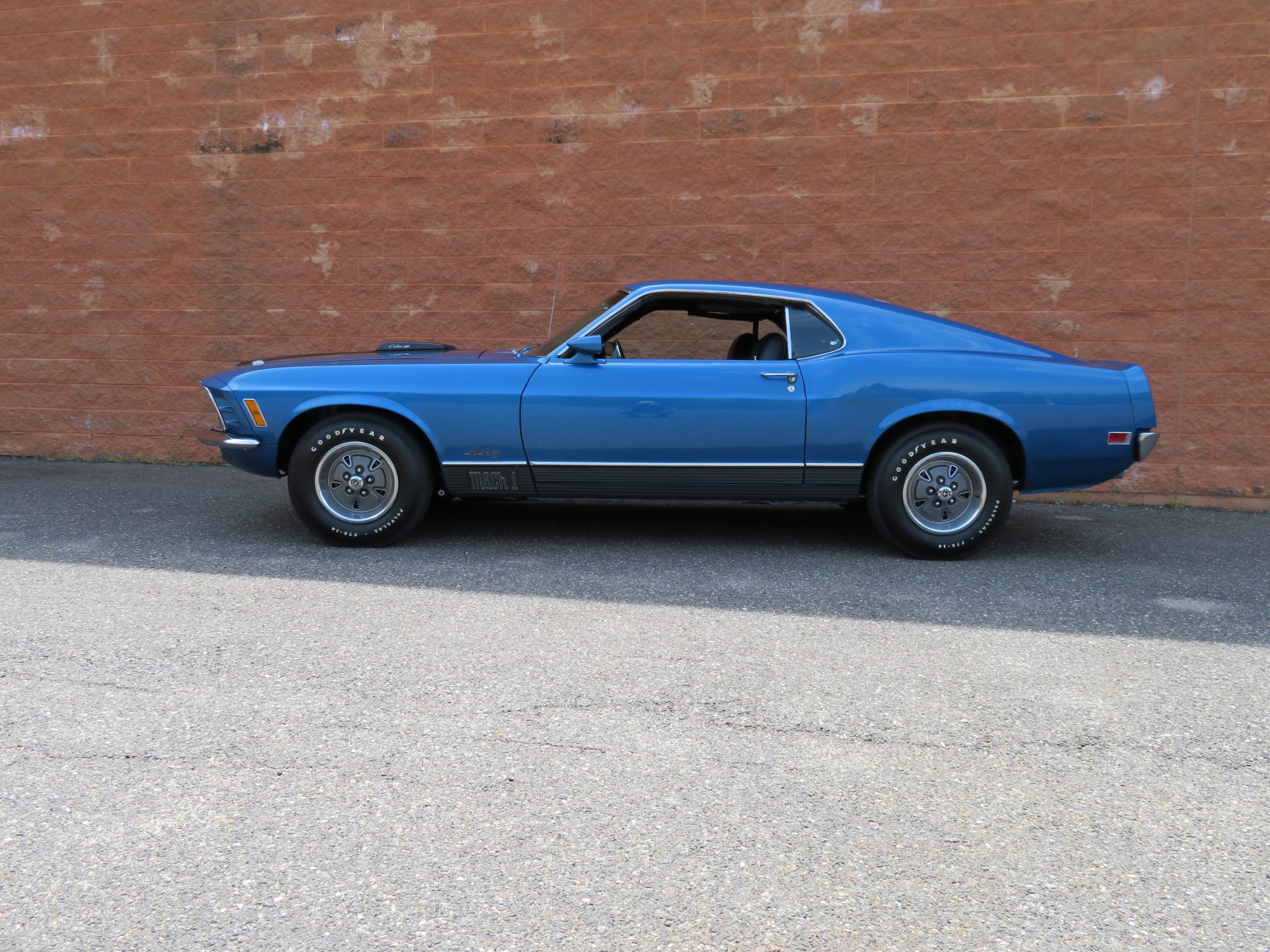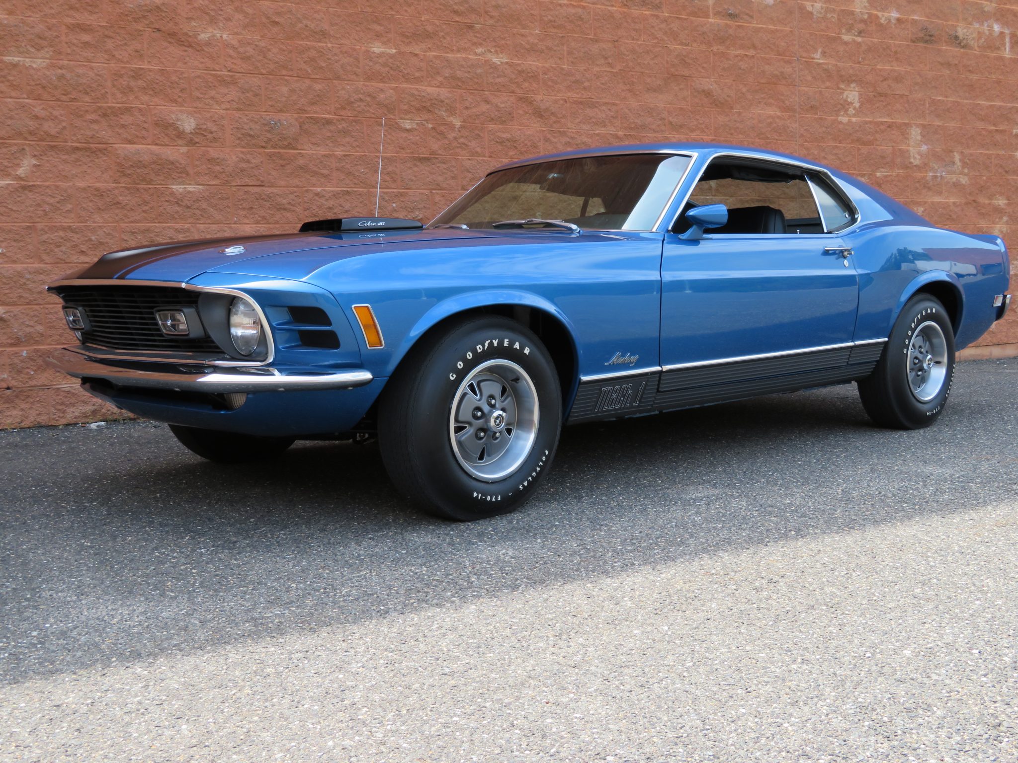 The 14″ steel wheels feature mustang logo center emblems and wear Goodyear Polyglas white-letter tires. The car is equipped with factory power steering along with disc brakes up front and drums in the rear. A full-size spare wheel is stored in the trunk.