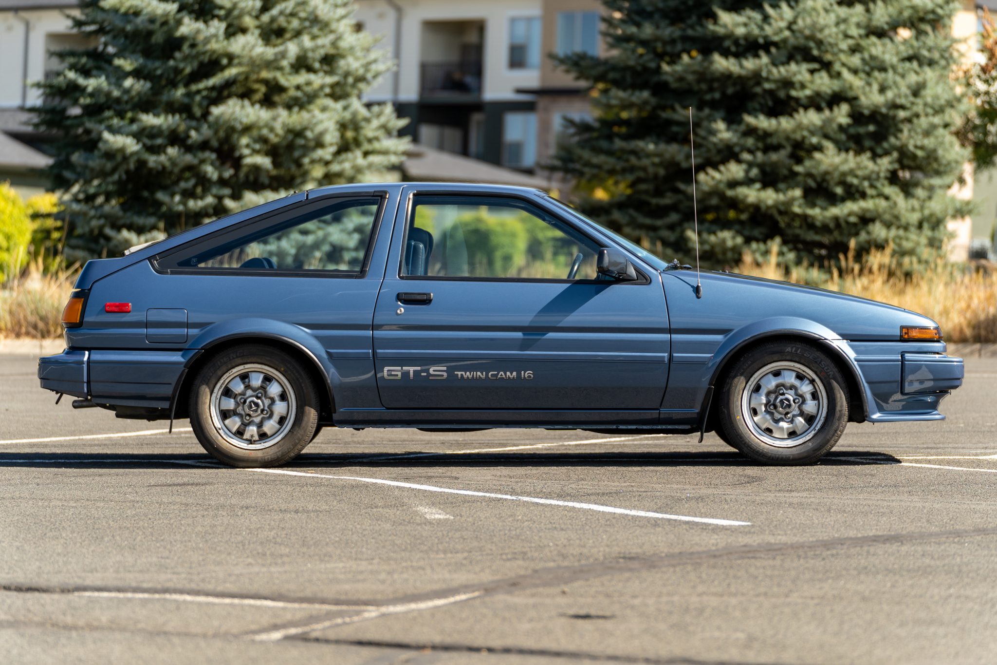 Steel 14″ wheels with vintage-style Toyota-logo center caps are mounted with 185/65 Caldera Confidence C3 tires. The car was optioned with variable-rate power steering, and the suspension and braking components were replaced during the refurbishment.
