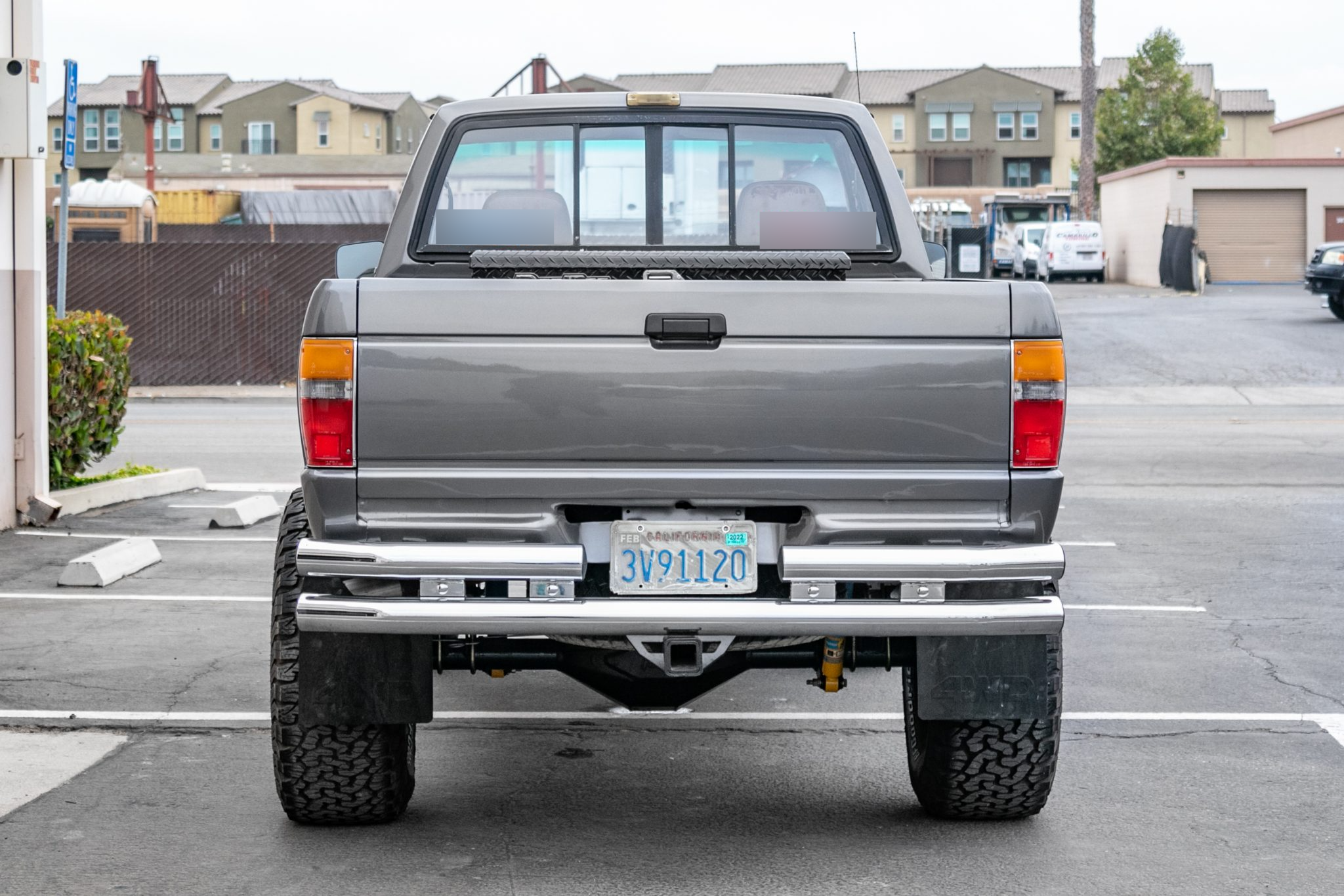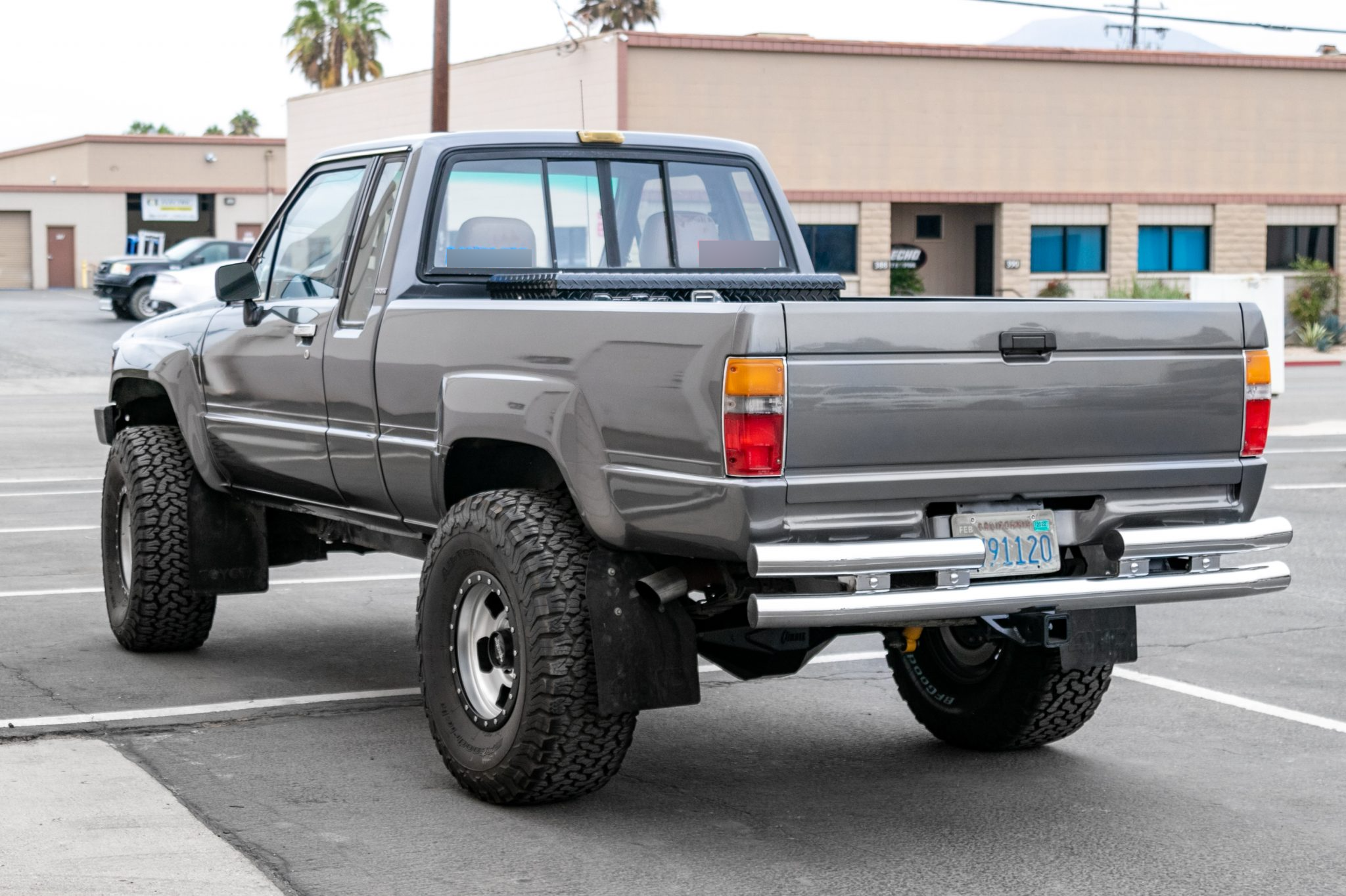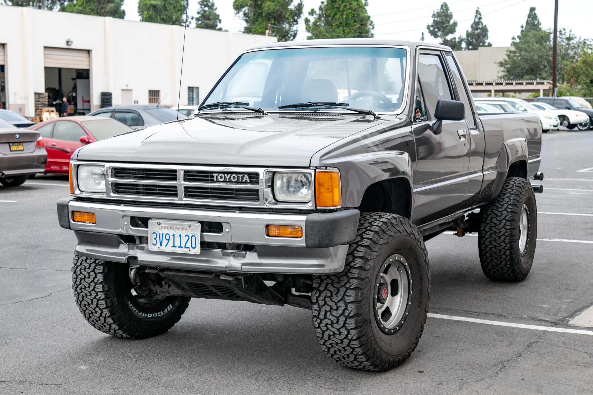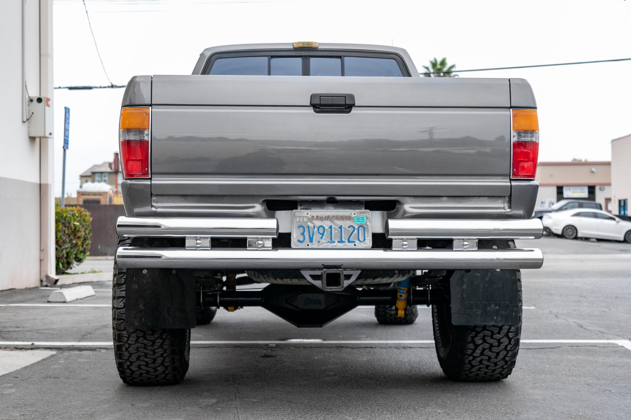 Silver-finished 15″ American Racing wheels are mounted with 33×12.5″ BFGoodrich All-Terrain tires. The front axle is equipped with Aisin manually-locking hubs, and the suspension features Bilstein shocks. The braking system has been modified with installation of a Hydroboost brake booster and Wilwood disc brakes.