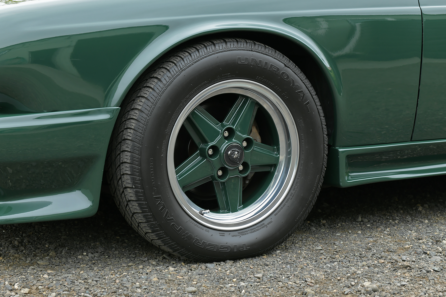 Five-spoke 16″ Ronal wheels feature polished lips, body-color centers, and modified Jaguar hood badges as center caps. The wheels are mounted with 225/60 Uniroyal Tiger Paw tires, and disc brakes are equipped at each corner. The brake booster was reportedly rebuilt in September 2021.