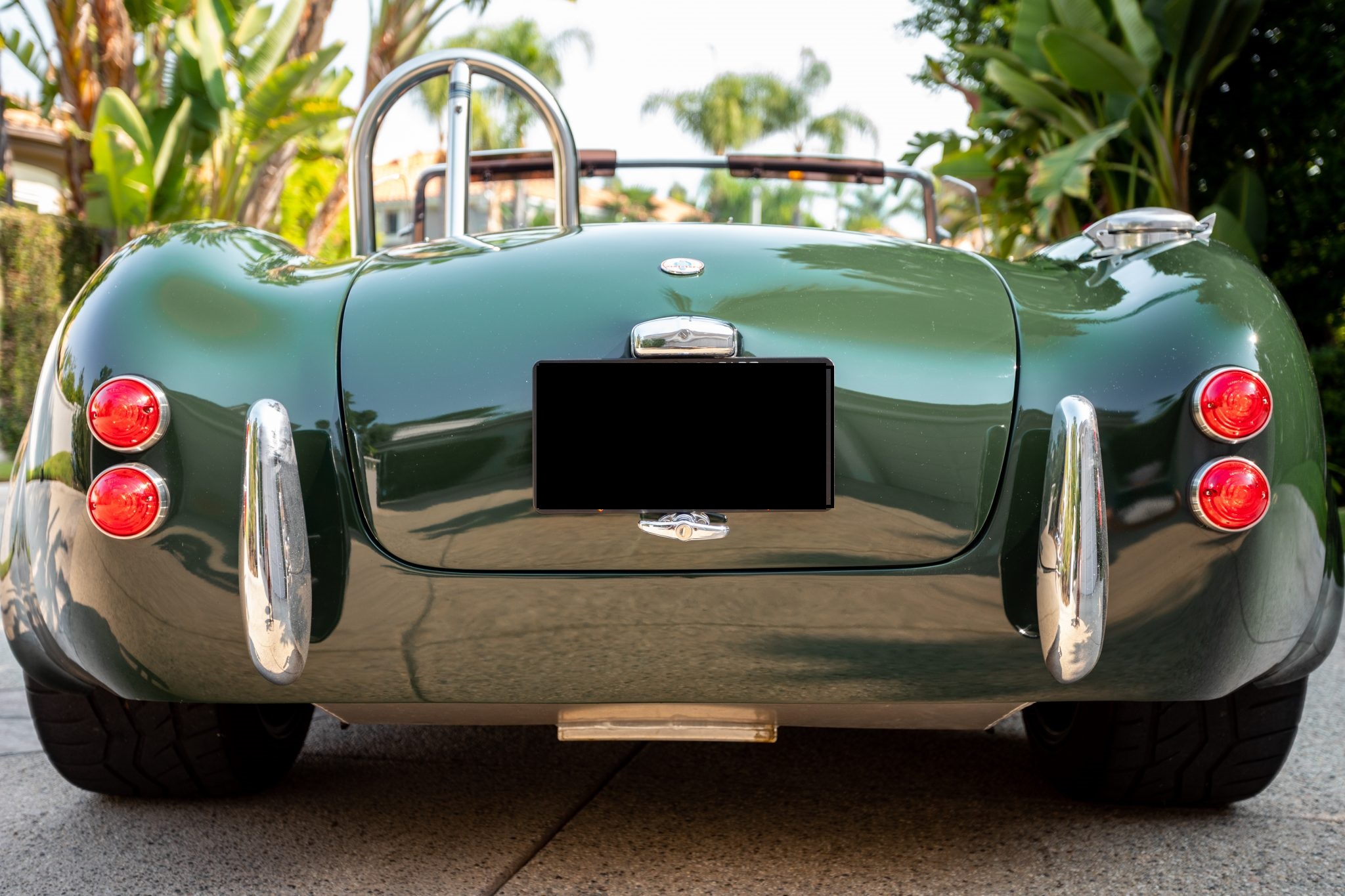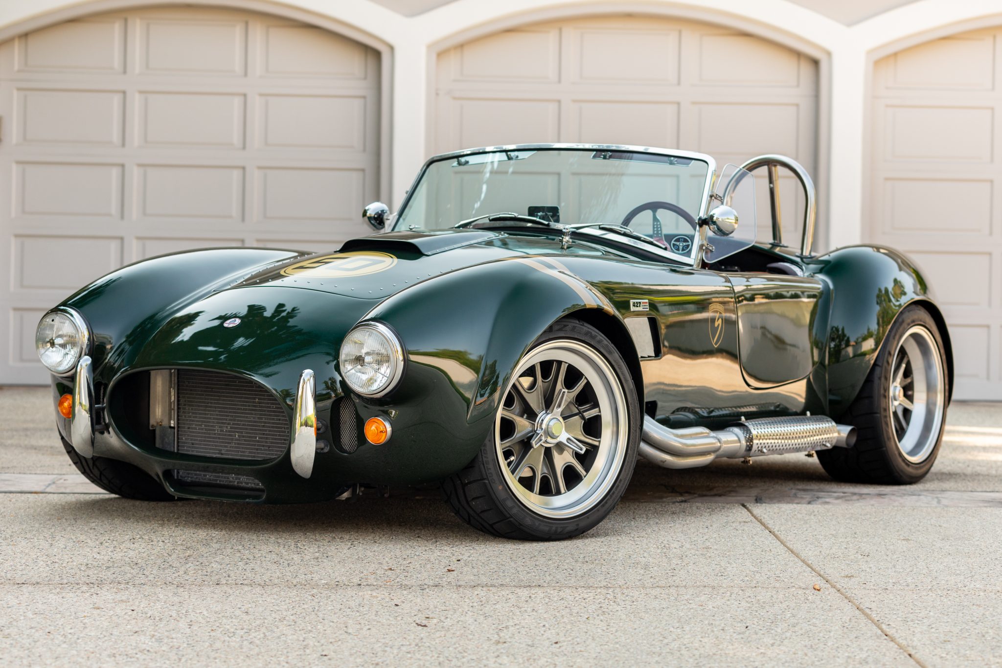 Staggered-width 18″ Halibrand-style wheels with polished lips and three-ear knock-offs wear 245/40 front and 295/40 rear Falken Azenis AT615R tires. Stopping power is from disc brakes at all four corners.