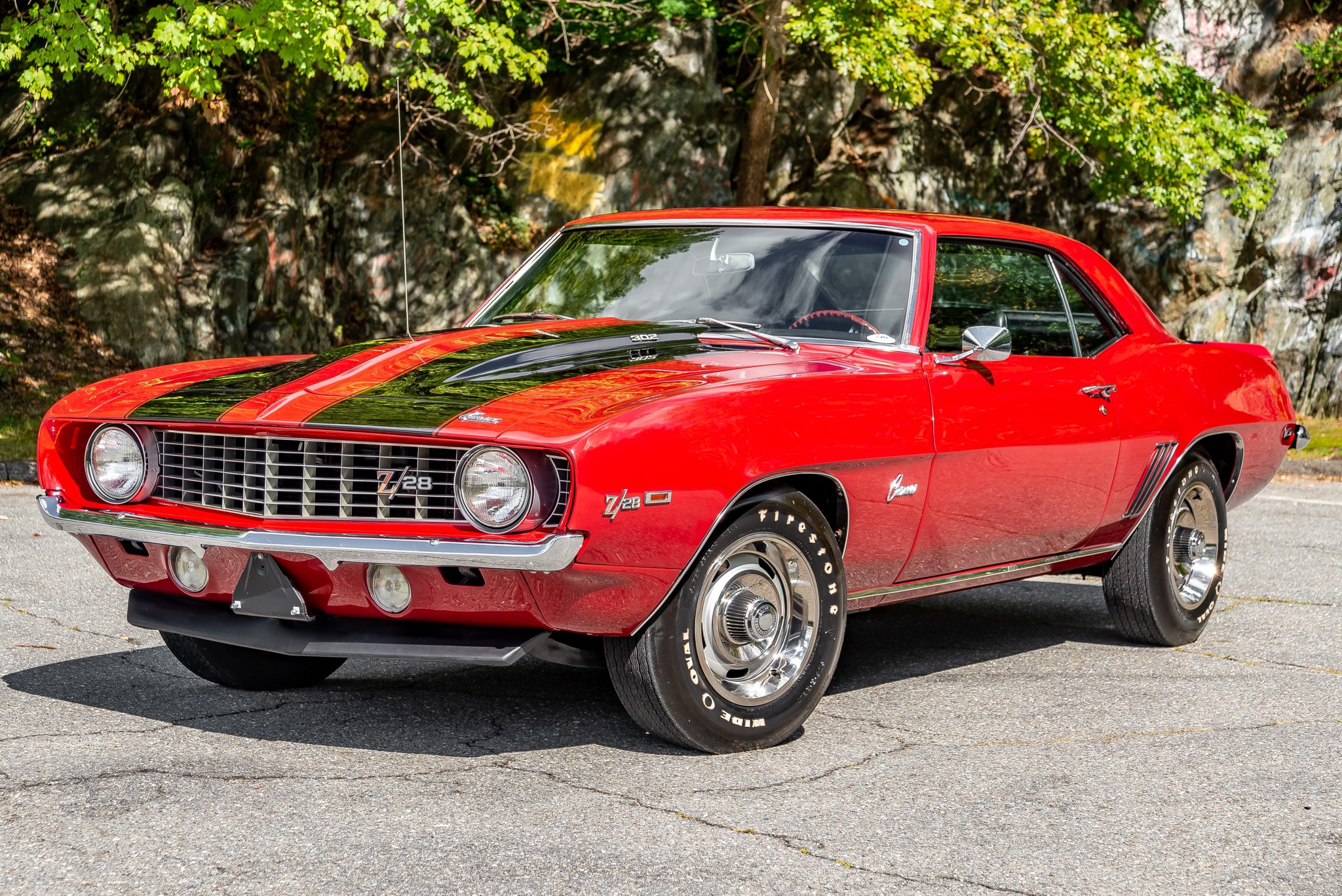 Silver-finished 15″ rally-style wheels with polished trim rings and hub caps are mounted with Firestone Wide Oval F70 tires. Stopping is provided by power-assisted front disc and rear drum brakes, and power steering is fitted.