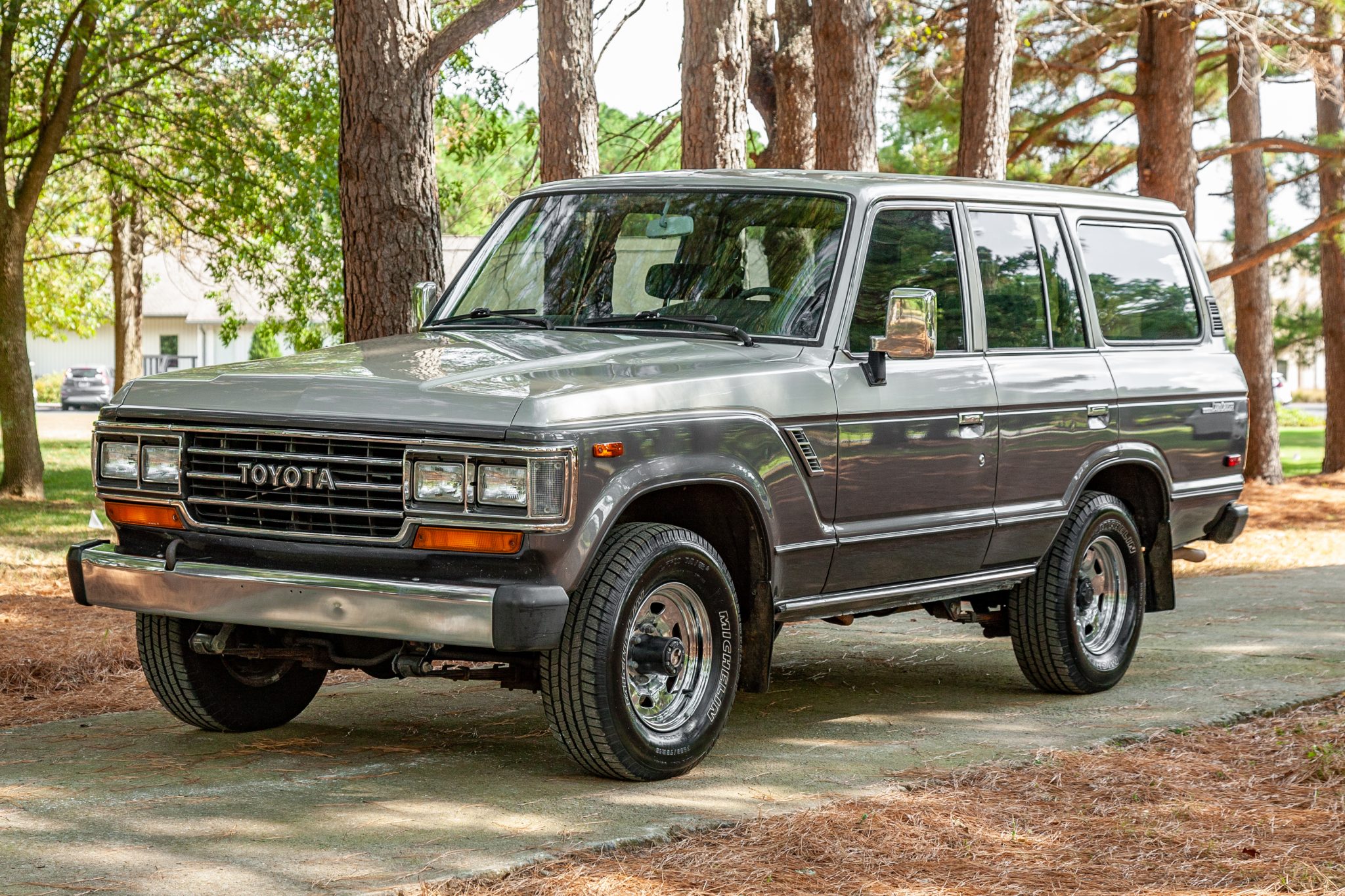 Chrome-finished 15″ steel wheels are mounted with 235/75 Michelin LTX M/S2 tires that show date codes from 2012. Stopping power is provided by power-assisted front discs and rear drums, and the front hubs are Aisin manually locking components.