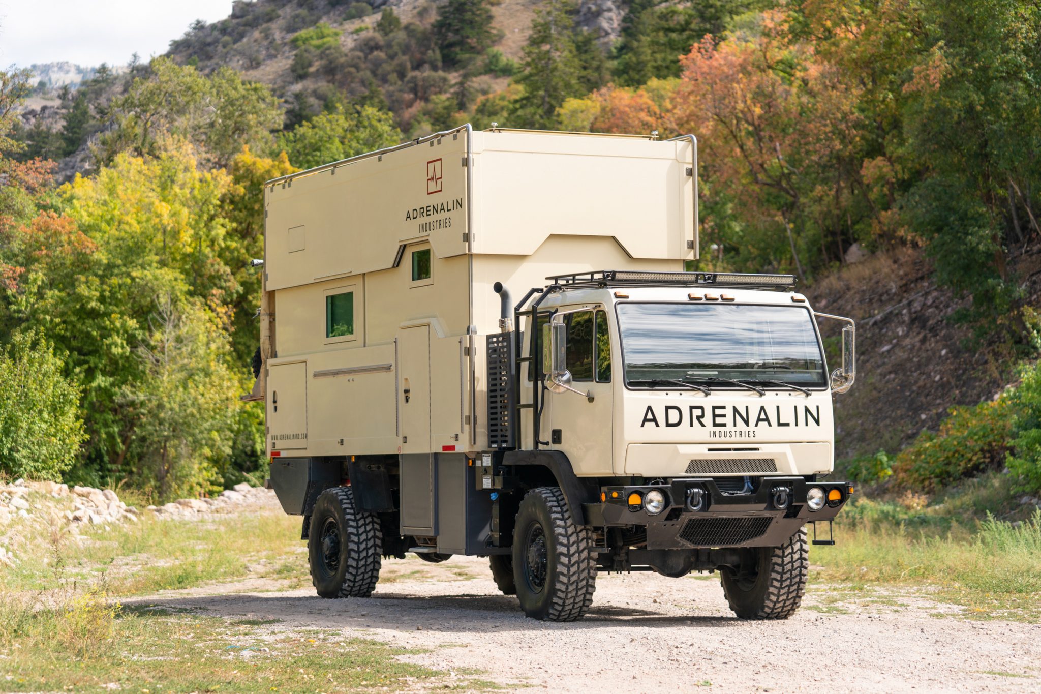 The Action Mobil camper cabin features fiberglass construction, a metal cage, a pneumatic leveling system, and a hydraulically extendable roof that can be seen in its raised position above. When raised, the roof reveals four dual-pane glass windows, and other features include dual sunroofs, roof-mounted solar panels, external storage doors, an exterior shower connection, and a pivoting rear bumper that can be raised to increase the maximum departure angle. The seller notes a dent on the upper camper cabin cage.