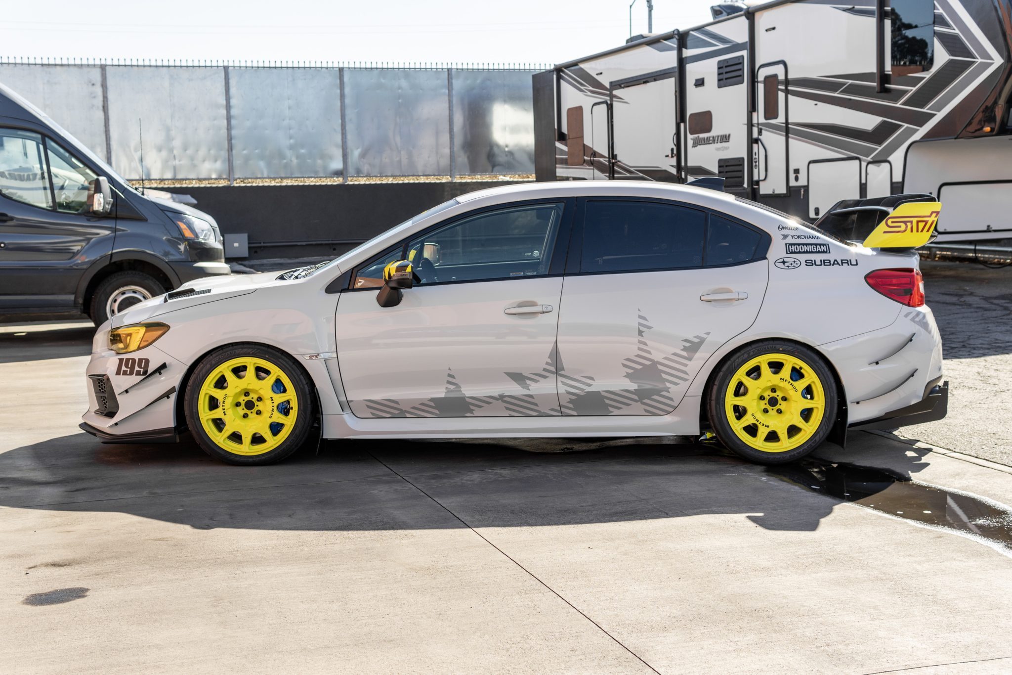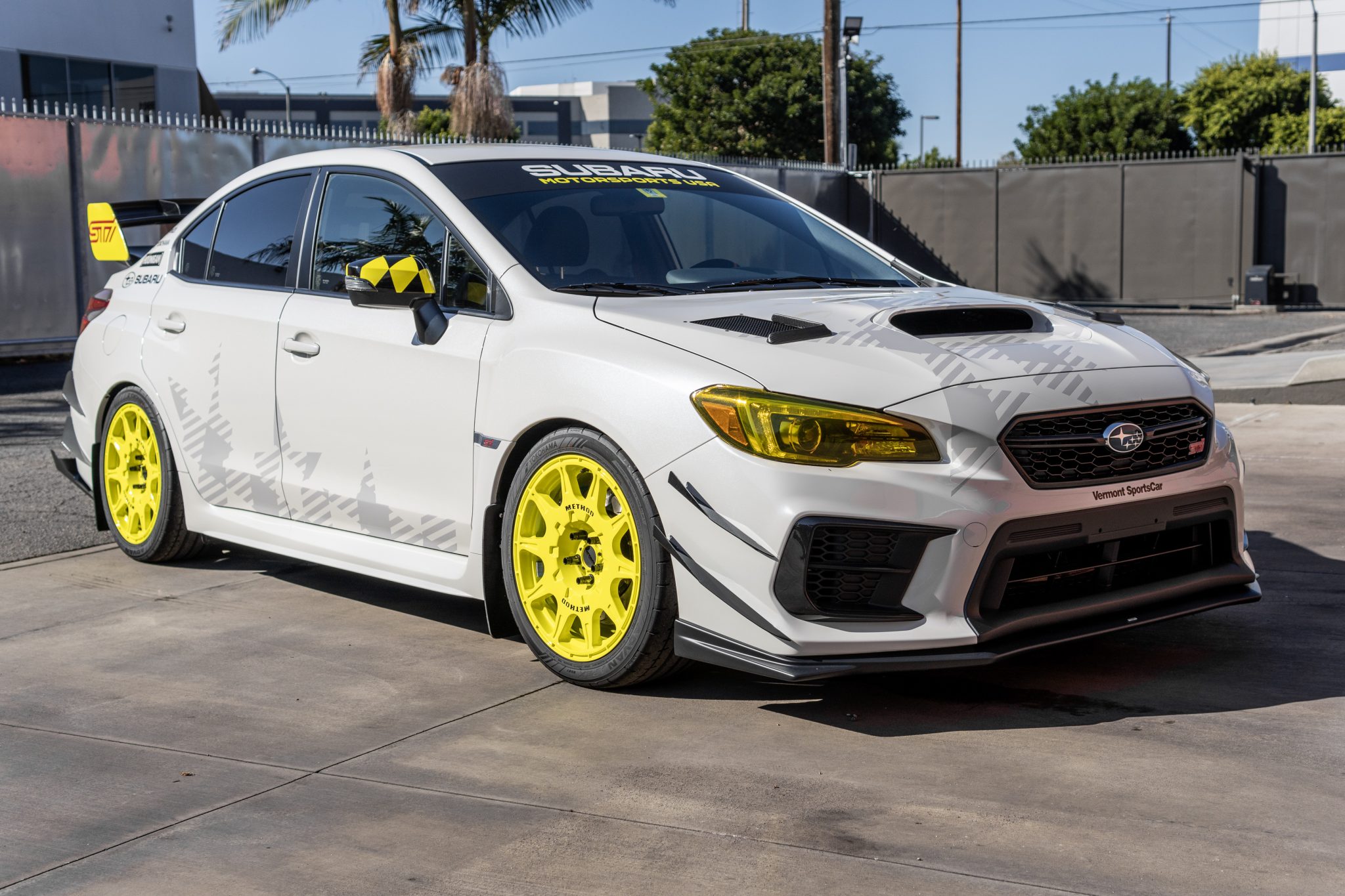 Yellow Method 502 Rally wheels wear 245/40R18 Yokohama Advan Apex V601 tires with 2019 date codes. The braking system features blue six-piston STi calipers with two-piece slotted rotors up front along with stainless steel lines all around. Suspension modifications include Reiger competition coilovers, 26mm front and rear adjustable sway bars with rear chassis reinforcement, and a front roll-center adjustment kit.