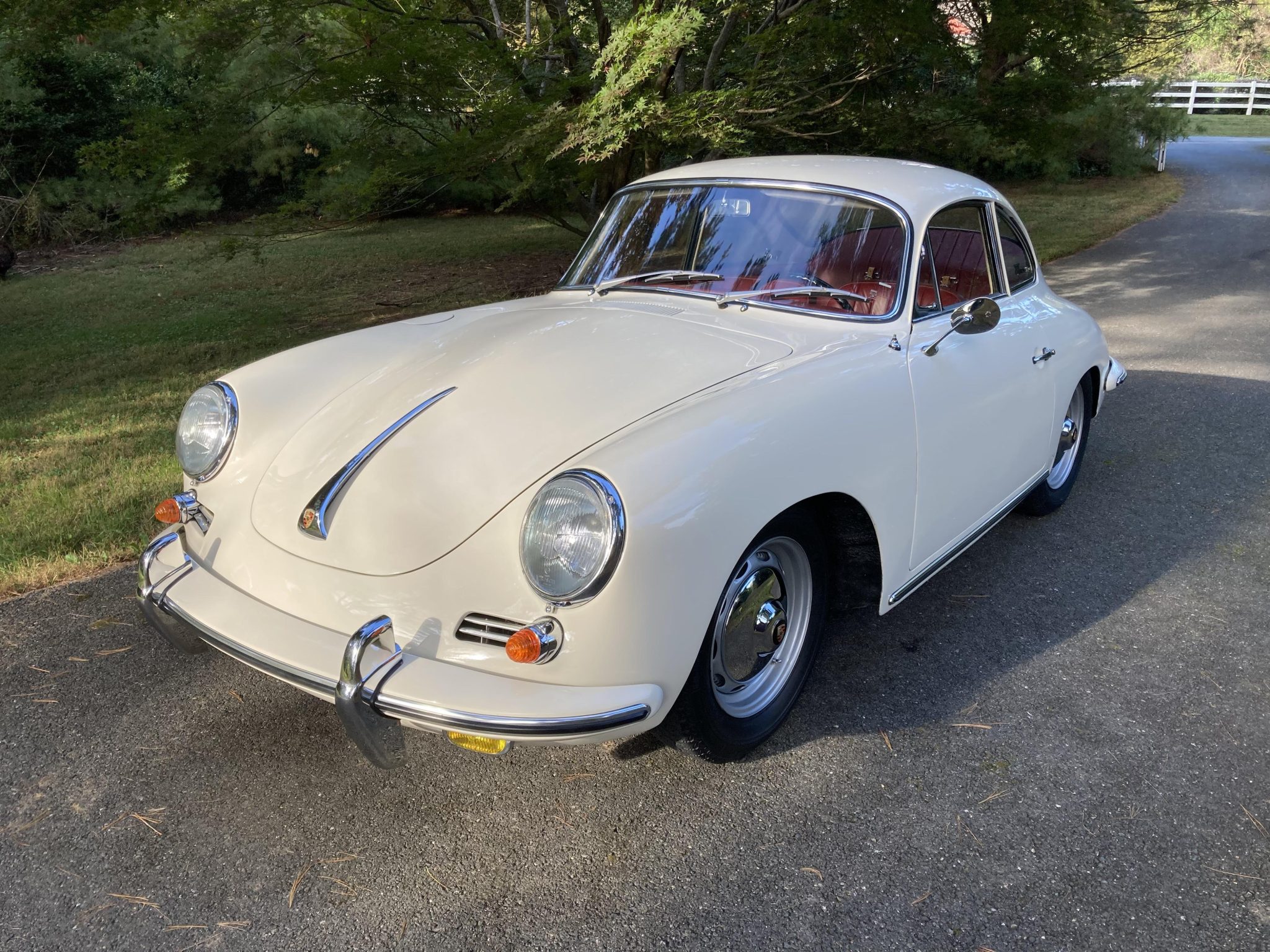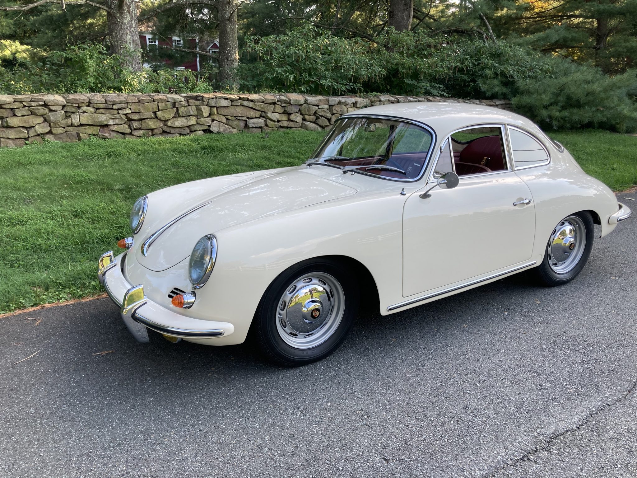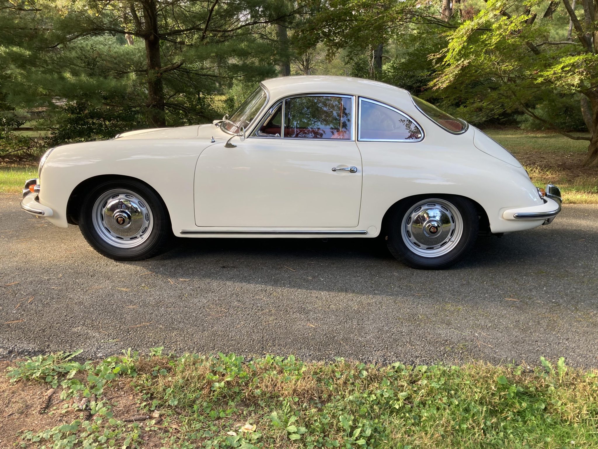 Painted 15″ steel wheels with Porsche-branded chrome hubcaps are mounted with Michelin XZX tires, and a matching spare wheel is stored in the front trunk. Koni shock absorbers are fitted. The seller states that while being trailered, the trailer and car were involved in a collision with another vehicle while entering a parking lot, and subsequent repairs included the replacement of the rear axle, right-rear wheel, and brake assembly.