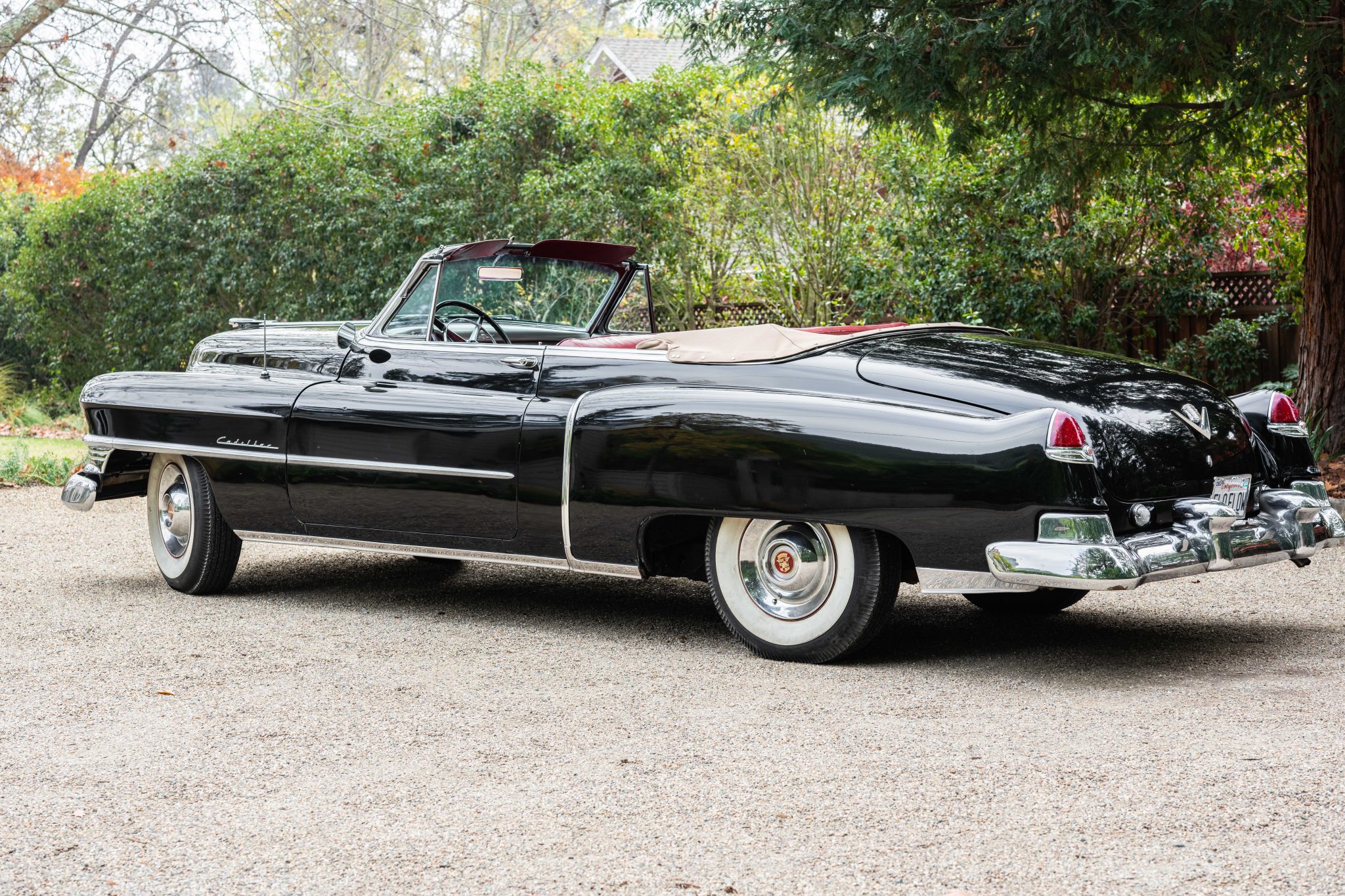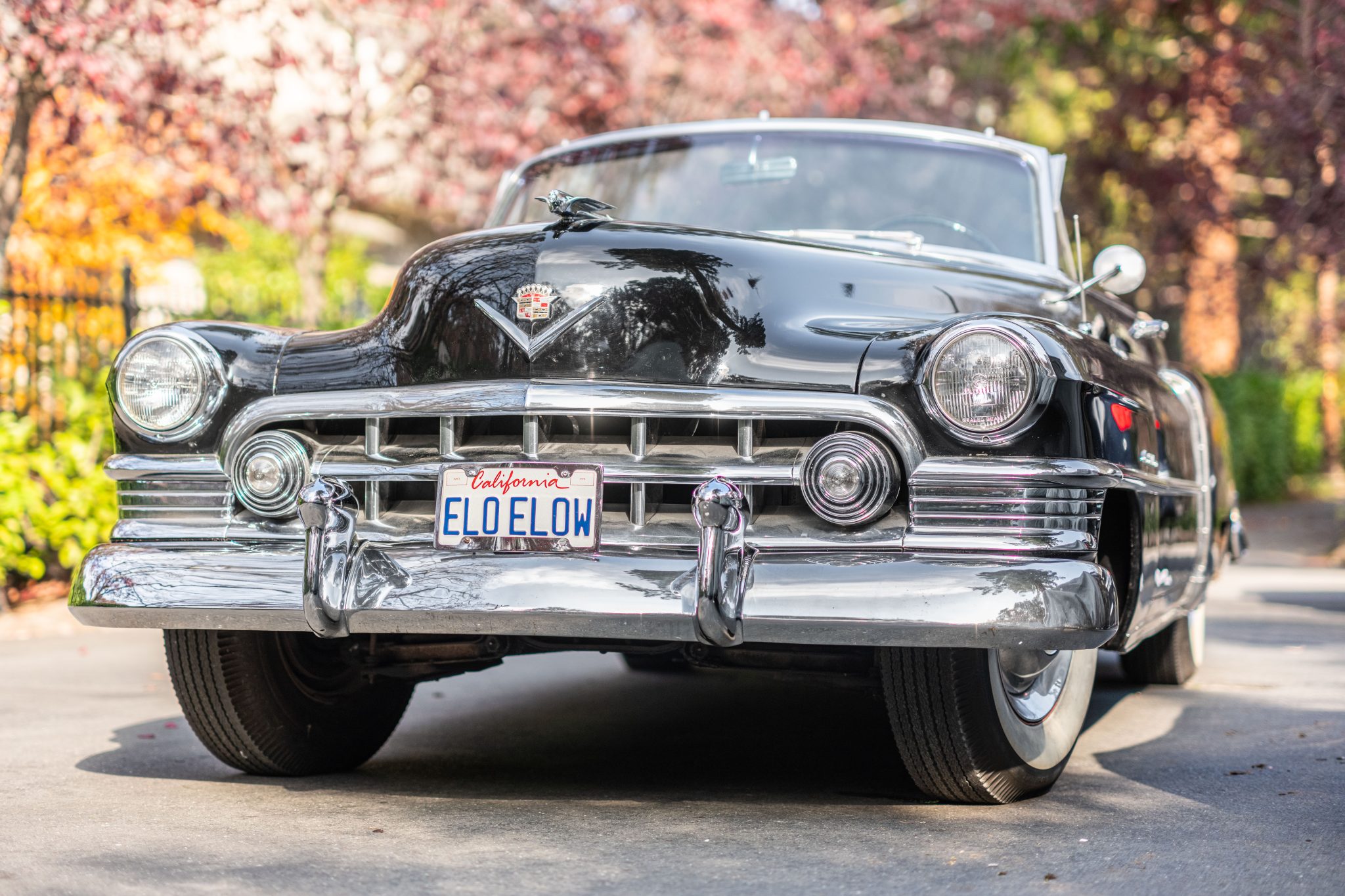 The red-painted steel wheels wear full chrome covers and are mounted with 8.20-15 BFGoodrich Silvertown bias-ply whitewall tires. A matching spare wheel and tire with a baby moon hubcap are mounted in the trunk. Stopping power is provided by hydraulic drums at all four corners.