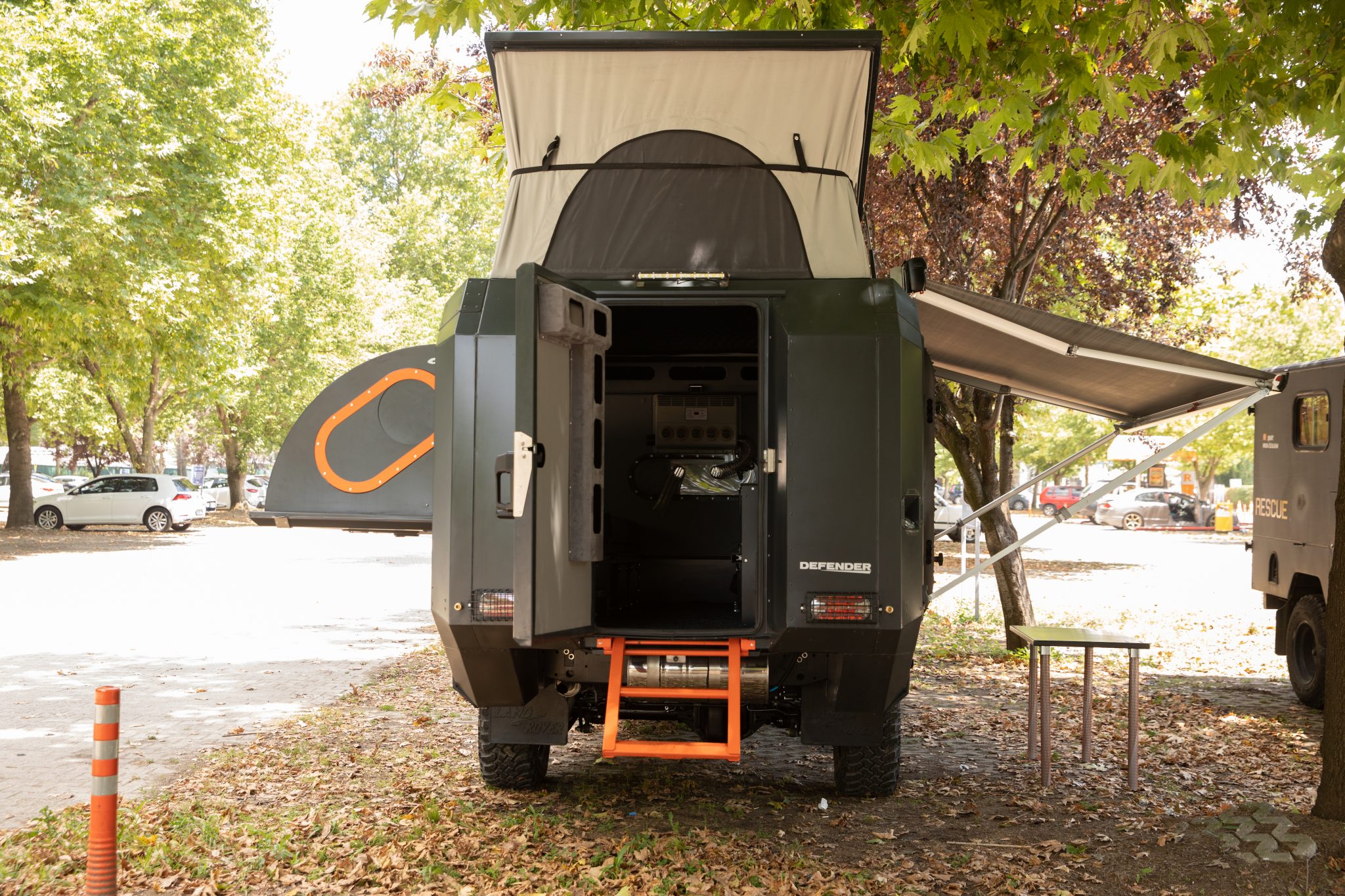 The custom-built aluminum camper shell features a pop top, an extending side panel, a retractable awning, and a ladder that stows away beneath. Recovery tracks are mounted to a side panel that opens to reveal a mini fridge, faucet, stove, and eight-gallon water tank. Solar panels and a generator support two lithium batteries.