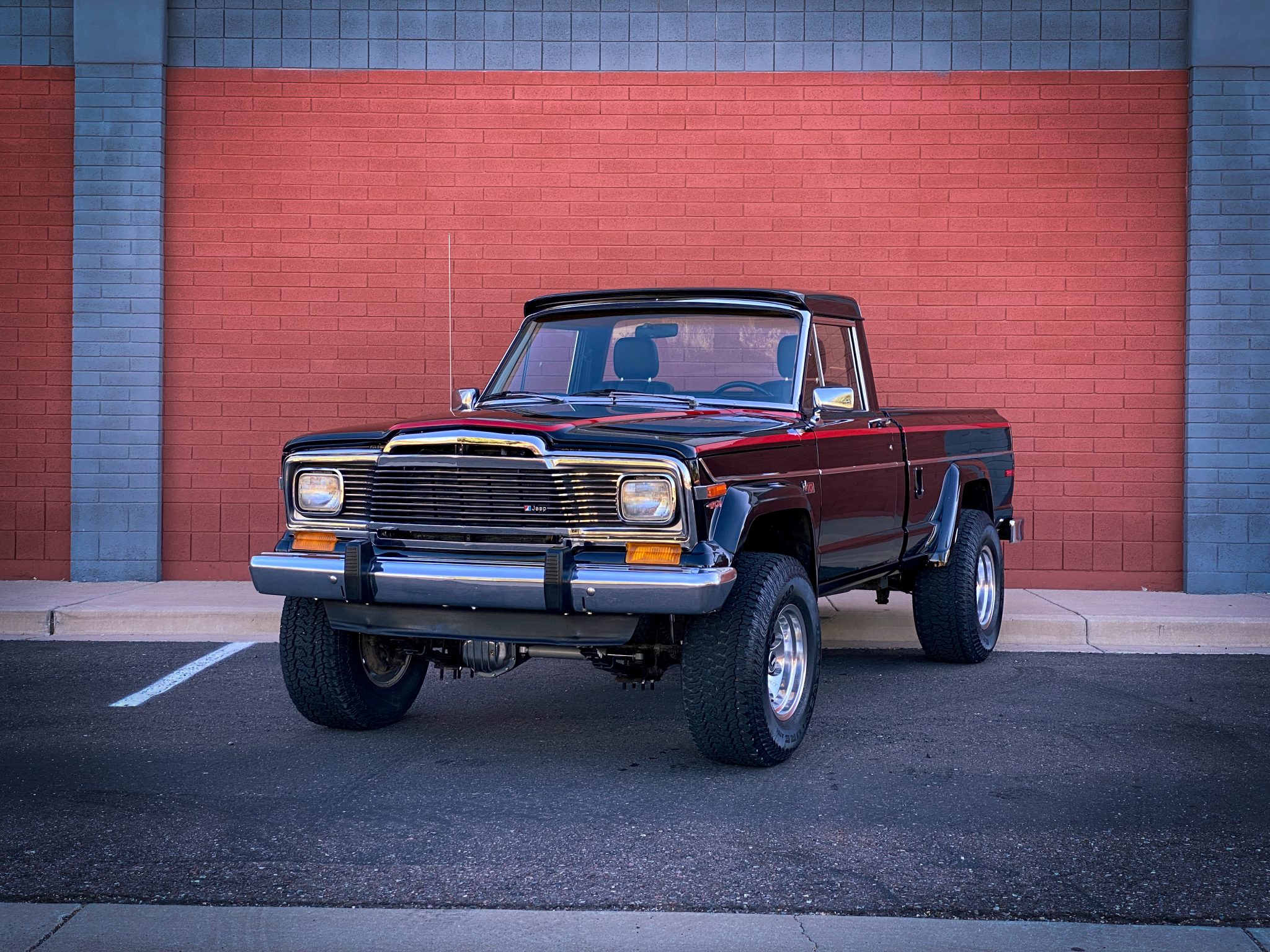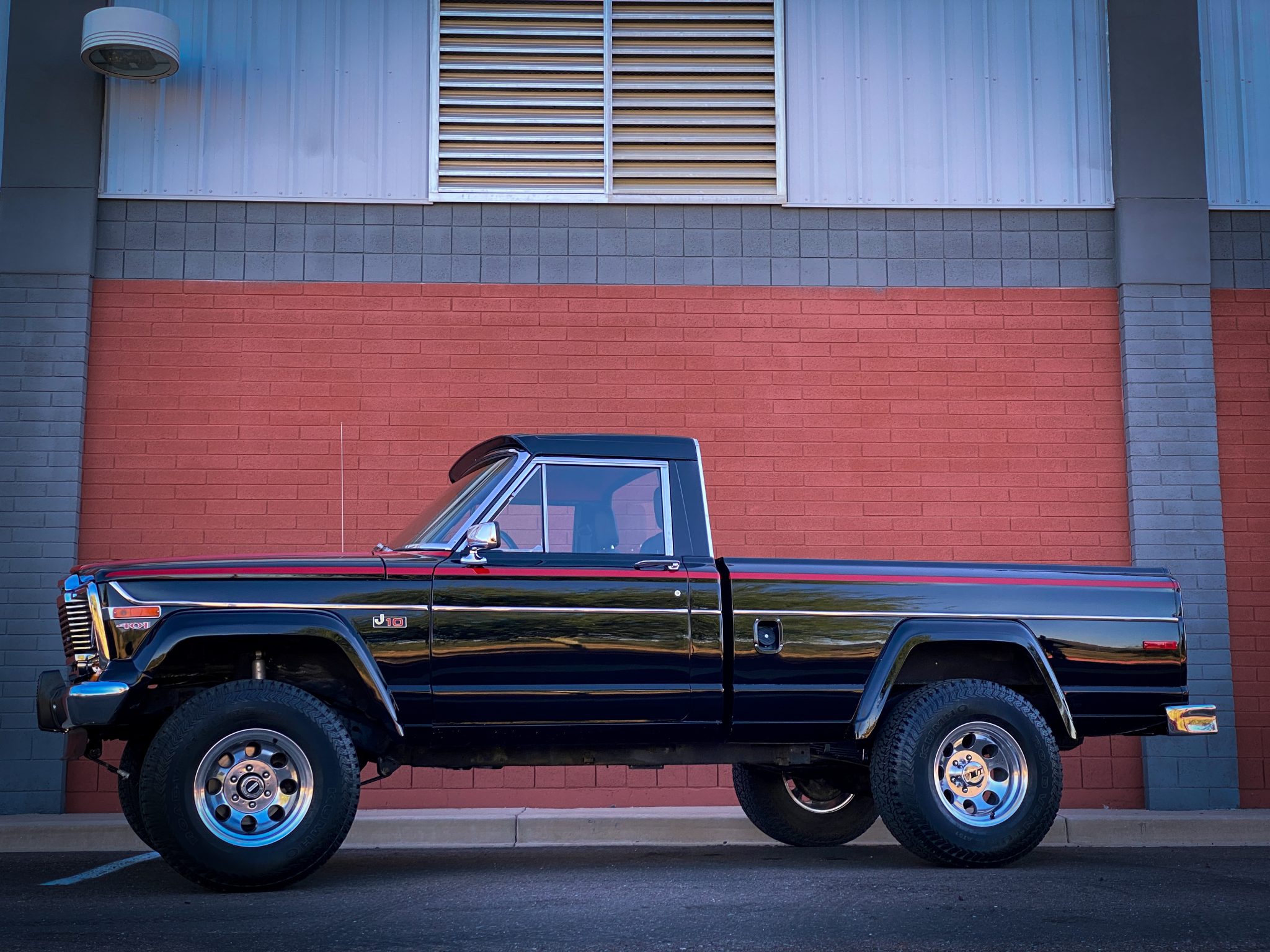 The seller has installed a 3″ lift kit with shock absorbers from Rough Country along with 16″ Mickey Thompson Classic III wheels wearing 12.5×33″ Kumho all-terrain tires. A spare wagon wheel is located under the bed. Manually-locking Warn hubs are equipped up front. Braking is handled by power-assisted front discs and rear drums. The brake master cylinder was replaced and the system flushed under current ownership.