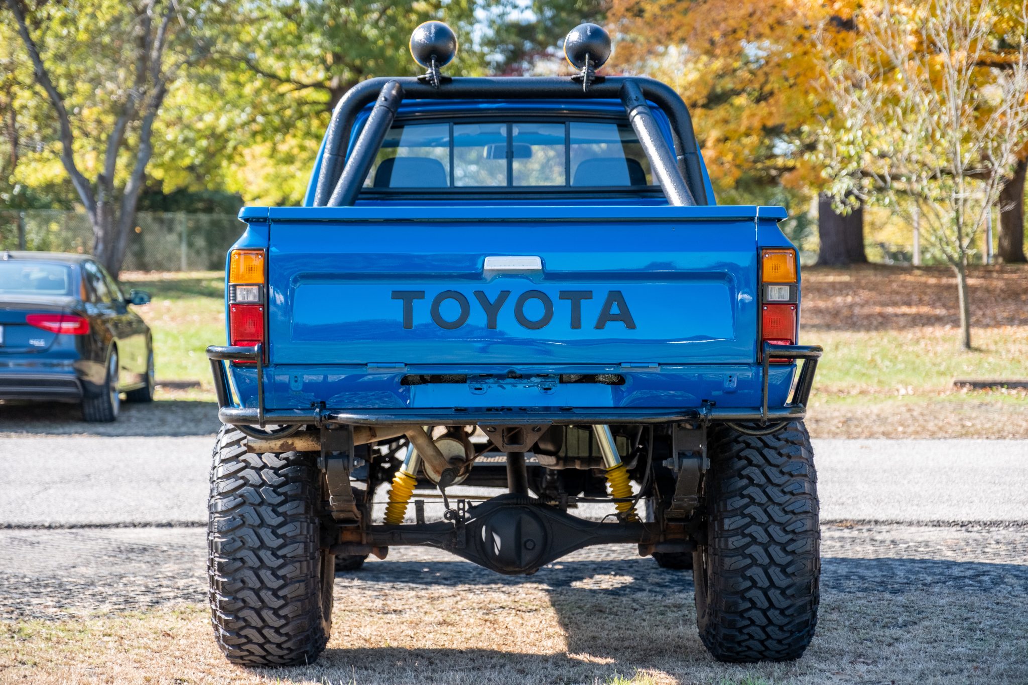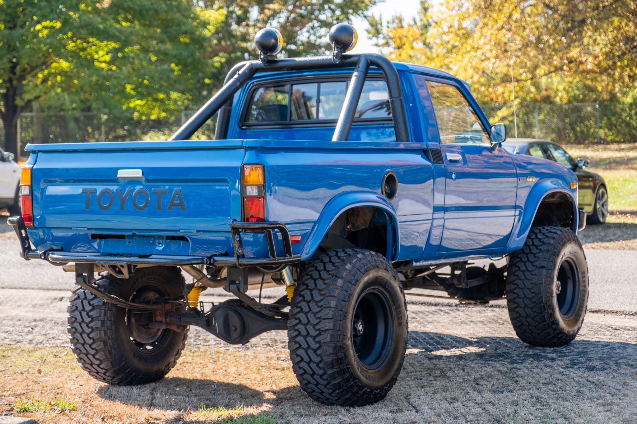 Rebel Racing 15″ steel wheels are fitted over manually locking front hubs and mounted with 33×12.5″ Centennial Dirt Commander M/T tires. Braking is from front discs and rear drums, and a suspension lift has been fitted along with Bilstein shock absorbers at all corners.
